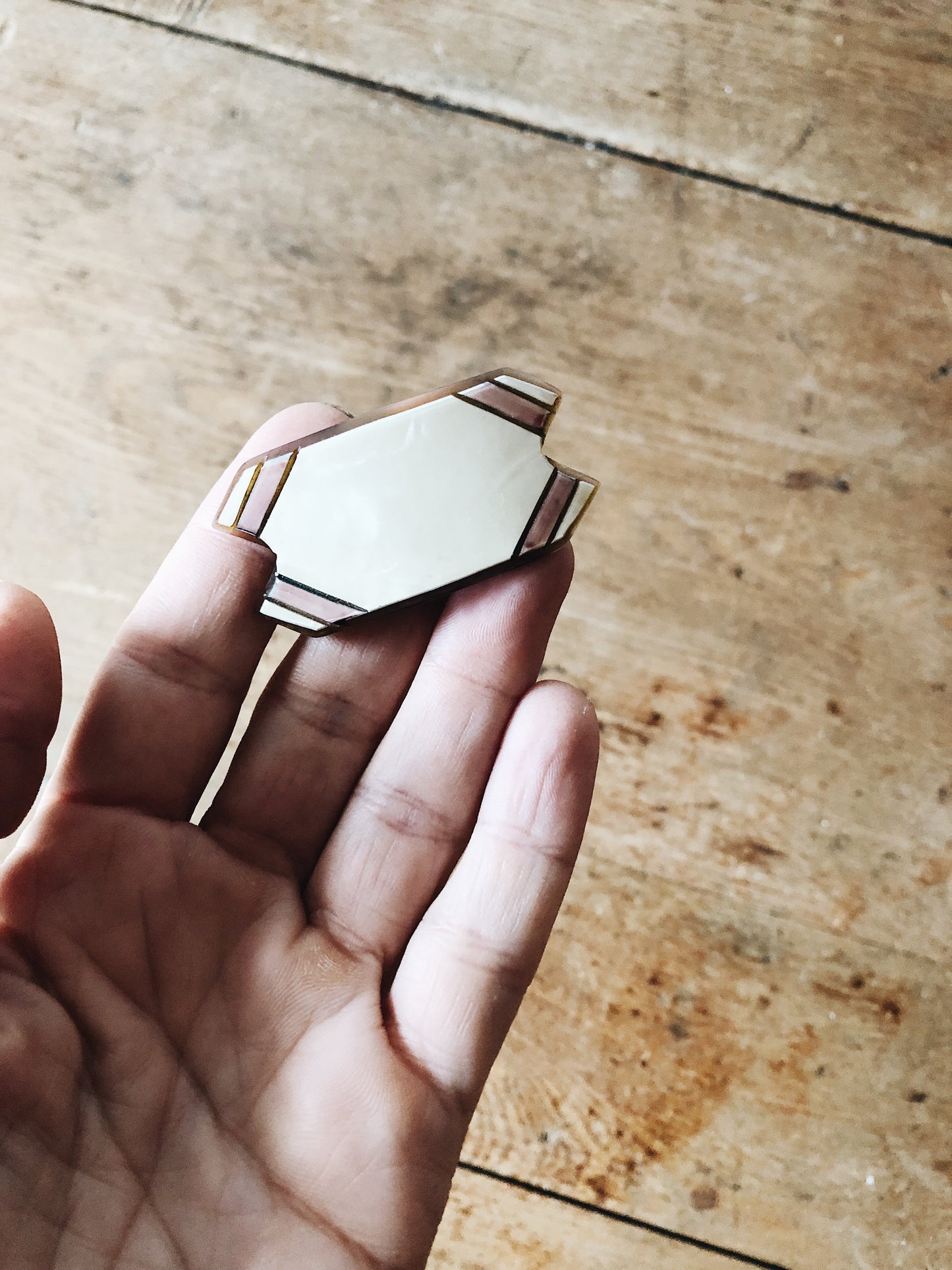 Vintage Art Deco Mother of pearl lucite brooch or pin with great geo pattern.