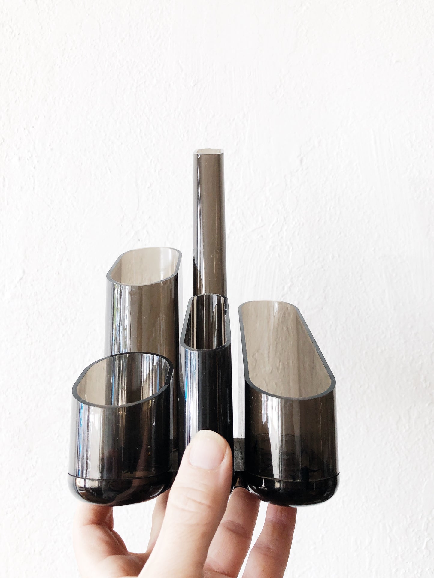 Charcoal lucite desk organizer. Mod shape and style. Average wear