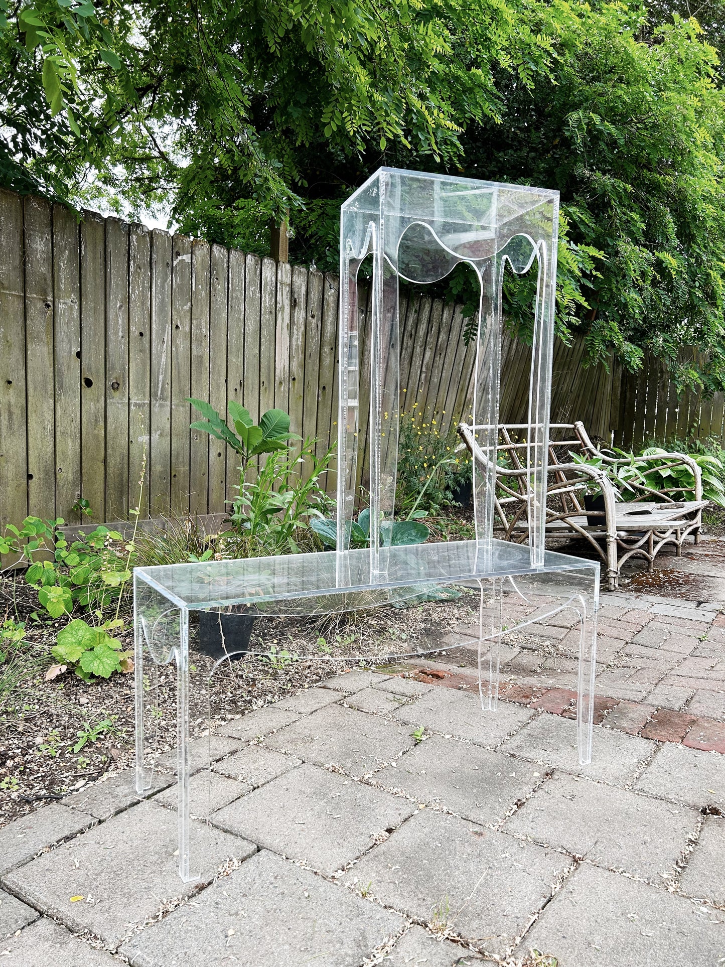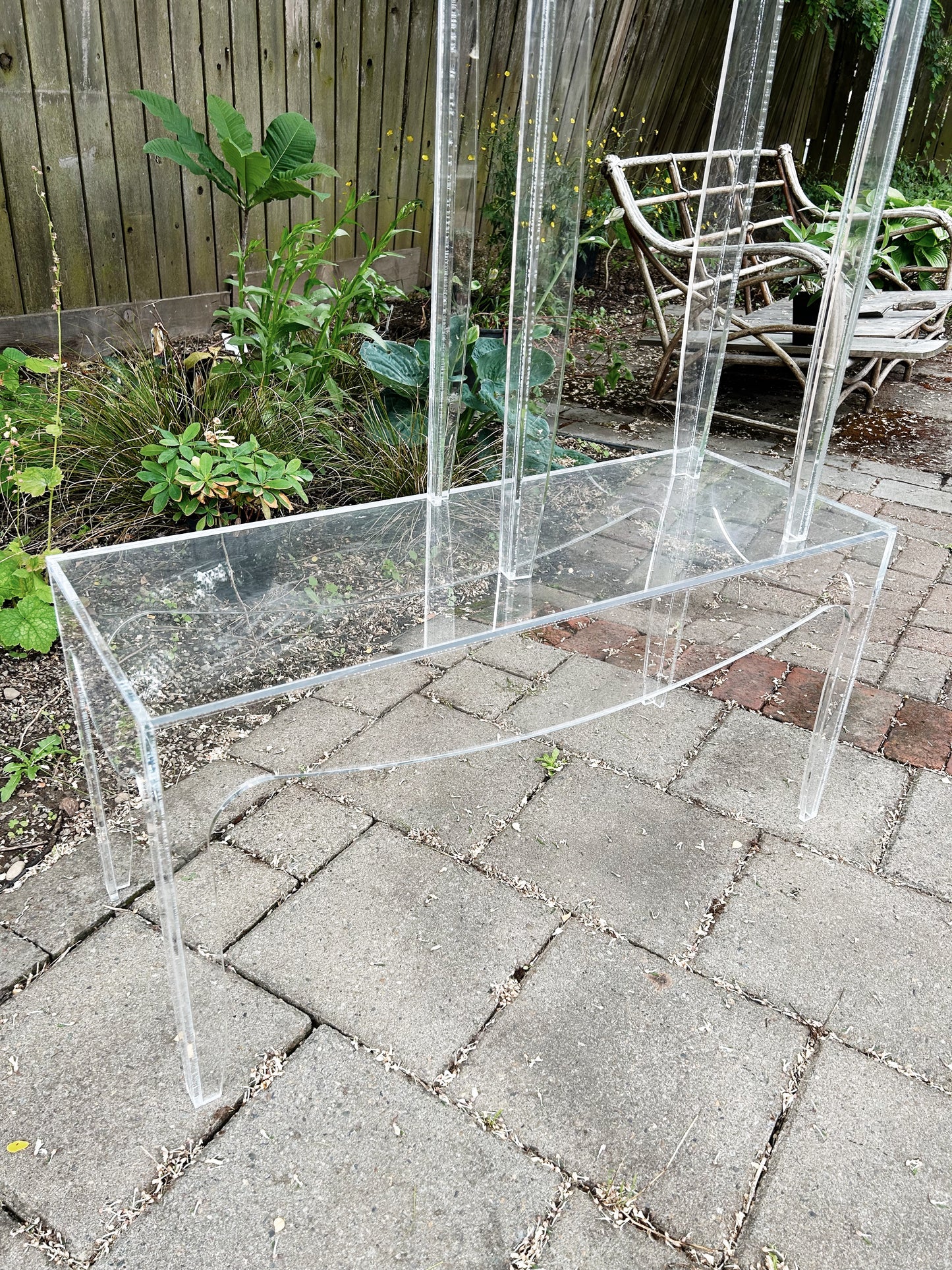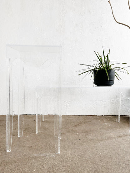 Fabulous chunky lucite tables, sold separately or discounted for the pair. Tall occasional table is perfect in the entry or as a plant stand, end table etc. Long and low makes a great narrow coffee table or window bench with plants, books, lamp etc.