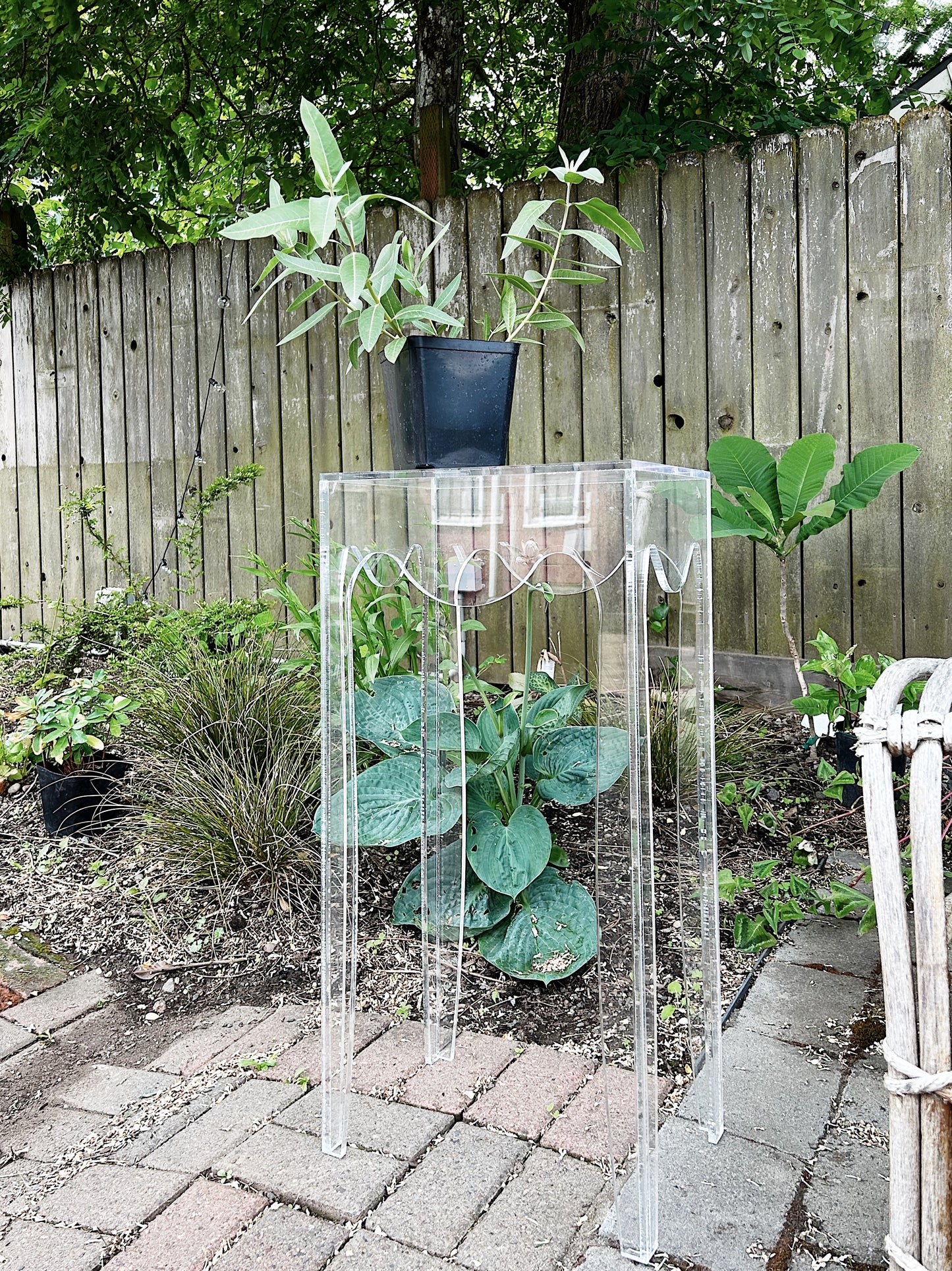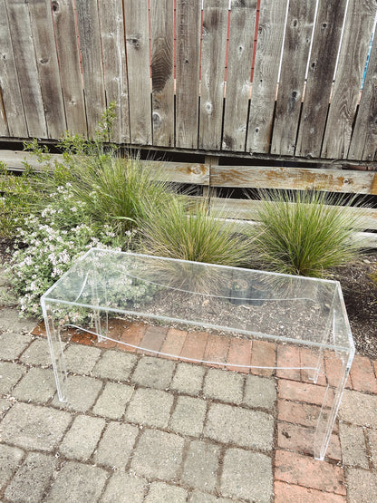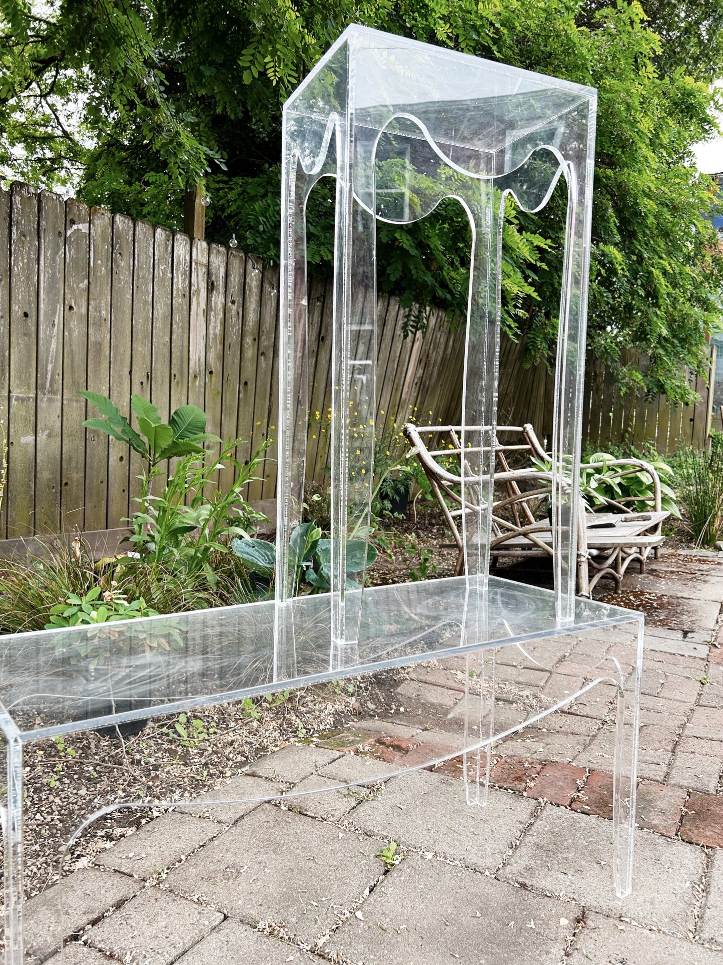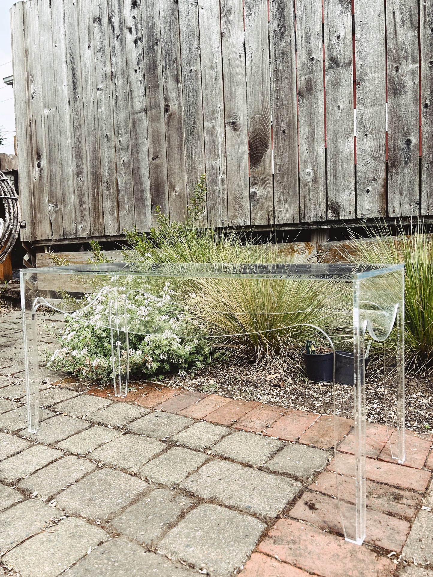 Fabulous chunky lucite tables, sold separately or discounted for the pair. Tall occasional table is perfect in the entry or as a plant stand, end table etc. Long and low makes a great narrow coffee table or window bench with plants, books, lamp etc.