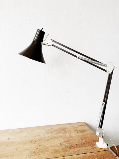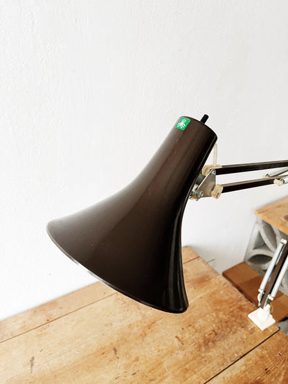 Mid century Luxo enameled task lamp in chocolate brown. Graceful flared shade. Anglepoise style with nice tight joints. Table clamp allows for multiple positions.