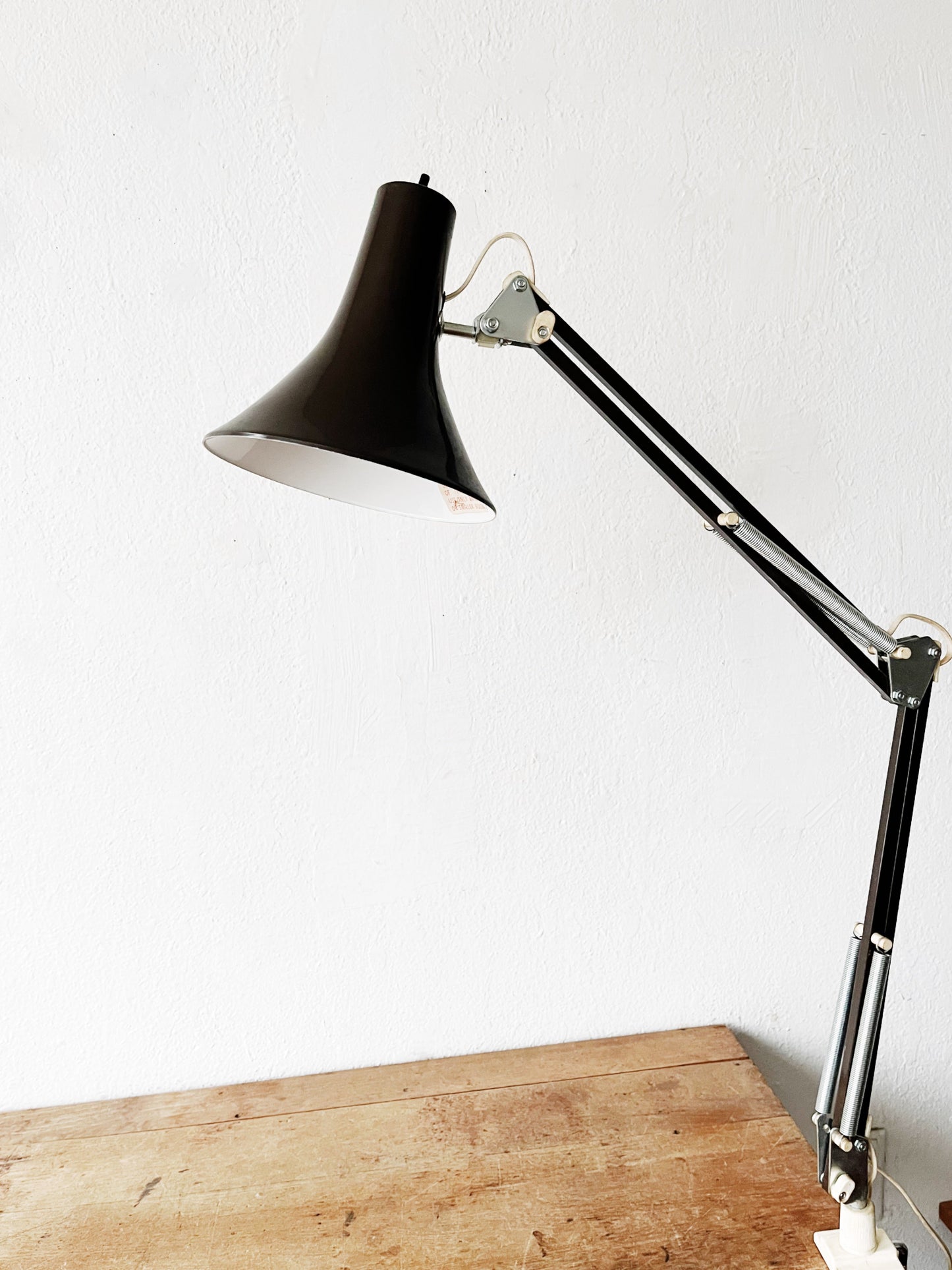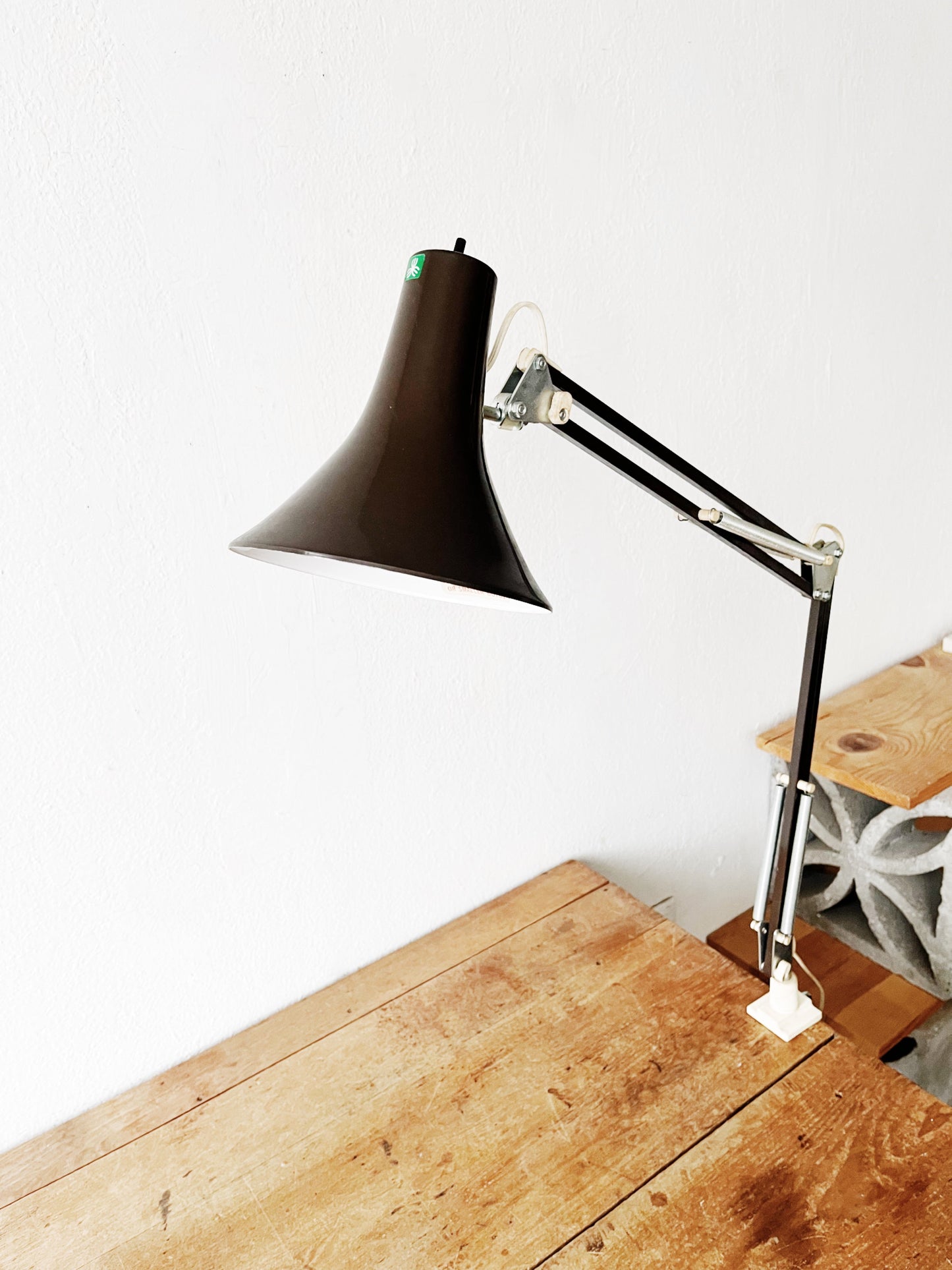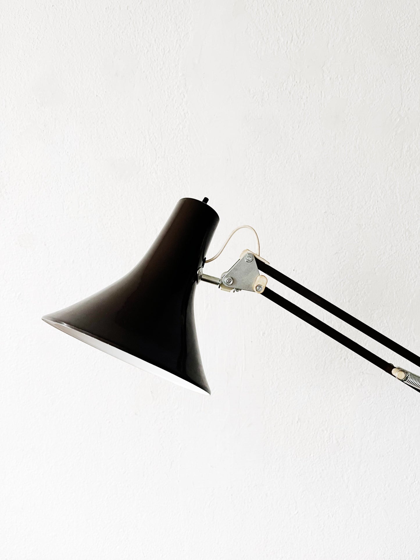 Mid century Luxo enameled task lamp in chocolate brown. Graceful flared shade. Anglepoise style with nice tight joints. Table clamp allows for multiple positions.