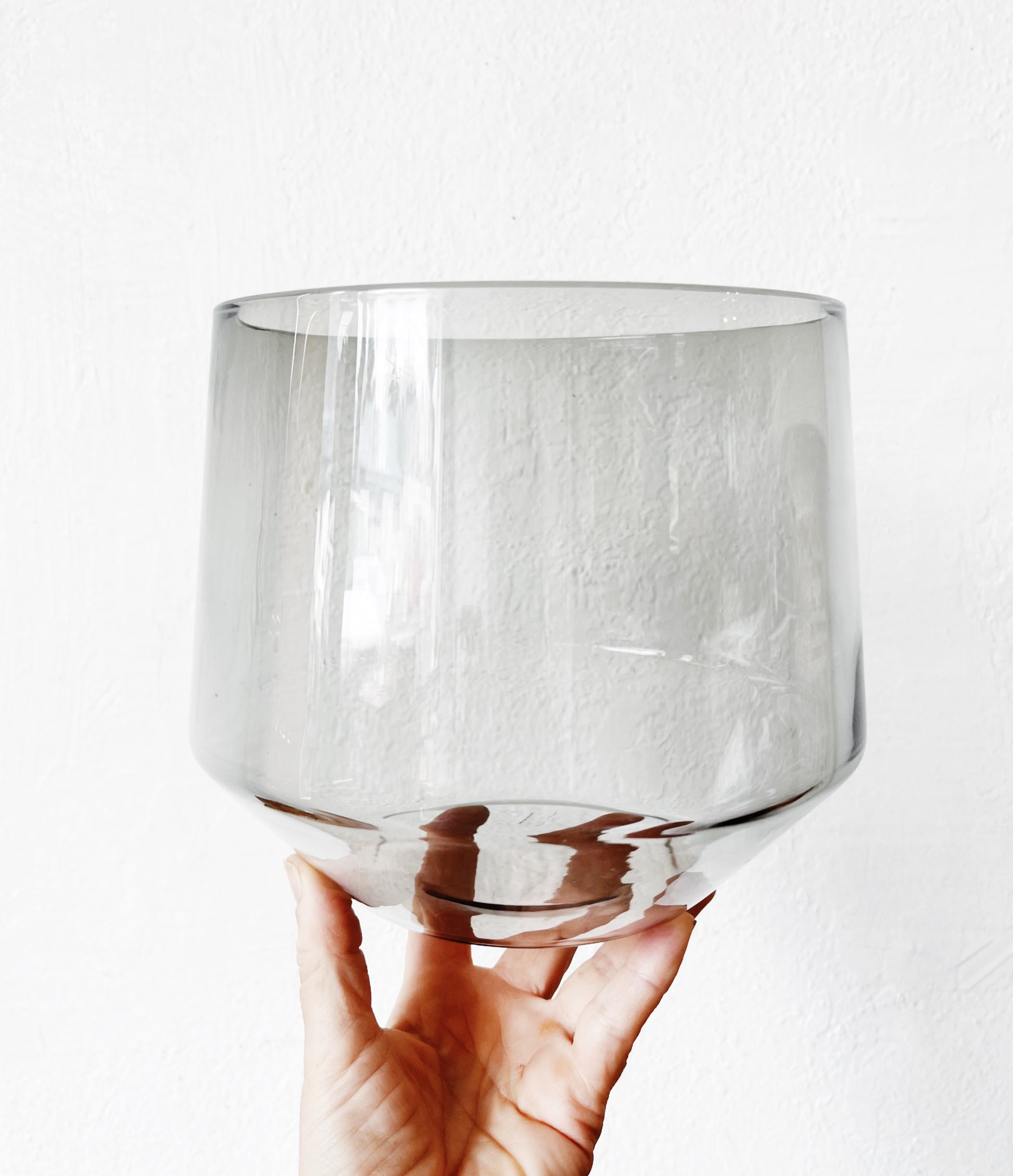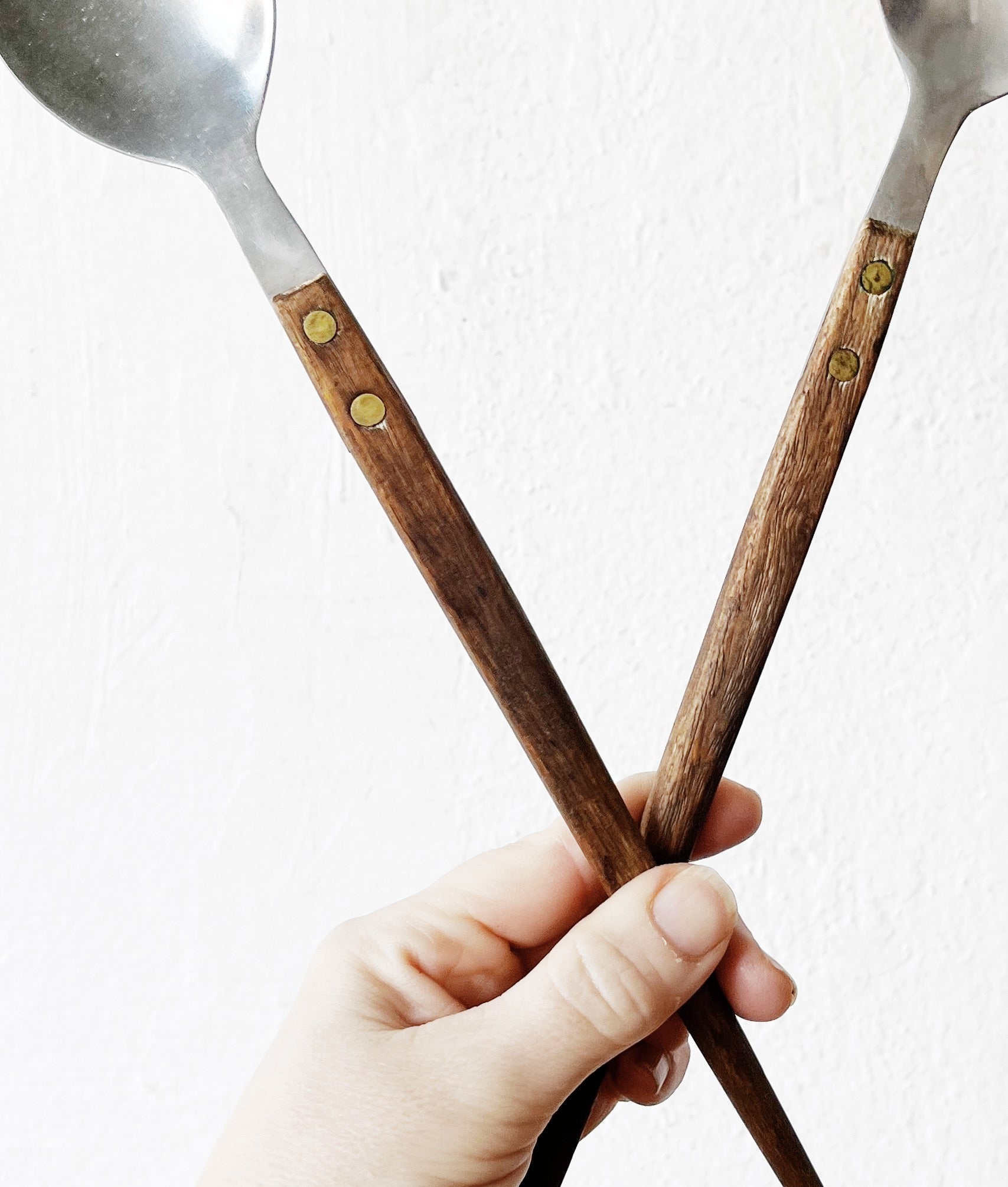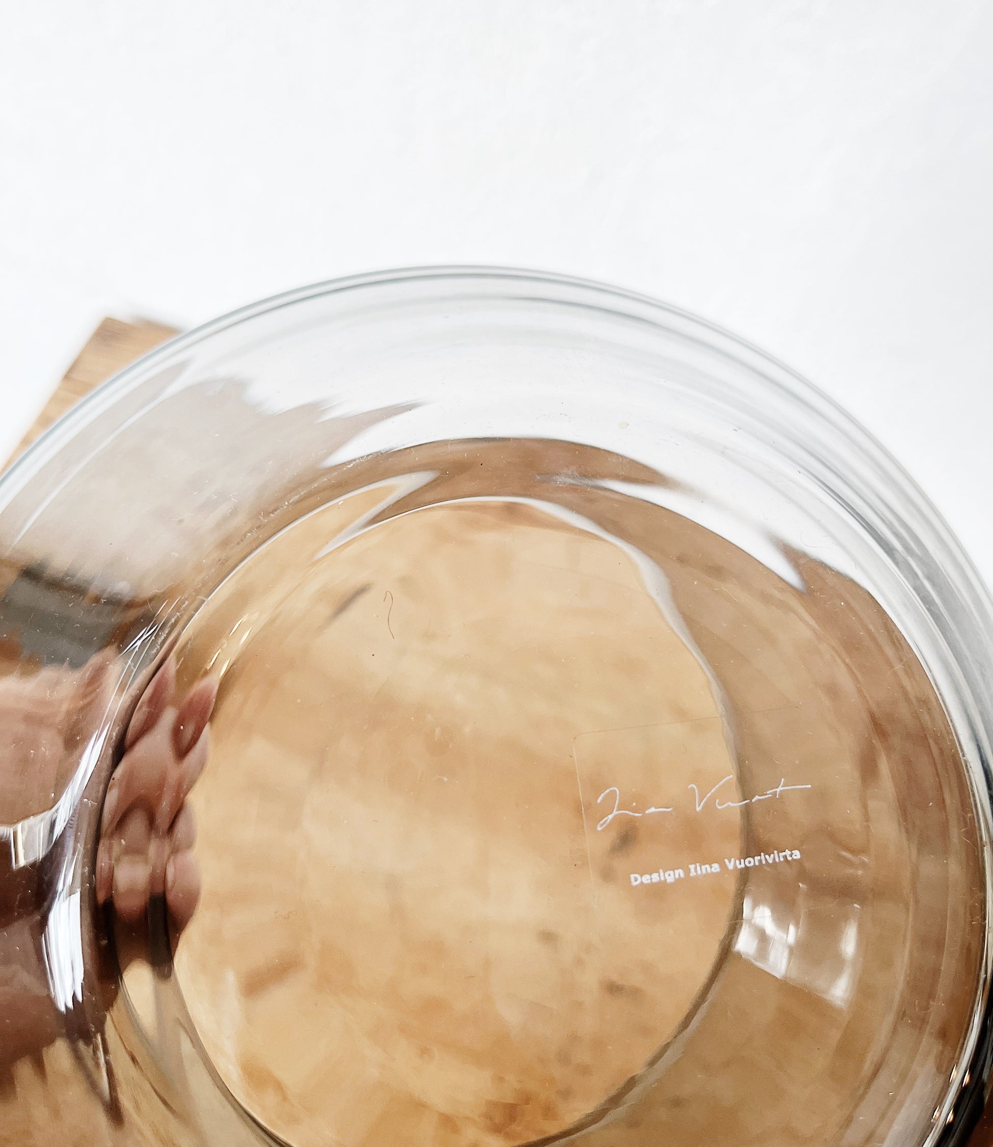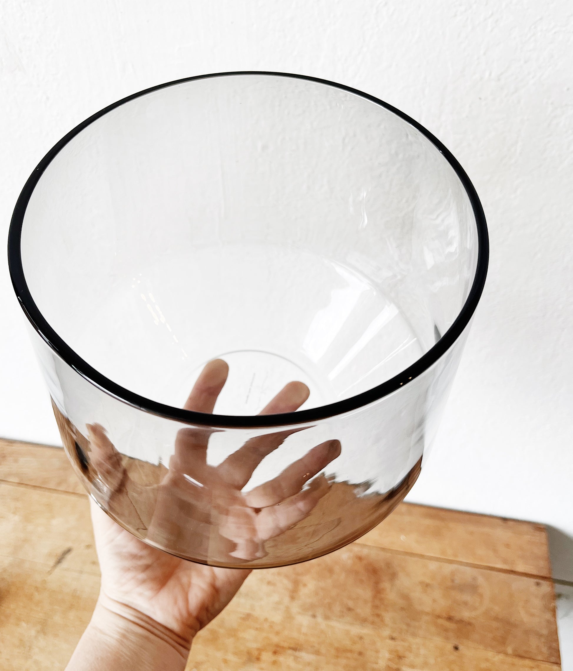 Discontinued Lina Vourivirta blown smoked glass bowl with a wonderful shape. Comes with vintage teak wood Japanese salad servers. Stainless steel and Brass rivets. Sleek and slender