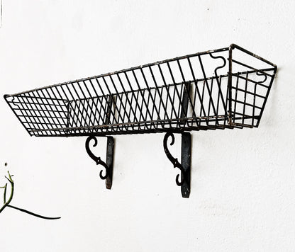 This is a great piece. Solid iron basket shelf with flat bottom and attached brackets. Utilitarian - great for plants especially