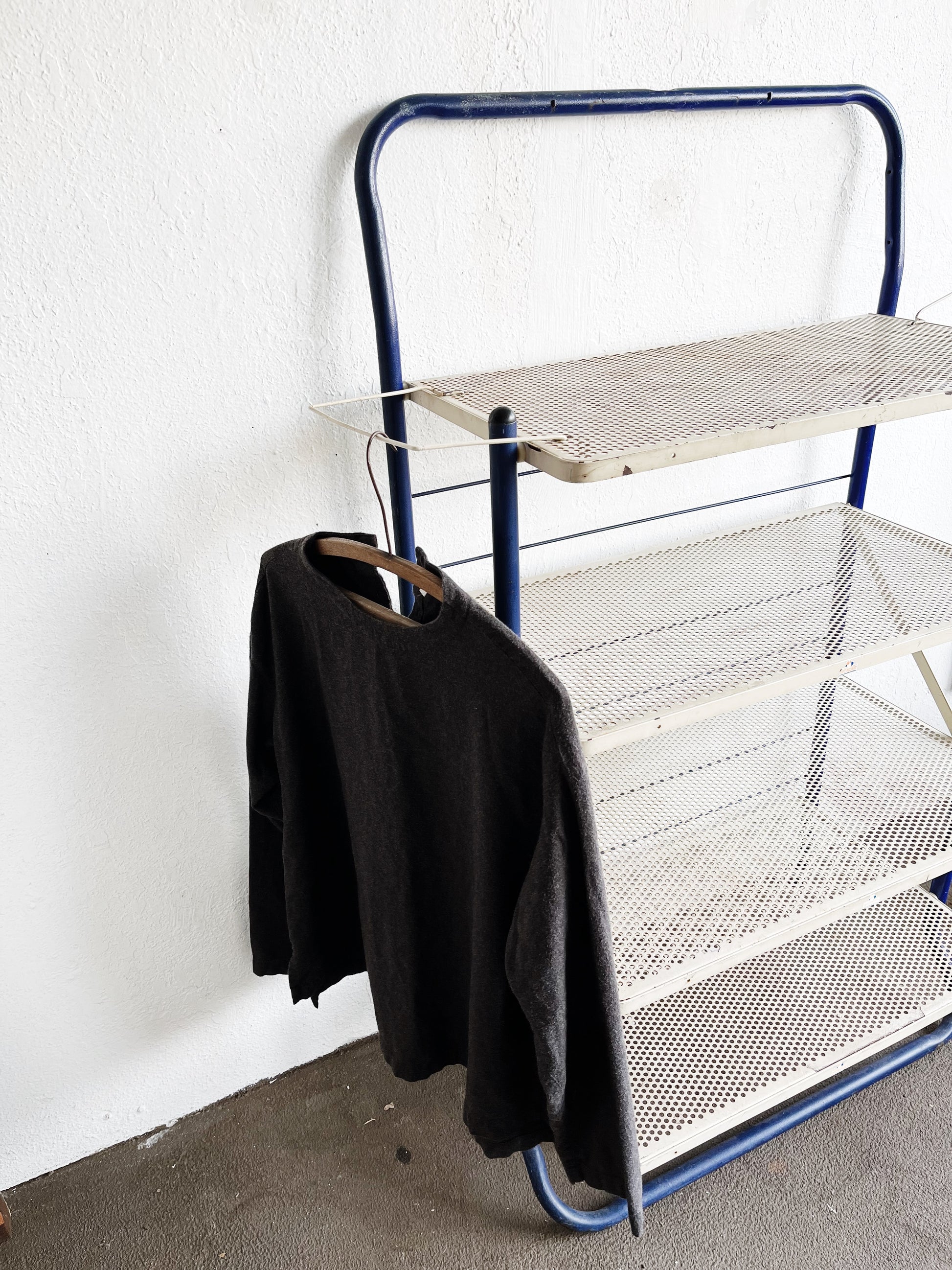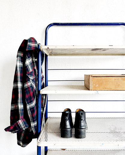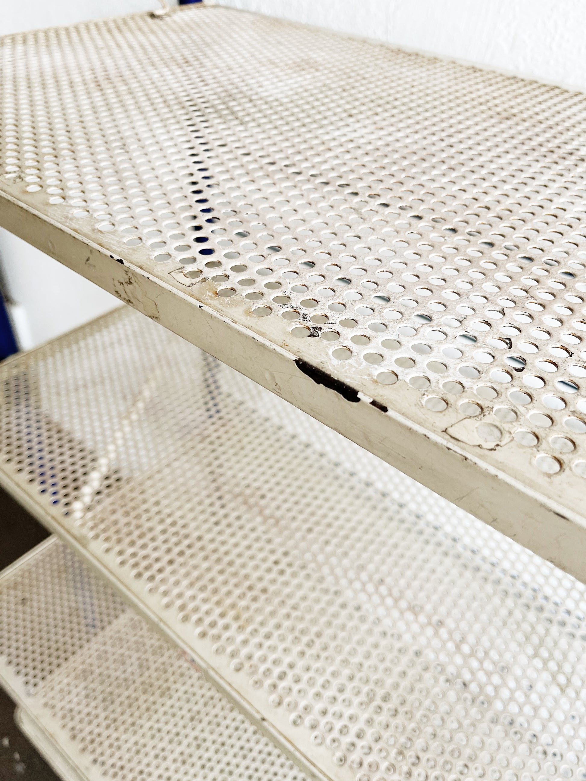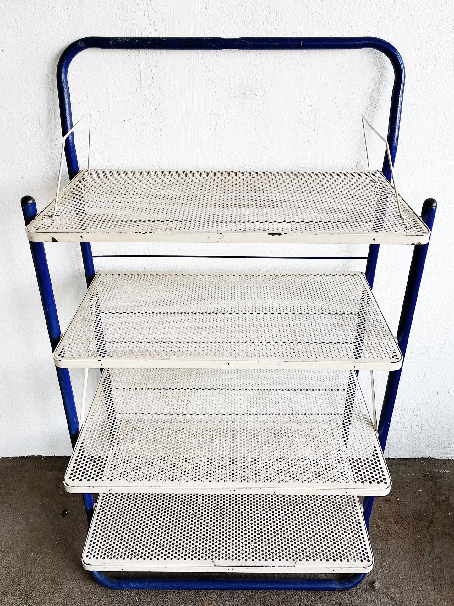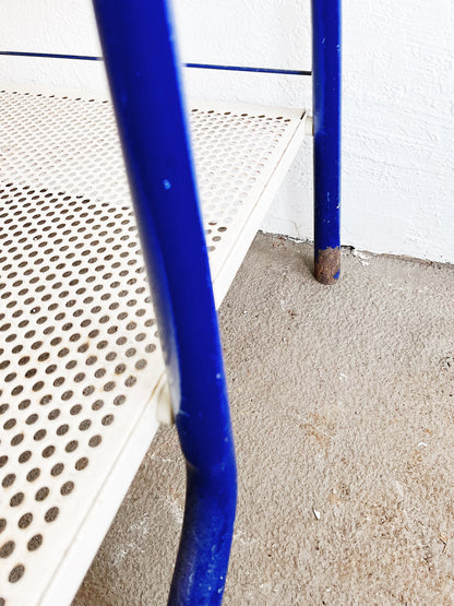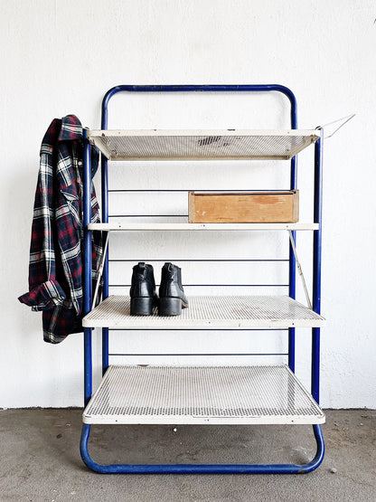Old wonder bread shelf. Painted metal, cobalt blue and off white. Very sturdy and not that heavy. Side brackets for hanging or you could remove by cutting off if needed. Good condition. The off white paint is mottled with aging of the metal