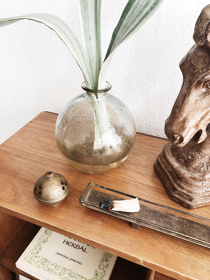 Very cool footed bronze incense tray from Mexico. This would be fantastic for an altar or displaying rocks and crystals. Works well with stick incense or Palo Santo. Weighty and solid