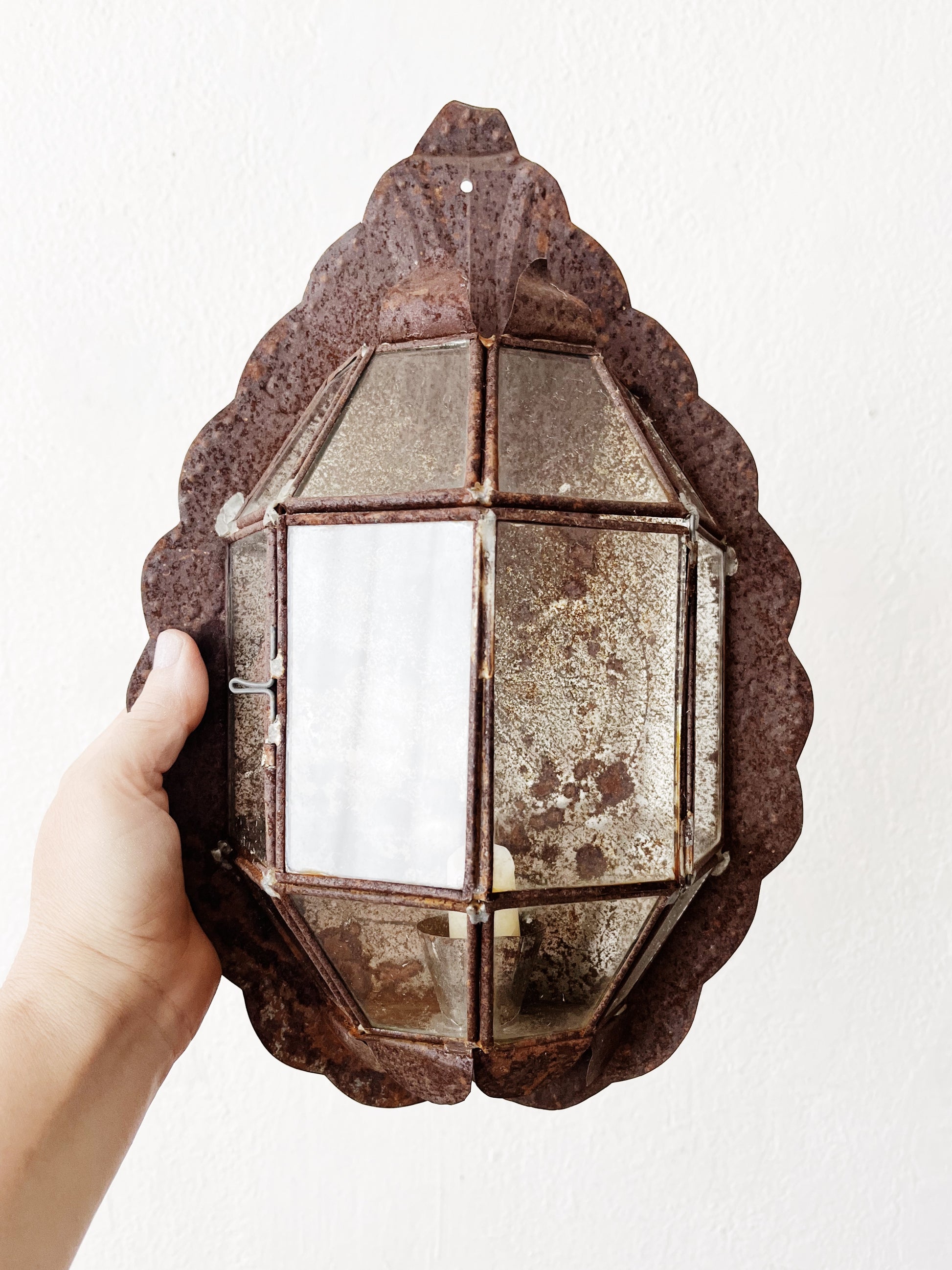 Beautiful old Mexican folk lantern. Made from glass and tin, holds a single taper candle. Looks beautiful indoors and especially outside. All over patina. Glass is in great shape