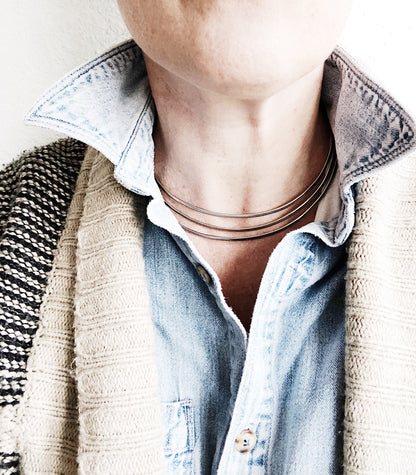 Nice Mexican silver choker or neck cuff, with a triple band design. Looks great with denim or a little black dress