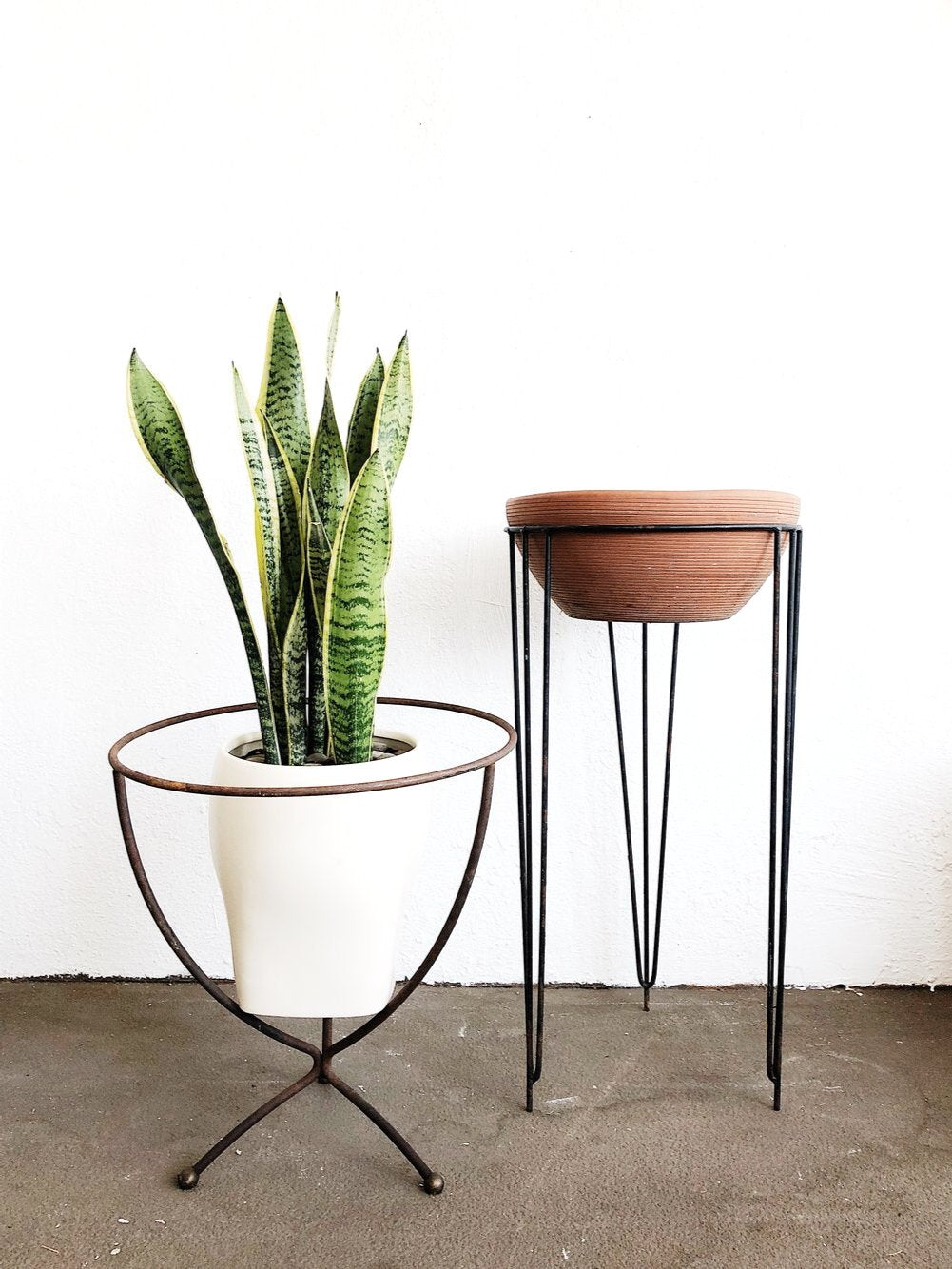 Iconic mid century metal bullet planter on left. Wide rim and little ball feet. Holds a large pot or you could add a piece of glass or wood to use as a table