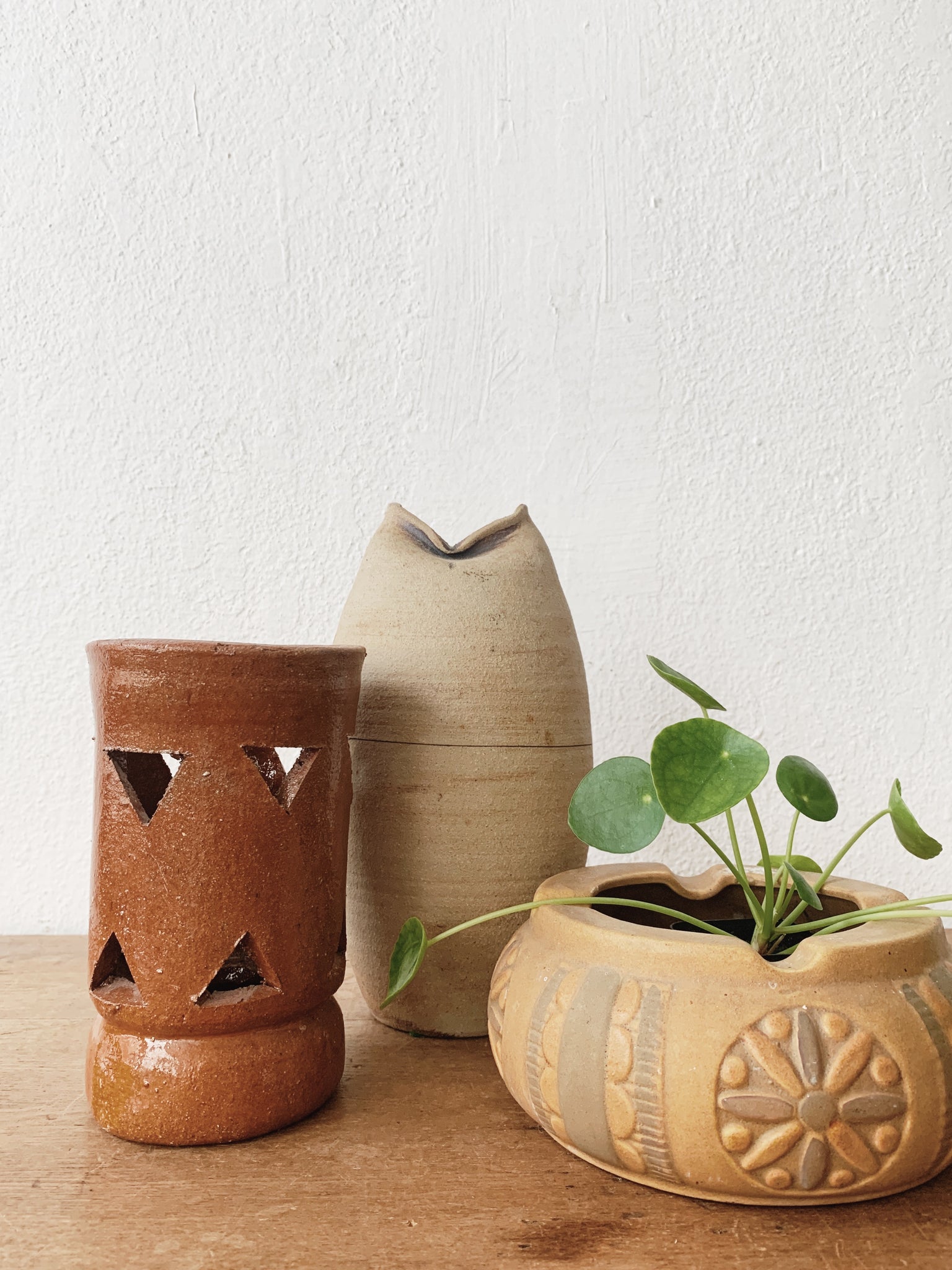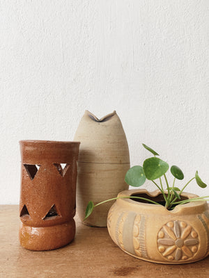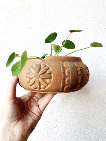 Vintage ceramic pot that looks like it was originally for cigars. It makes a great plant pot! Pretty matte glaze of ochre and terra cotta with decorative vintage mod floral pattern.
