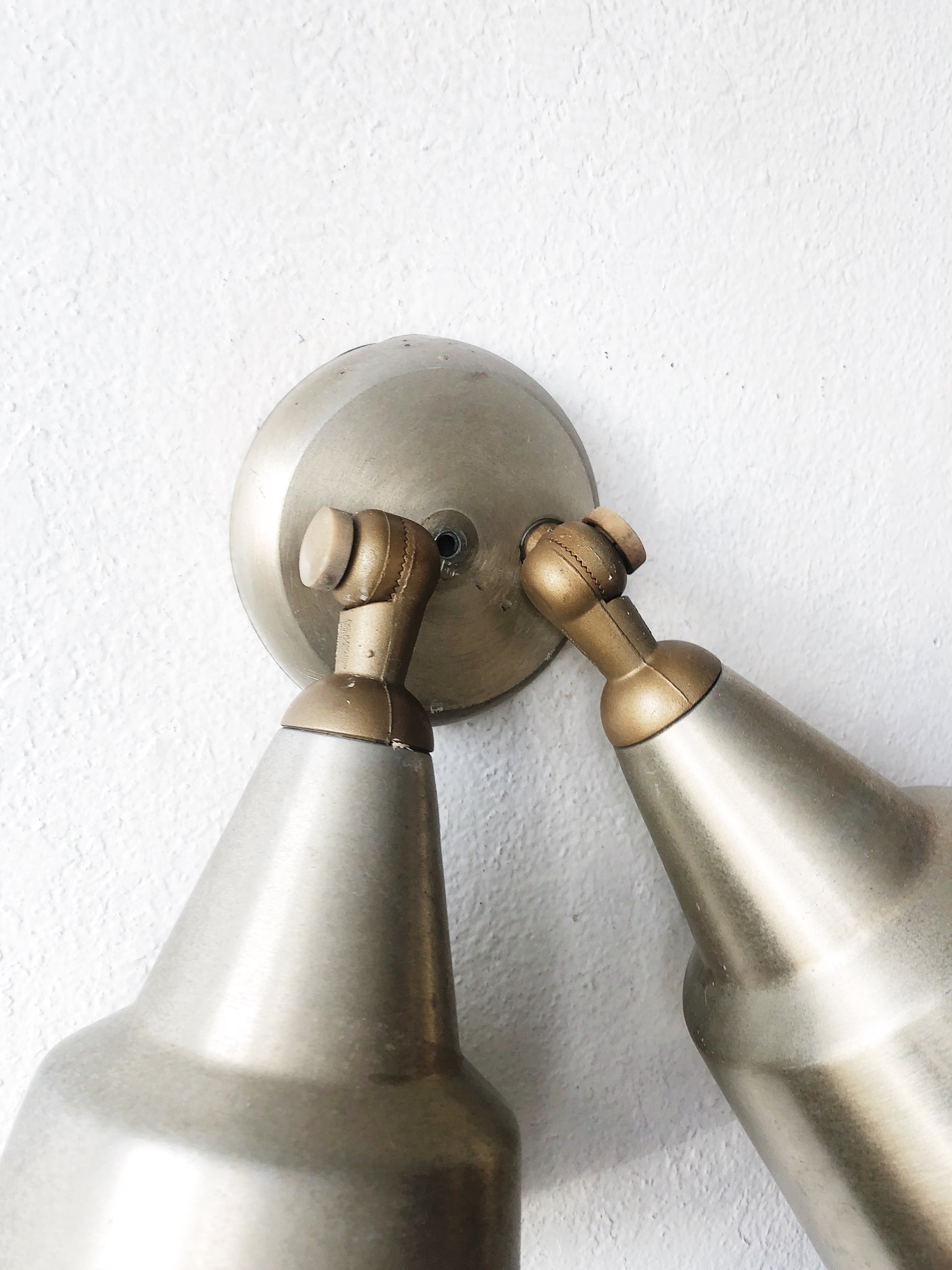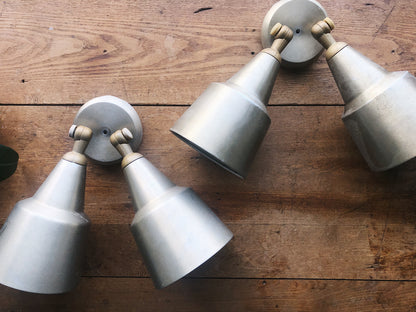 A great look to this double aluminum sconce. Adjustable arms. Rated for indoor or outdoor use, it has a fantastic mcm industrial vibe. The finish is a warm brushed pewter. Hardwire installation