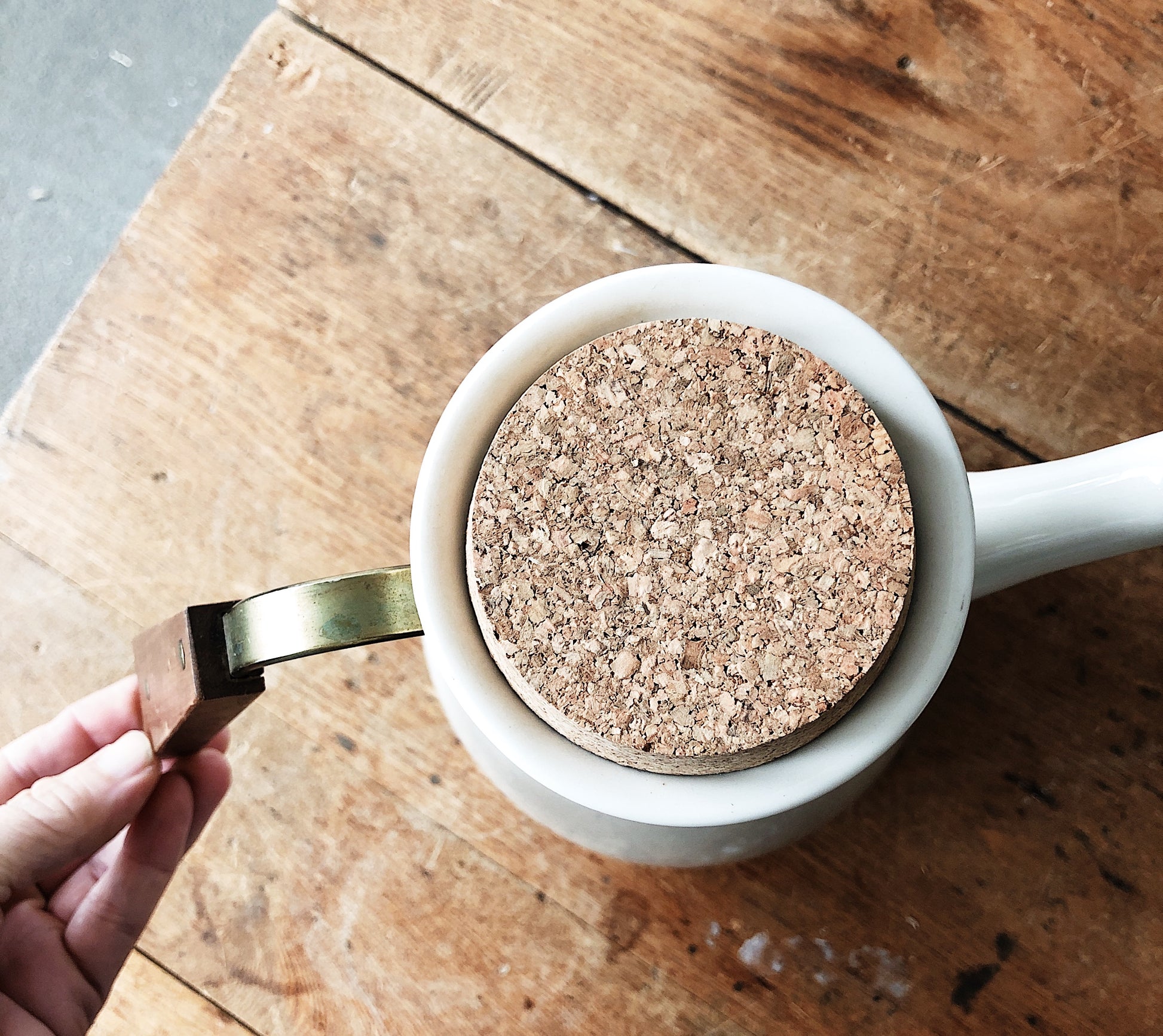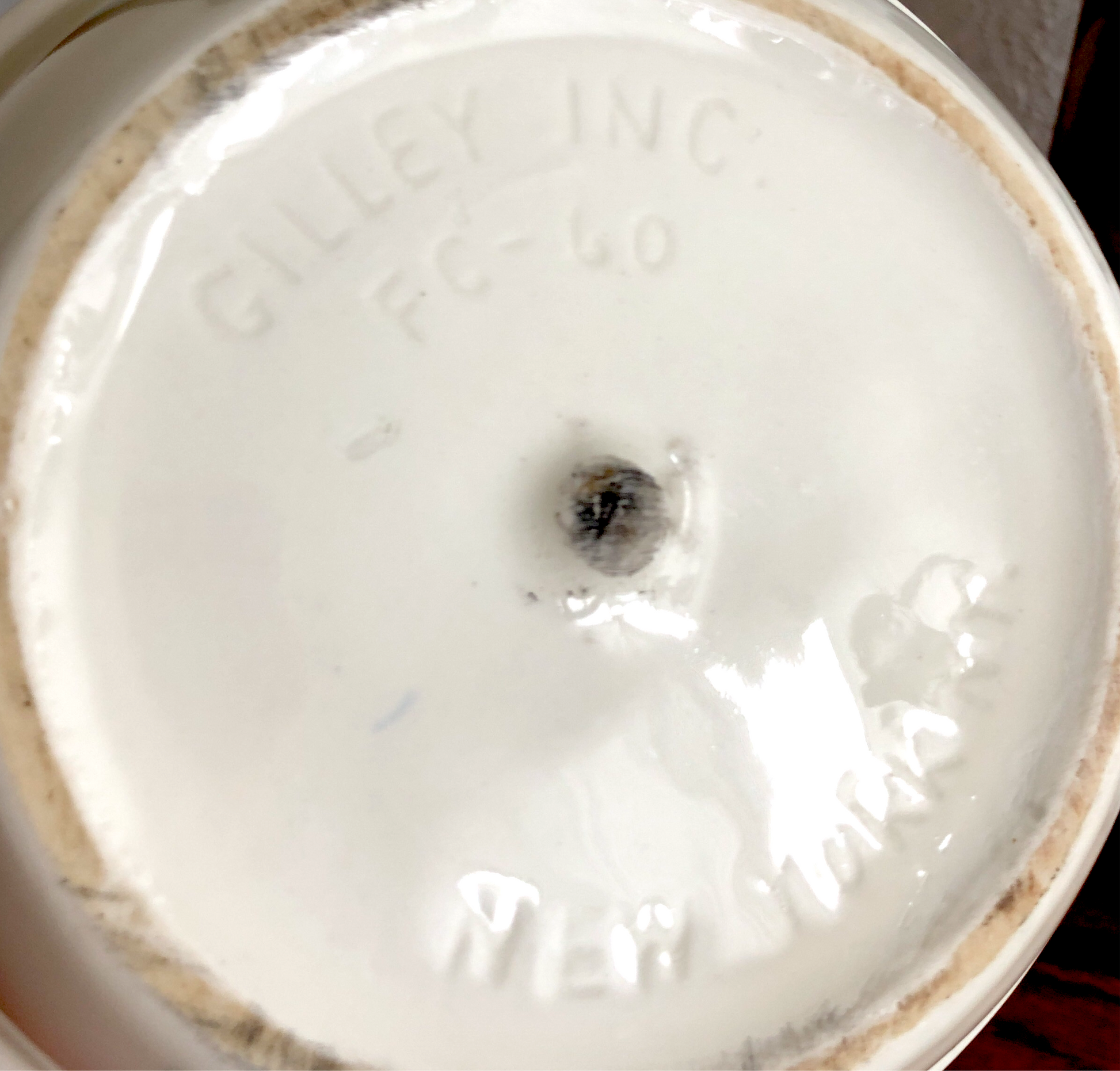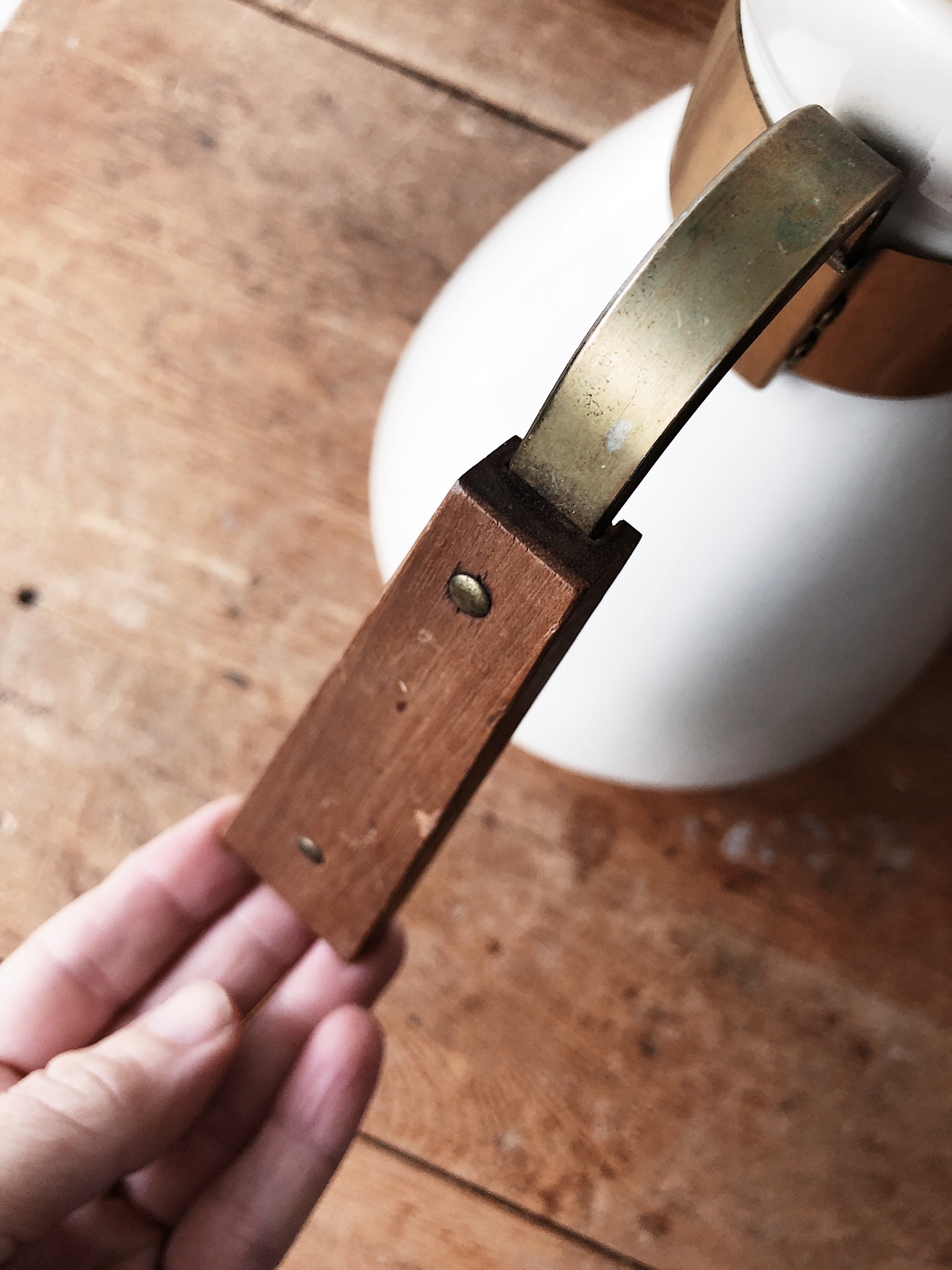 Fab Gilley Inc ceramic pitcher from the mid century. Teak wood handle, cork lid and brass details