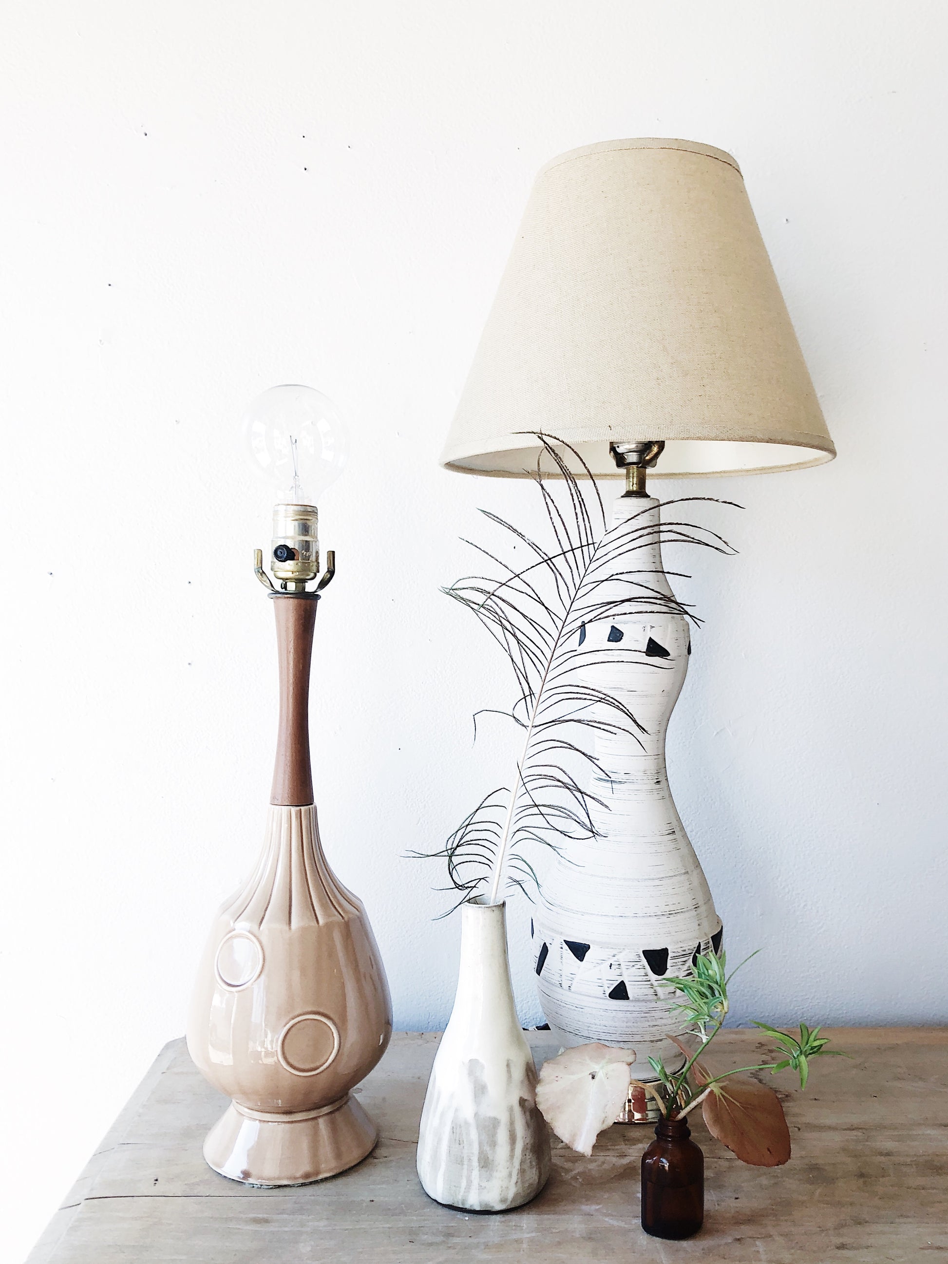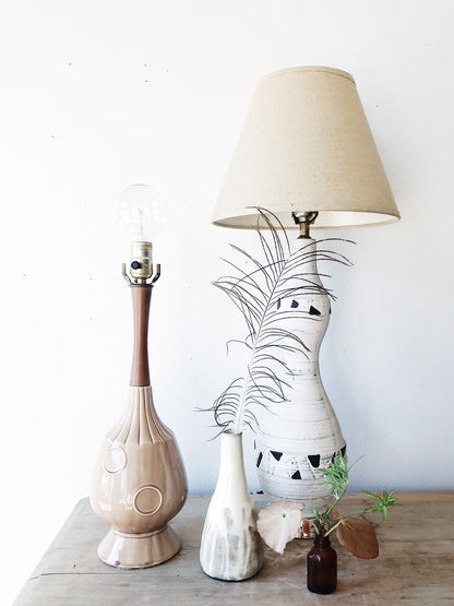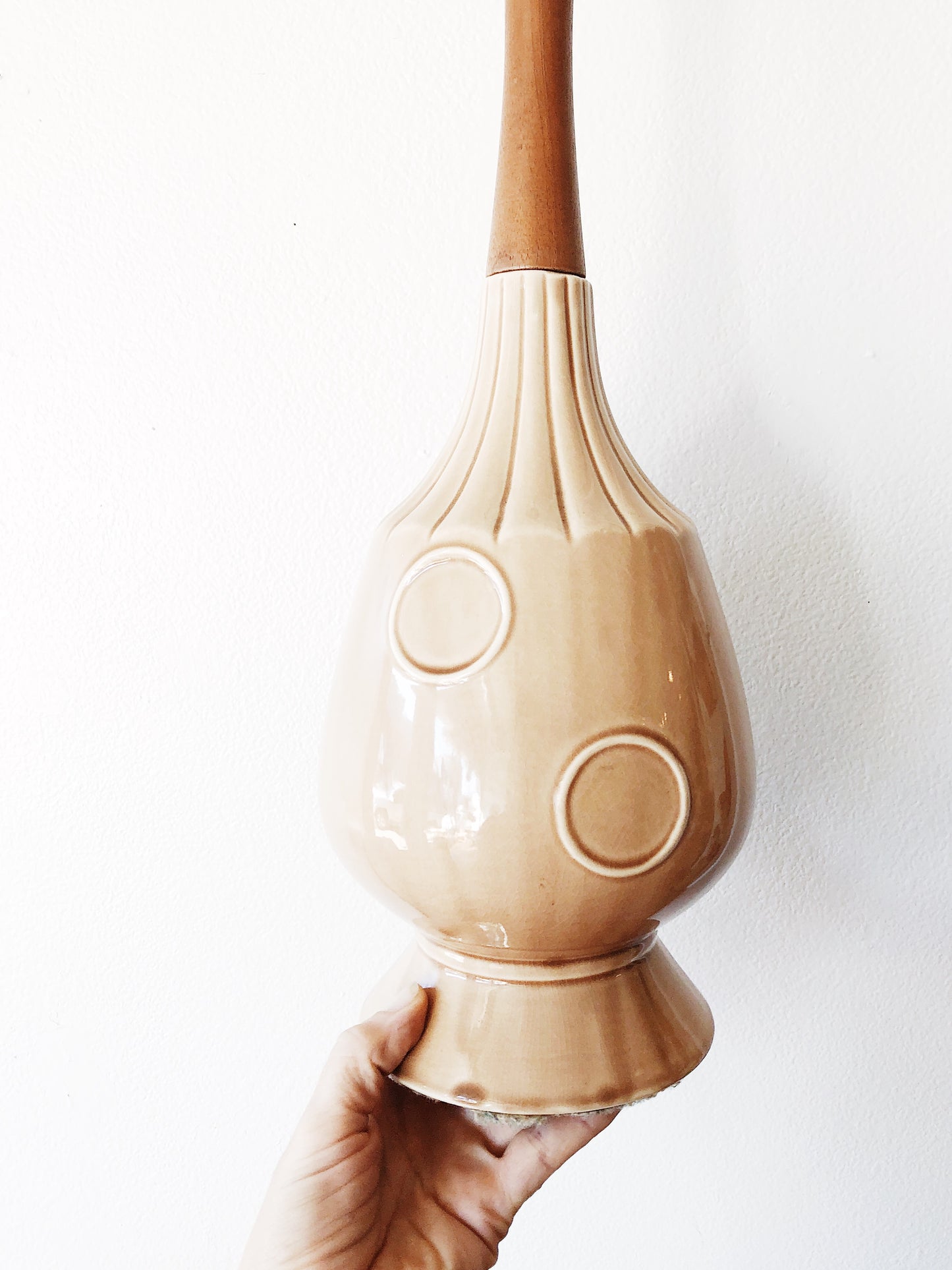 Mid century pottery lamp in a nice blush/buff color. Great double circle design and teak neck. Comes with a harp or shade if you prefer