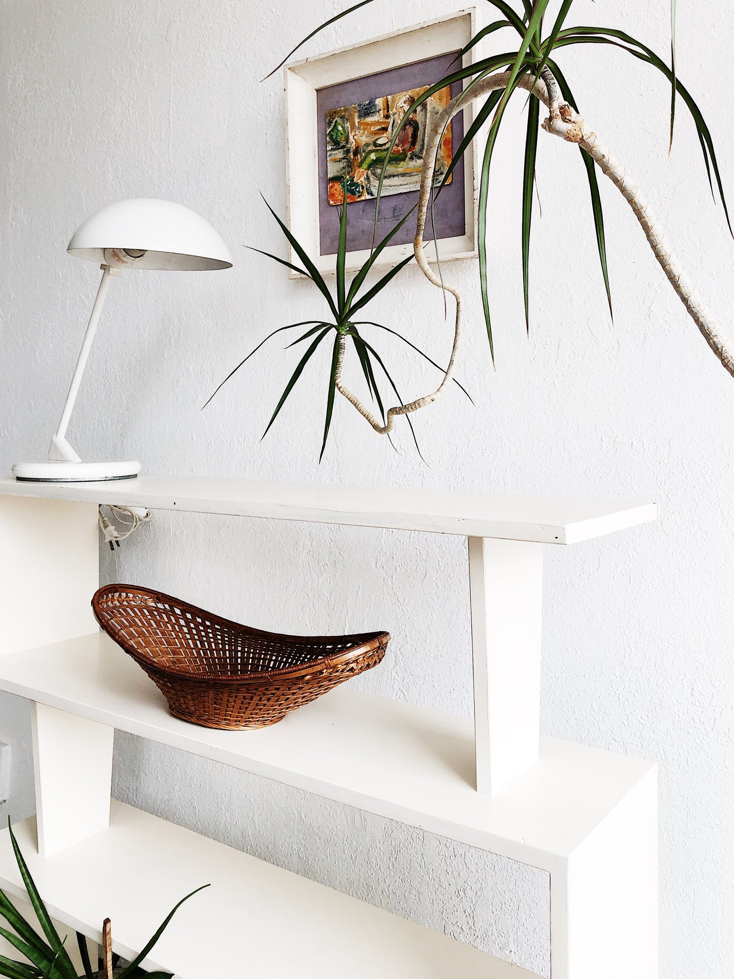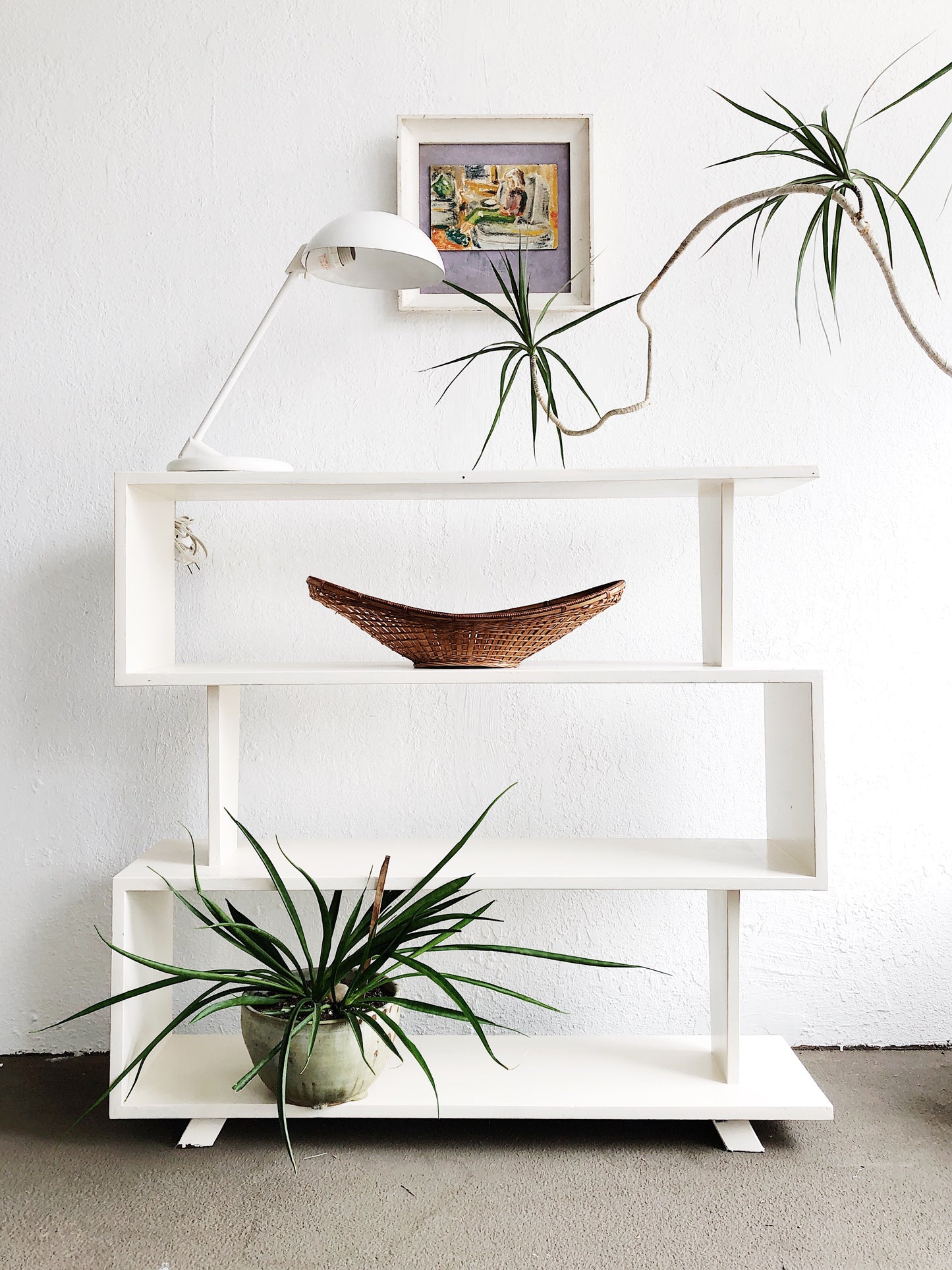 Fantastic painted wood vintage room divider shelf. Great look against a wall too. Solid and sturdy. A beauty!