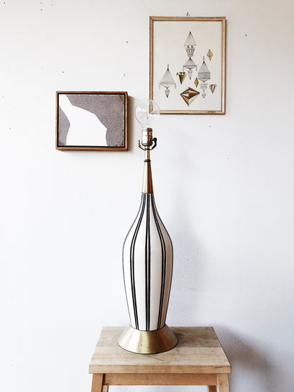A vintage 1950s ceramic lamp with goldtone accents. Dark grey and warm white stripes. Comes with or without a brass harp