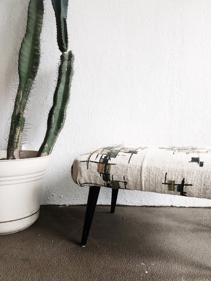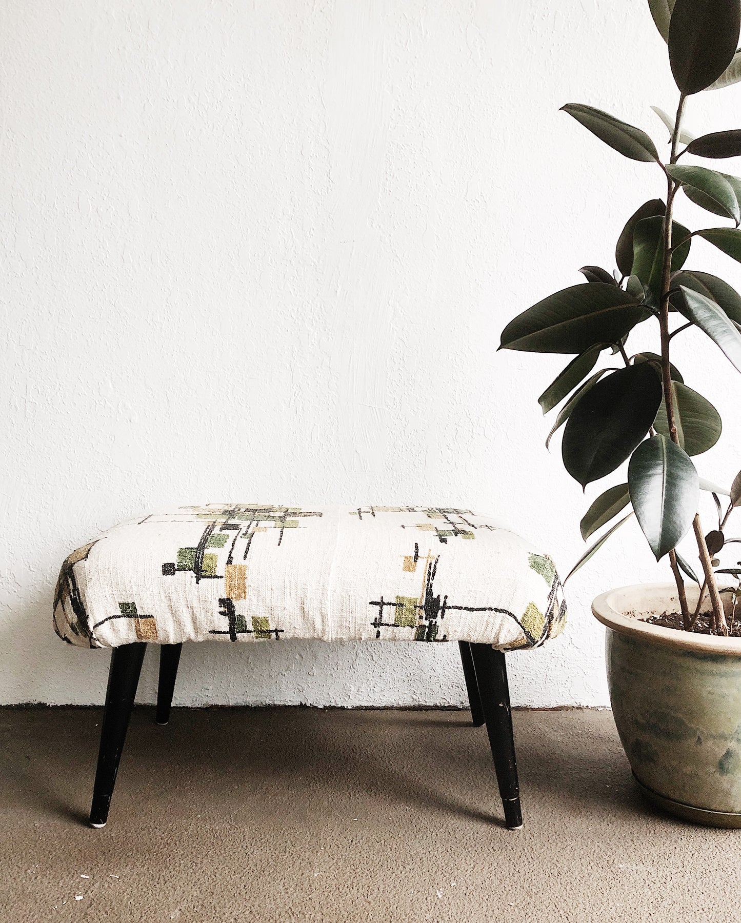 Fantastic upholstery on this mid century ottoman. It’s a bark cloth inspired pattern on a nubby cotton linen blend. Comfy on the feet and legs and looks good too