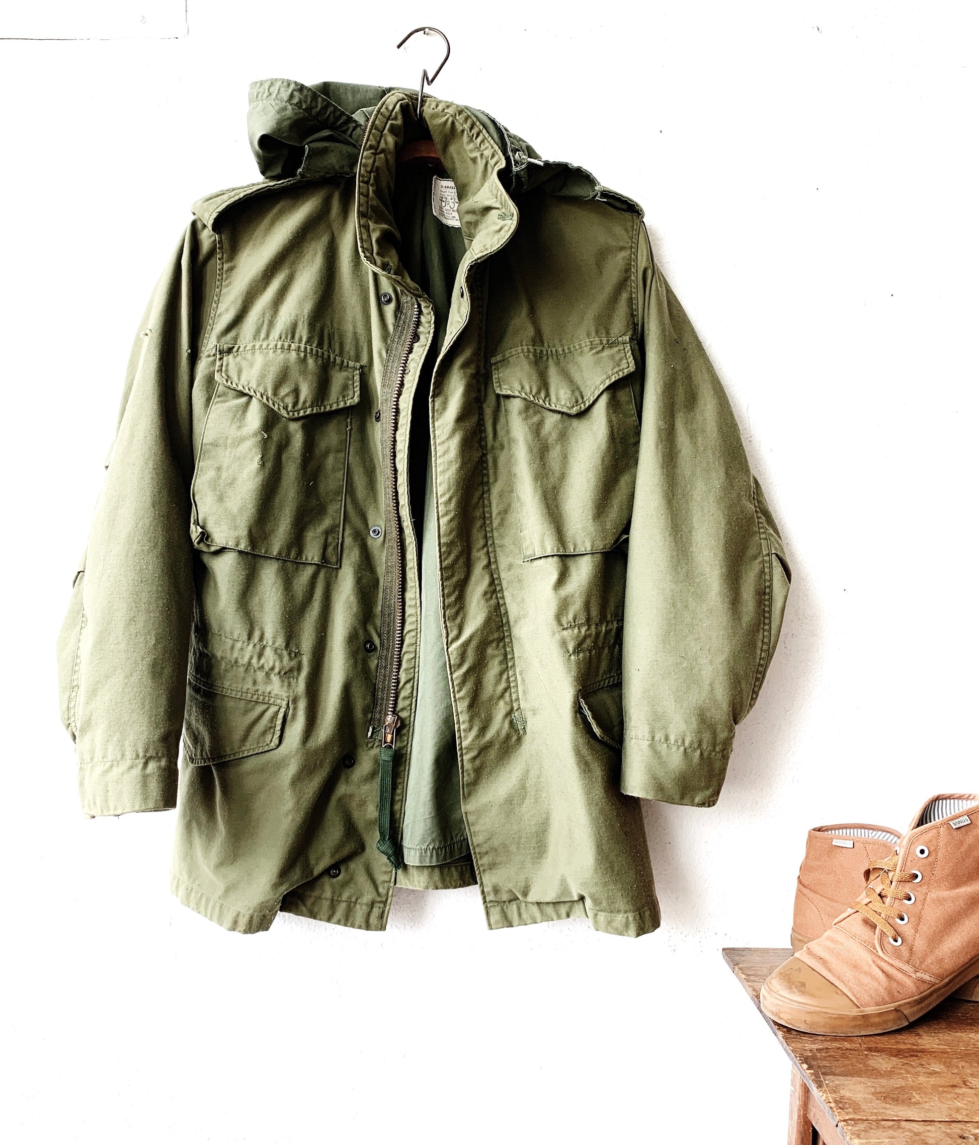 Vintage cotton lined military field coat with hood. In great shape ! Zips / snaps , lots of useful pockets. These are the best year round jackets.