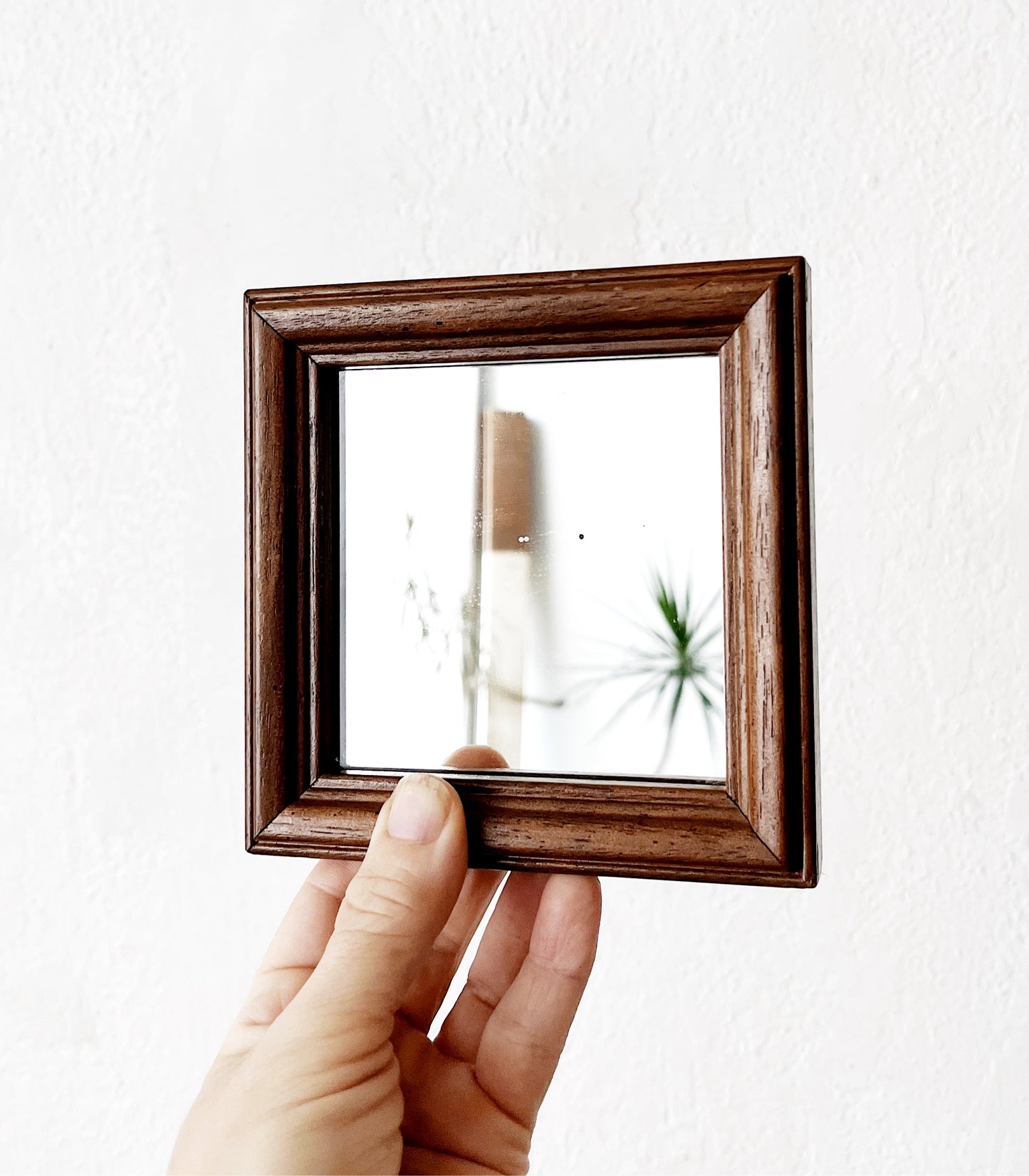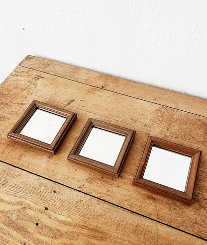 Petite mirror trio that hangs any which way. It’s fun to arrange. Wood framed and hangers attached to use in either direction, square or diamond