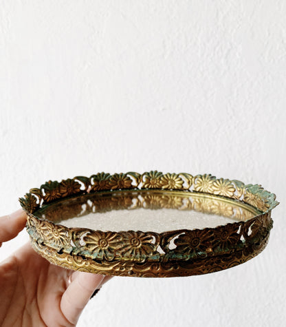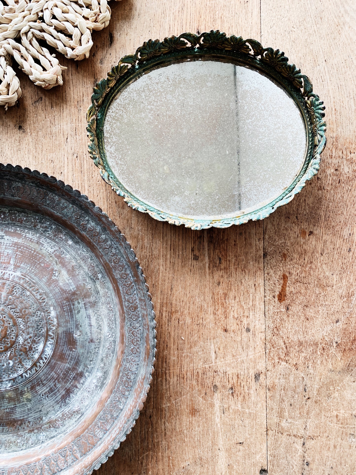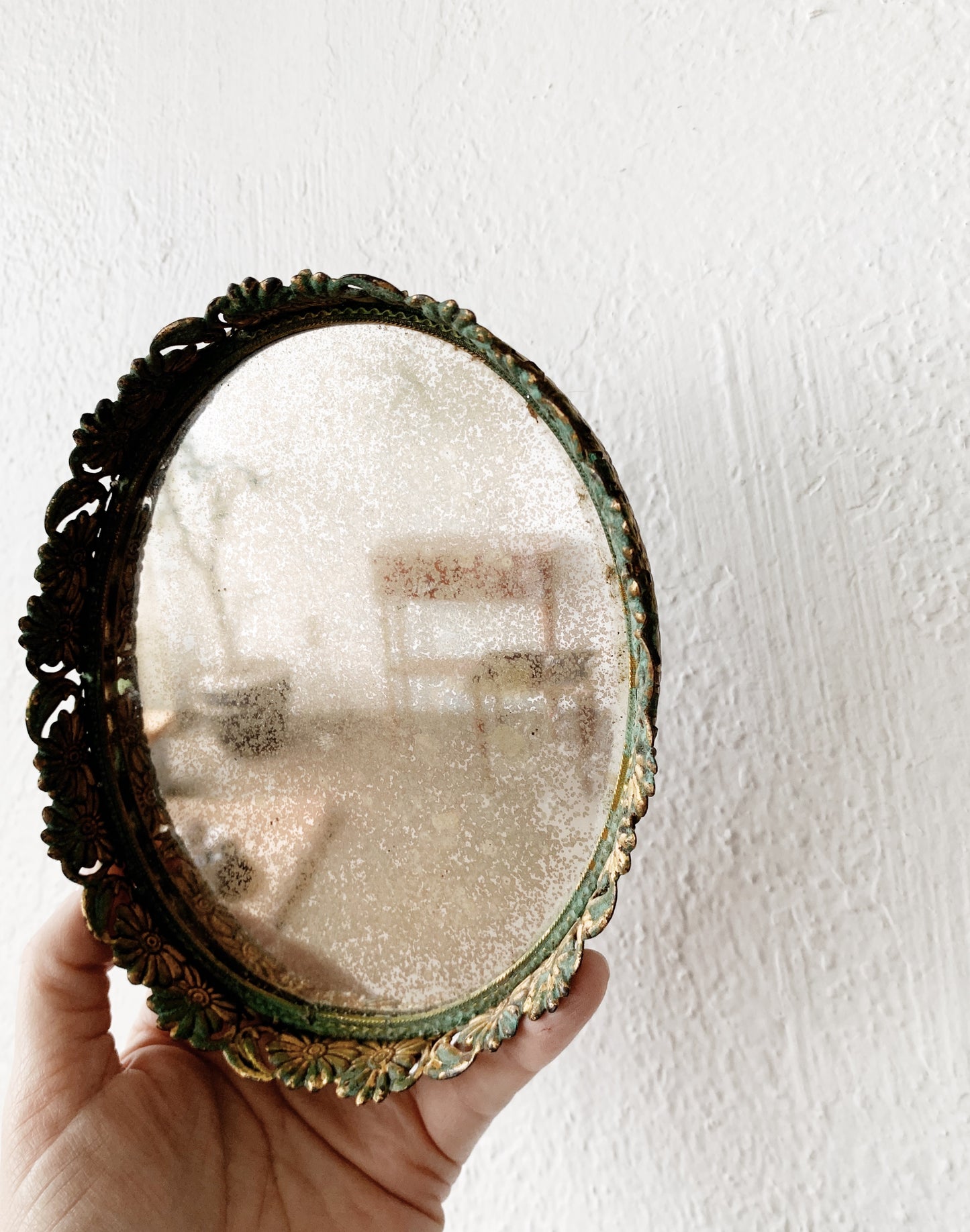 Sweet little mirrored vanity tray with aged glass. Perfect for a few apothecary bottles and pieces of jewelry.