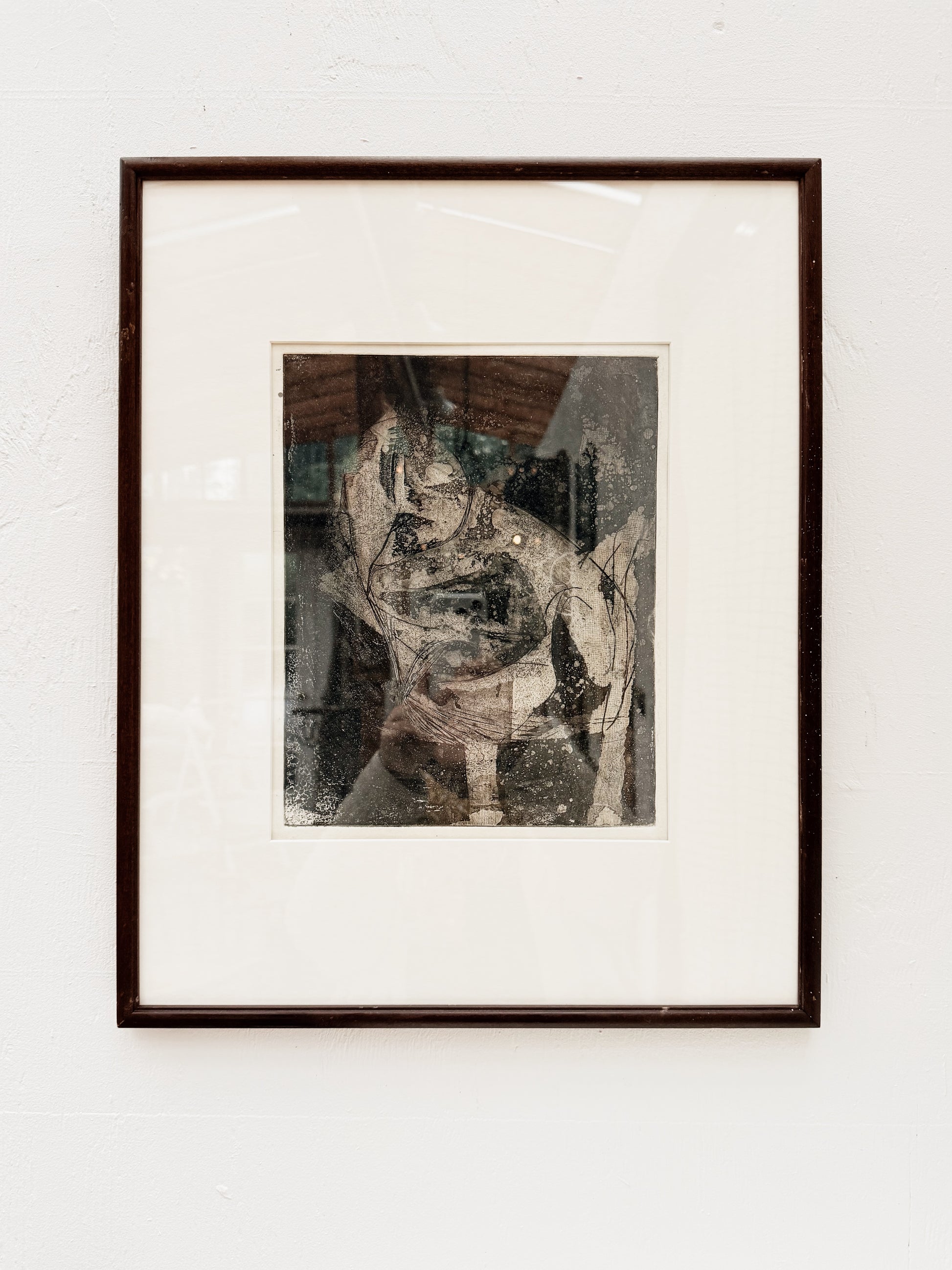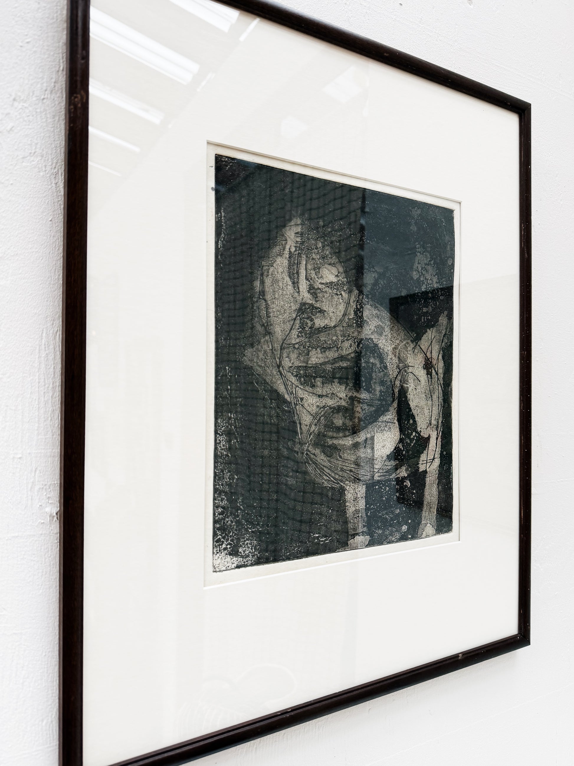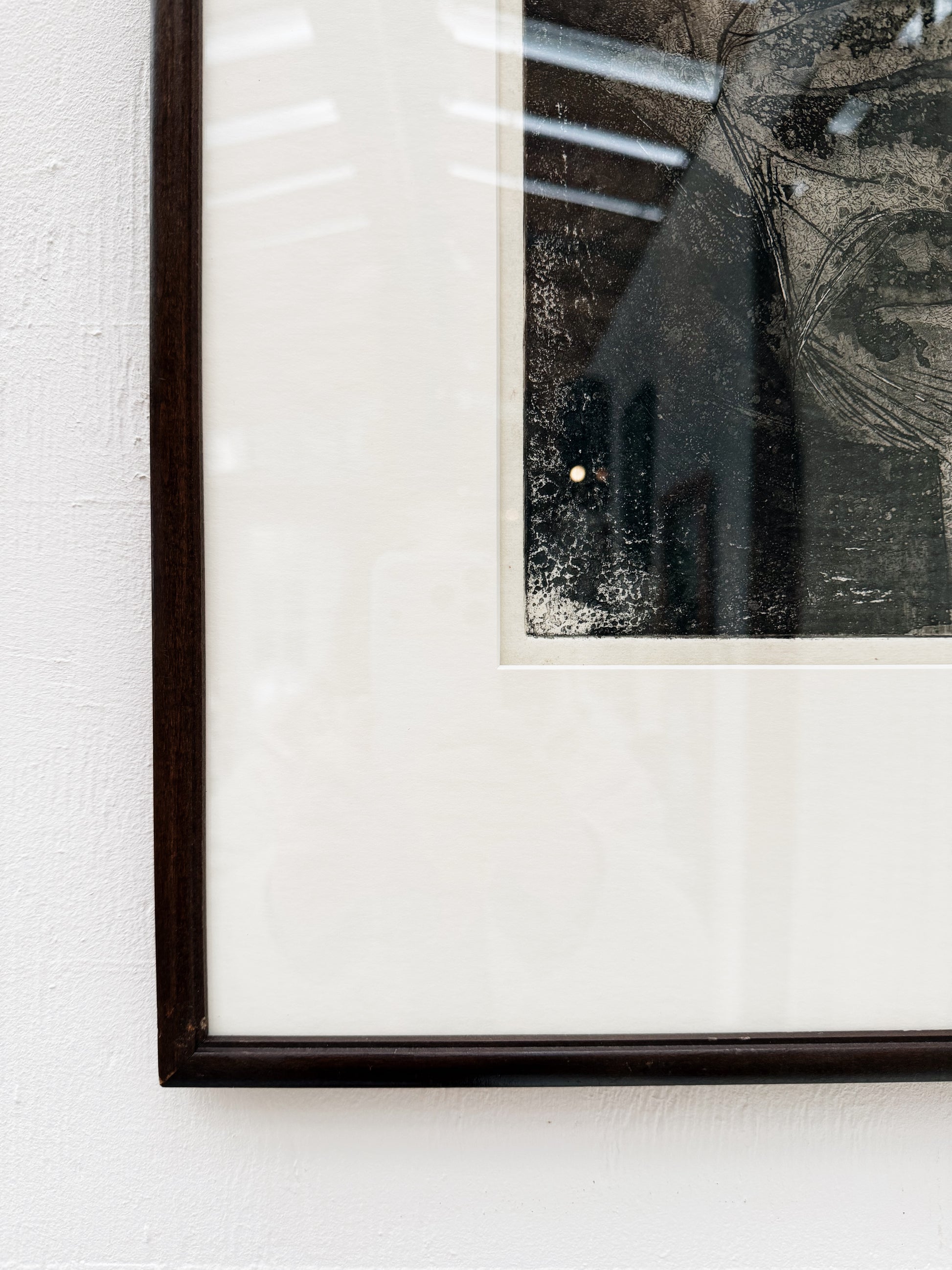 Wonderful modernist bird, head a tilt. Strong plate marks and really nice job with the inking. Whimsical and inquisitive avian art. Presented in a simple black wood frame under old glass.