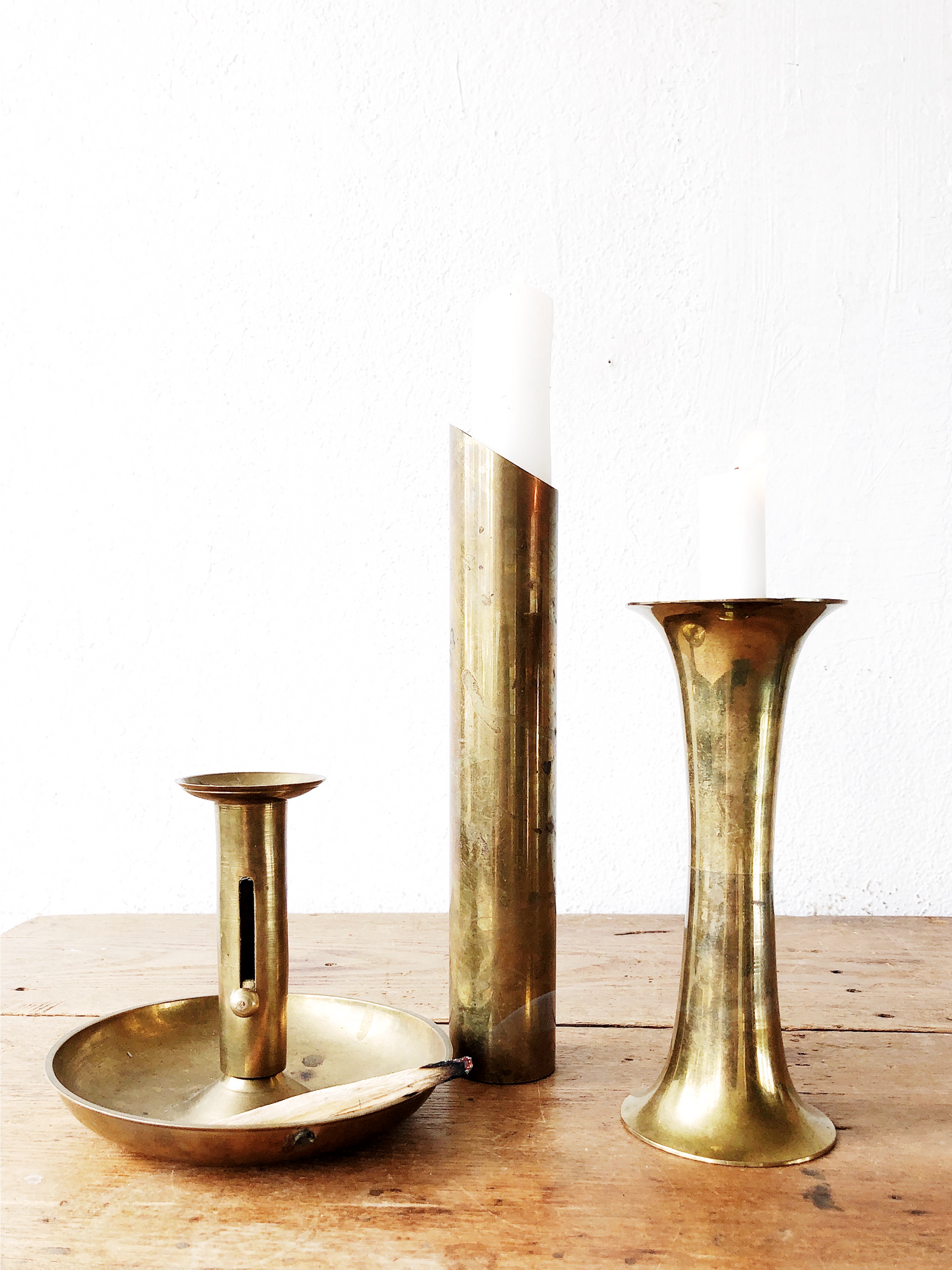 Love this modernist trio. Vintage brass mismatched, but look great together. Nice patina on all of them. One switches from candlestick to vase, one has a lever to raise the fading wax, and the third has a sturdy asymmetric shape