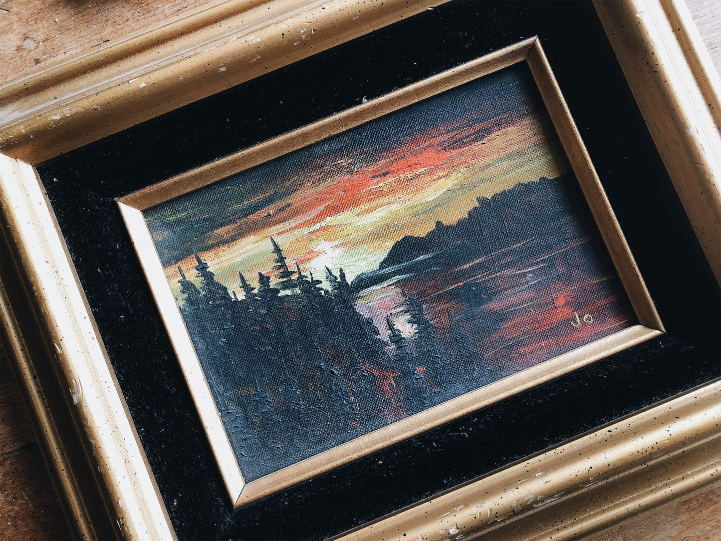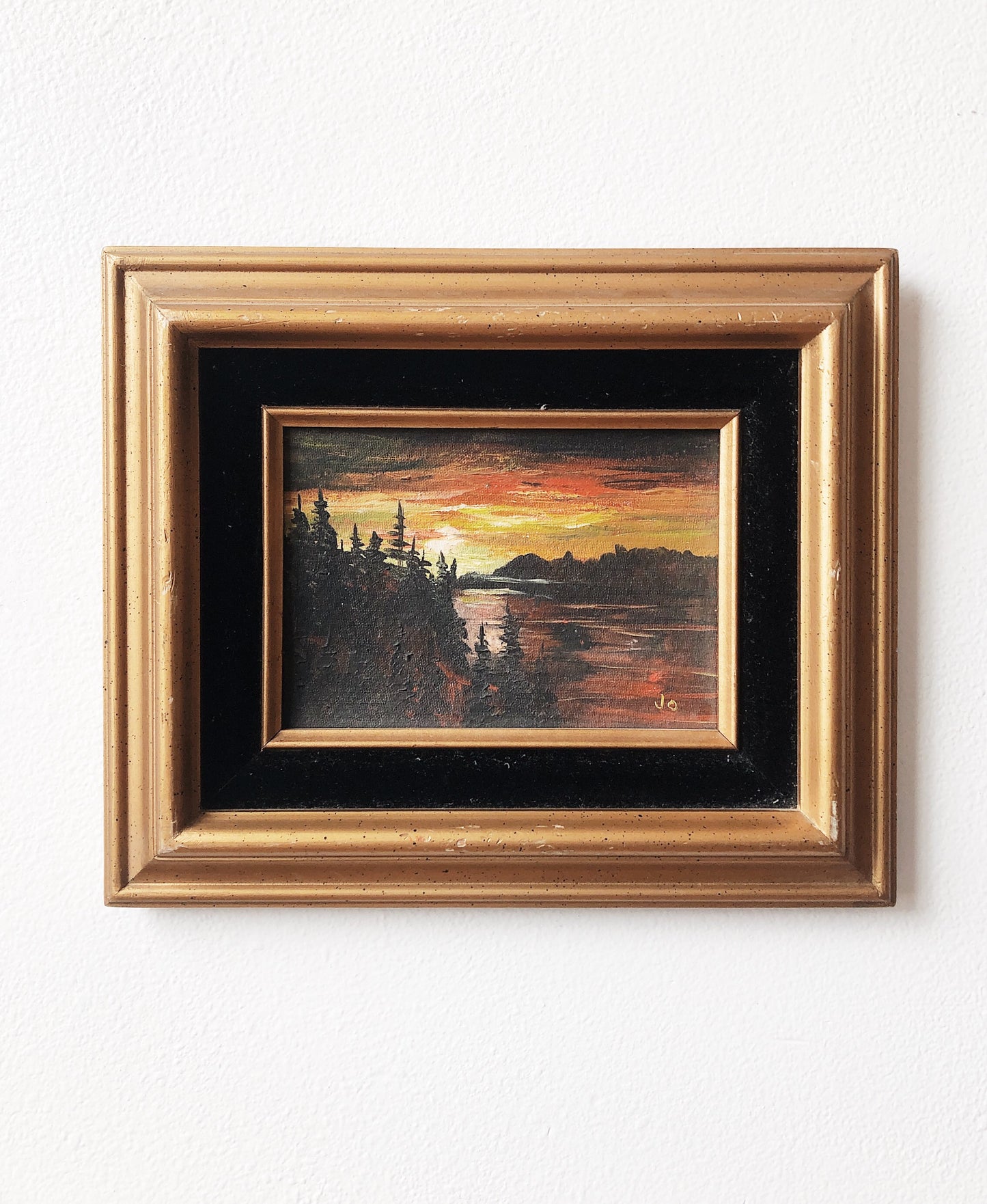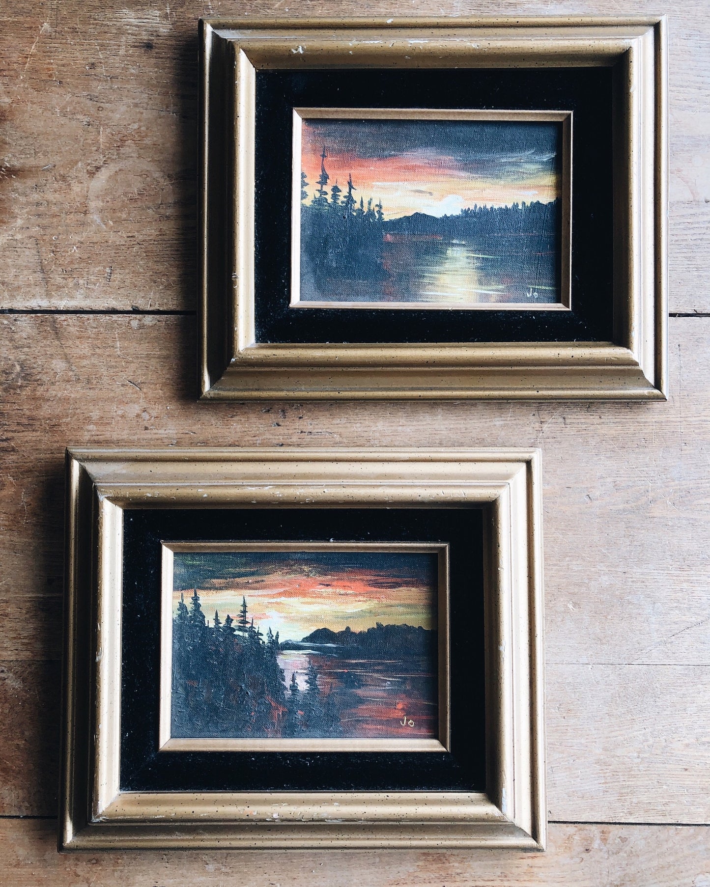 Two moody landscape paintings of a moonlit lake. Saturated yet subtle colors. Gold leaf and velvet frames. Signed