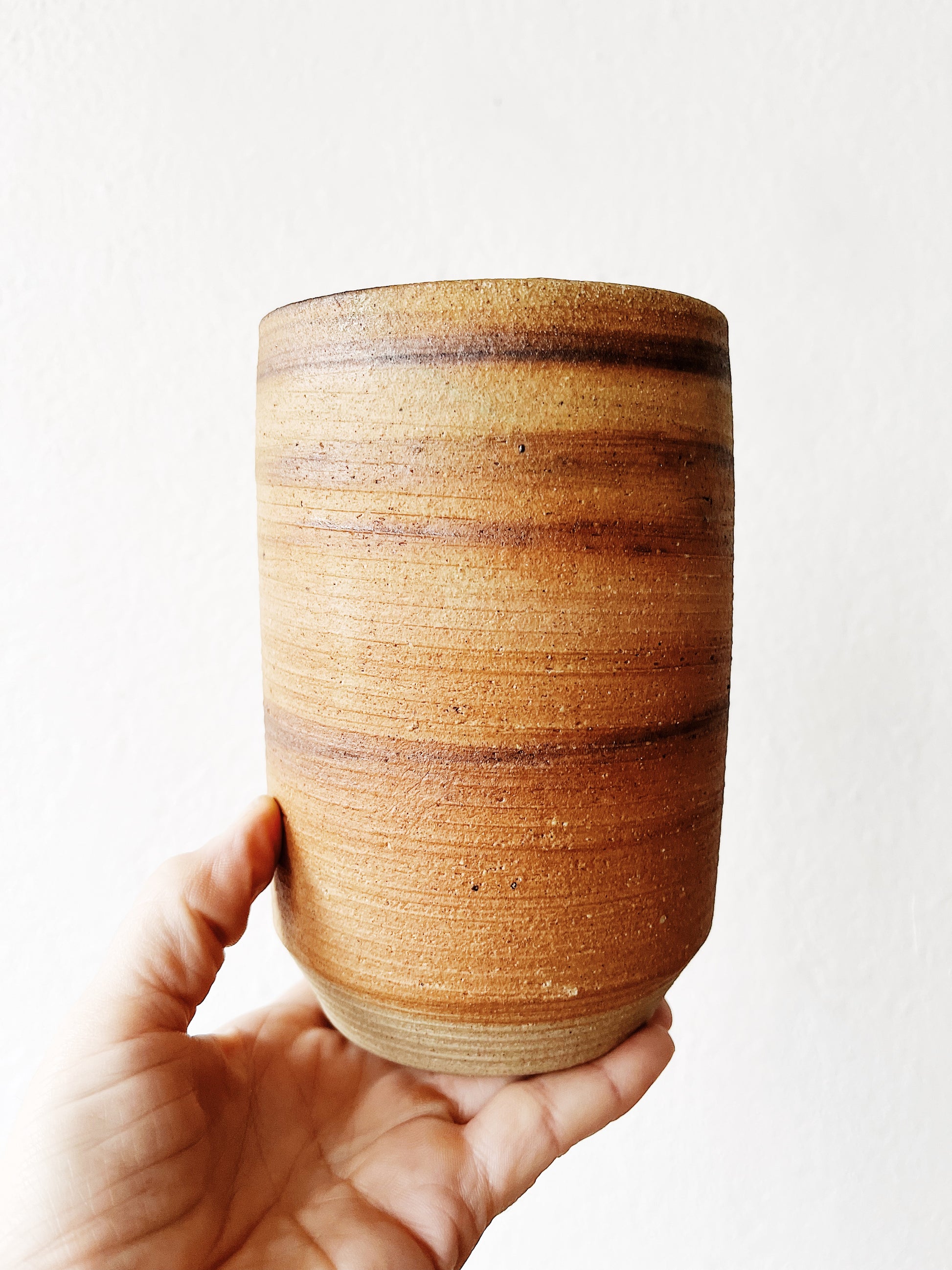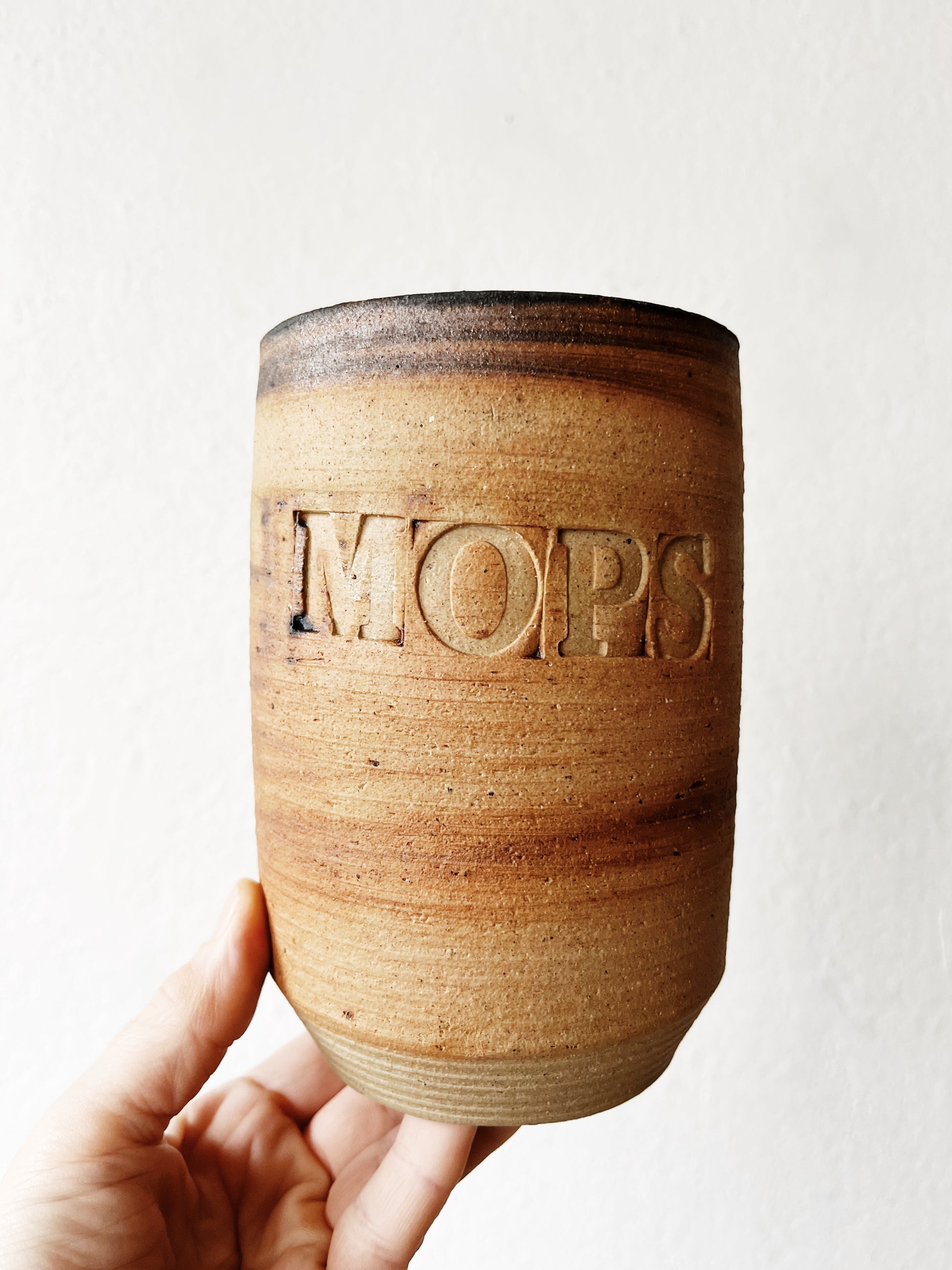 Vintage stoneware from the studio of British potter Geoffrey Maund. Swirled thick stoneware that’s great for holding utensils or potting up