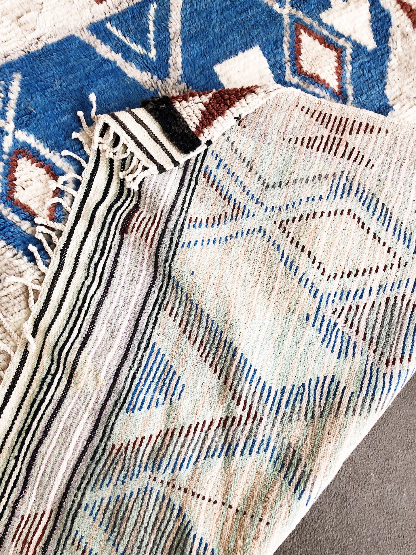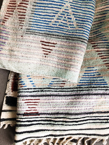 Such a nice change to find a Moroccan rug that is simplistic in its color palette. All natural high pile wool. Vegetable dyed. The weeding makes the reverse of this rug just as attractive. Colors are blue, warm rusty red, nude, peach, underlay touches of wintergreen black and lavender