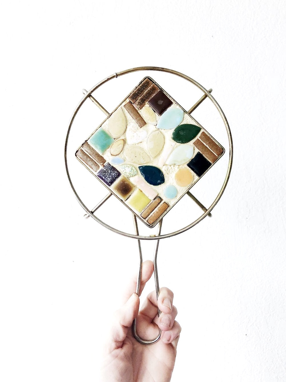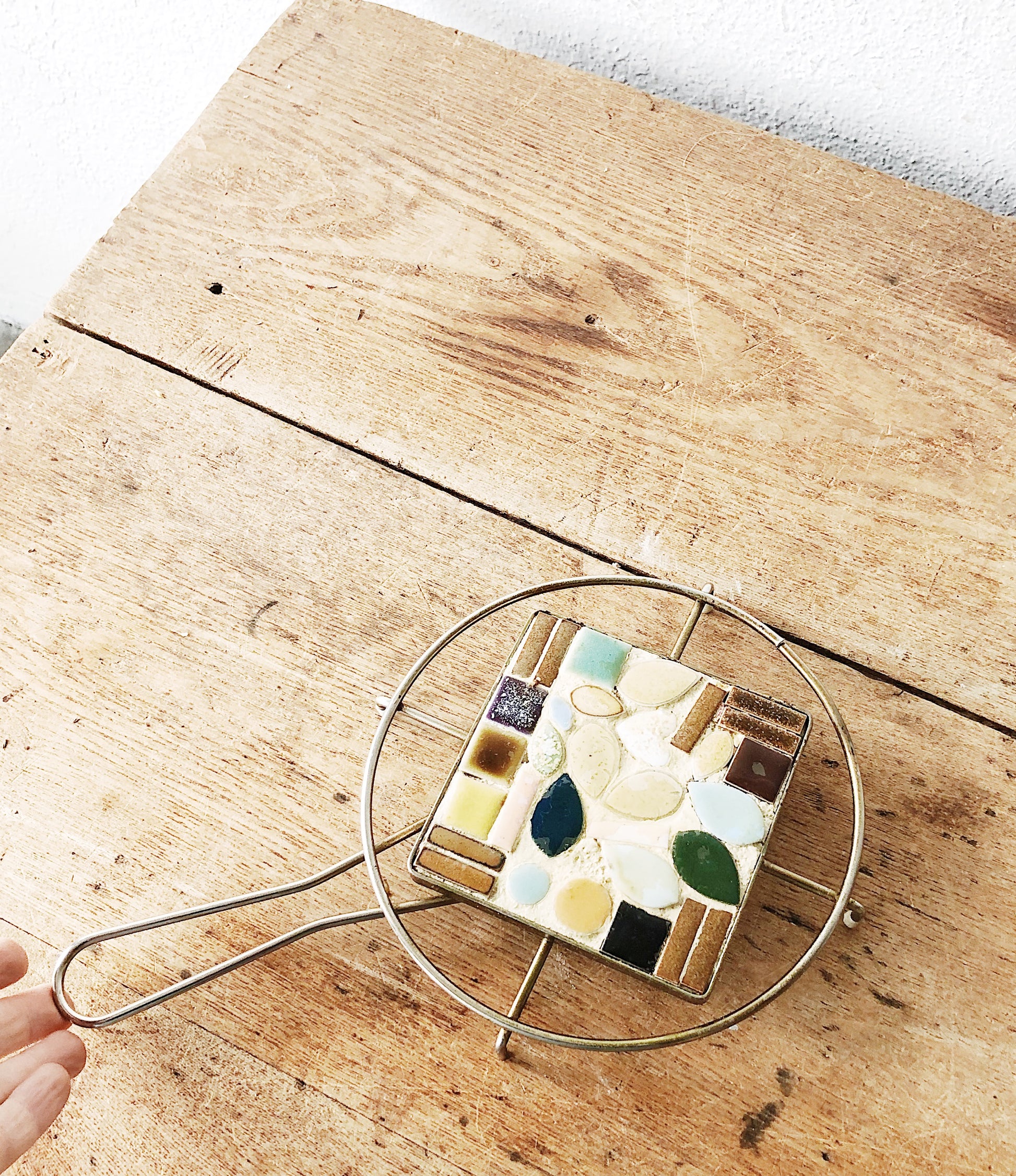 Ceramic mosaic on a footed goldtone base. Trivet or plant tray