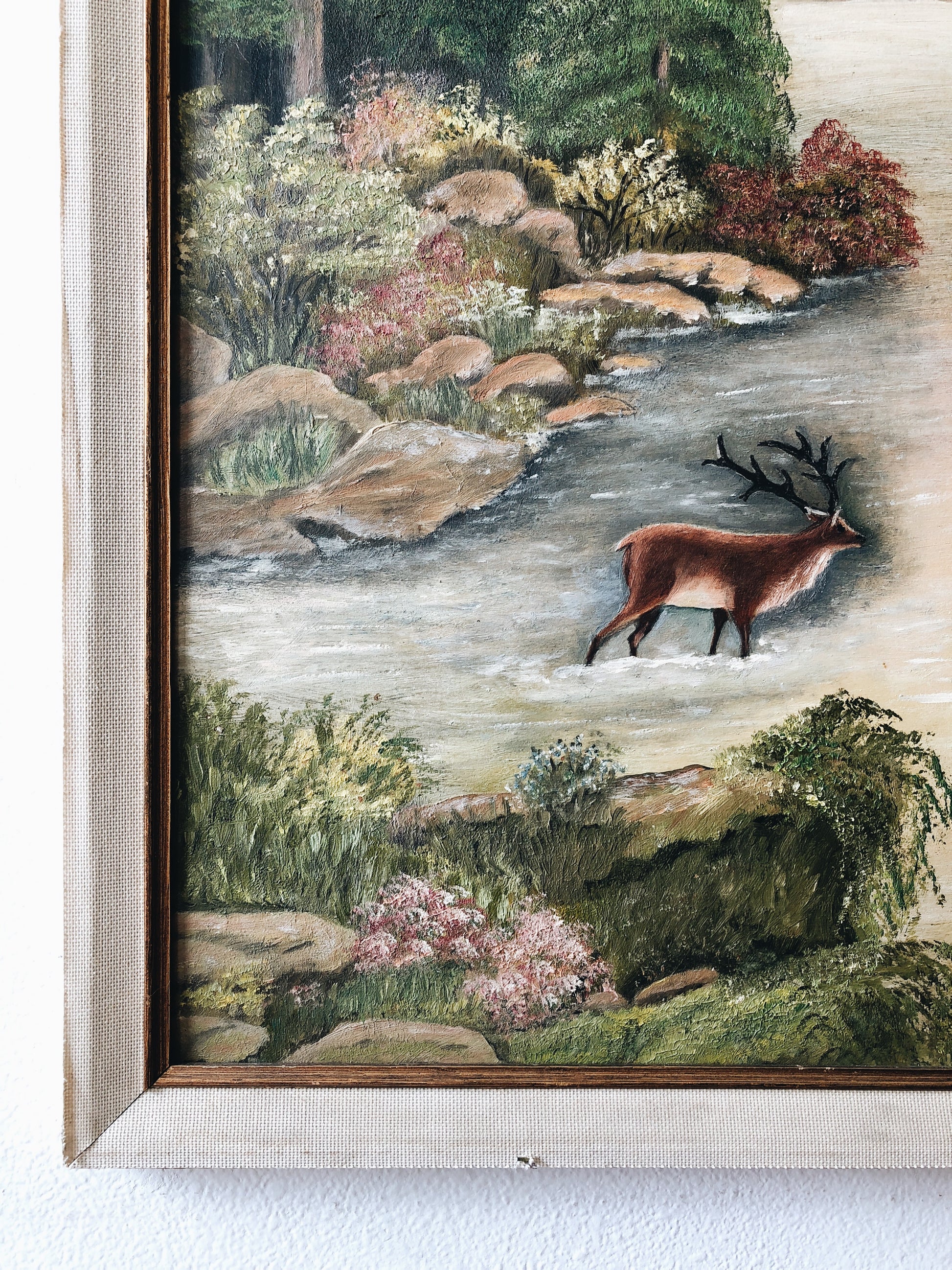 Lovely colors in this oil on board. Larger in size and framed simply in linen. Really beautifully done!