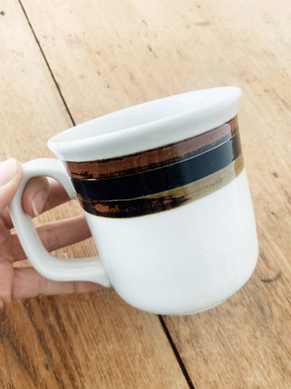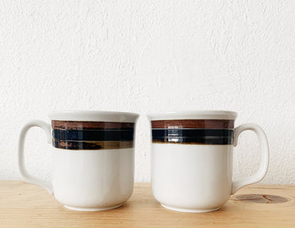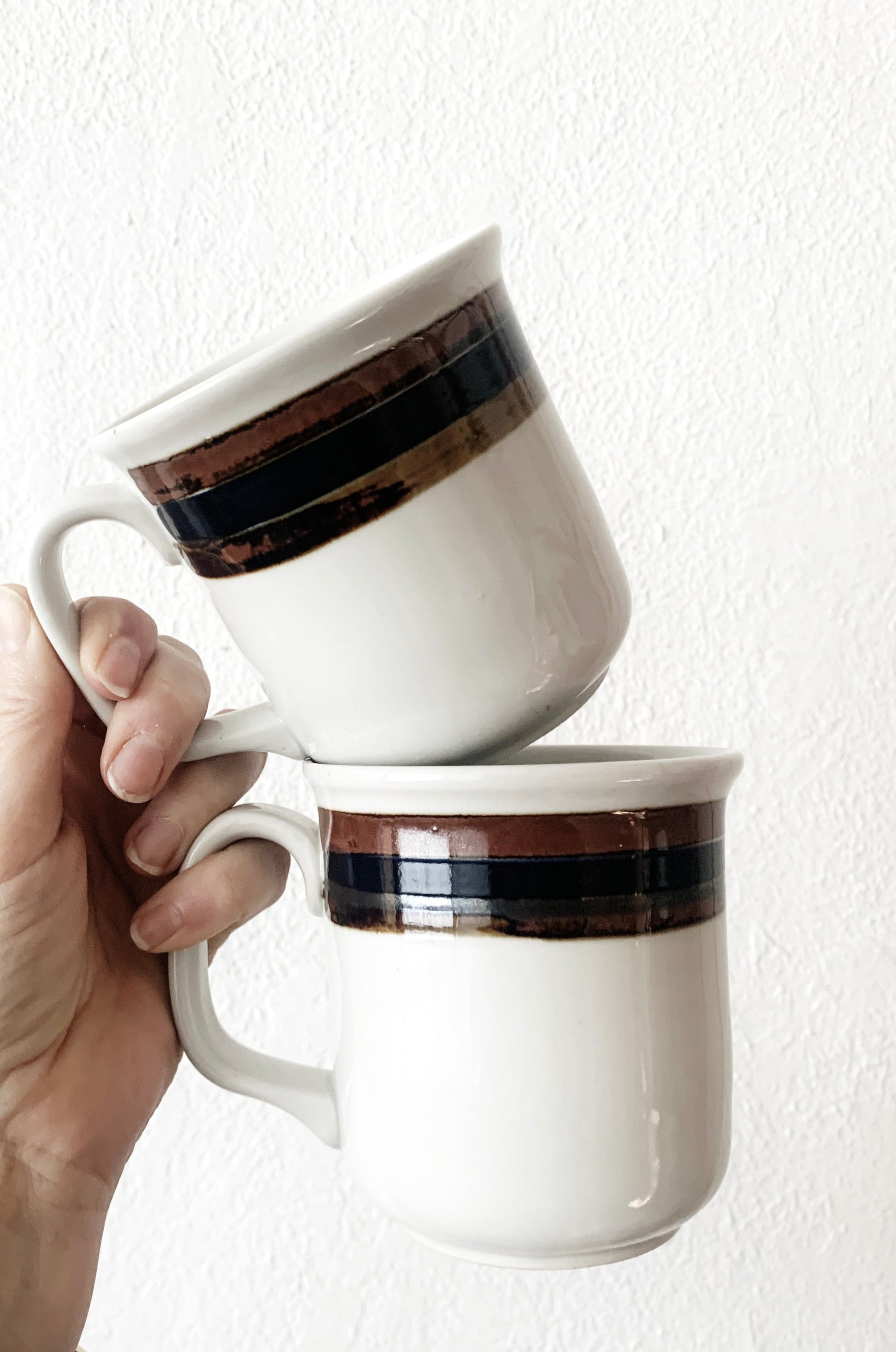 1970’s Vintage Lauffer ceramic mugs made in Japan. Creamy off white with earthy tri tone brown stripe. Nice larger size at approx 16 oz each.