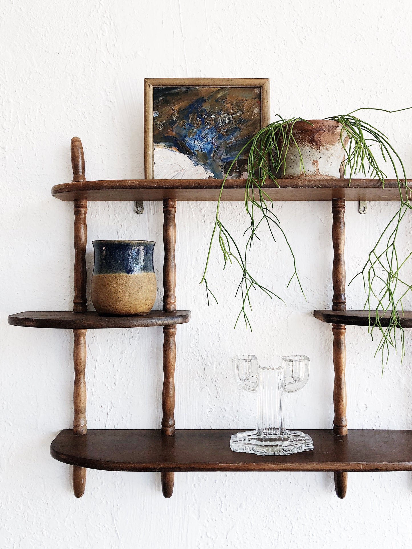 Really love this vintage multi tiered shelf. It’s just right with plants trailing over the edge, filled with oils and tinctures, or spices in the kitchen