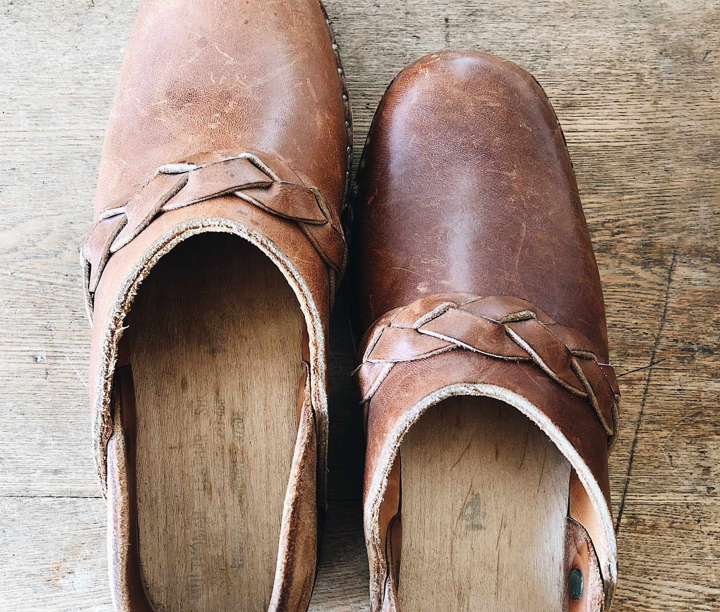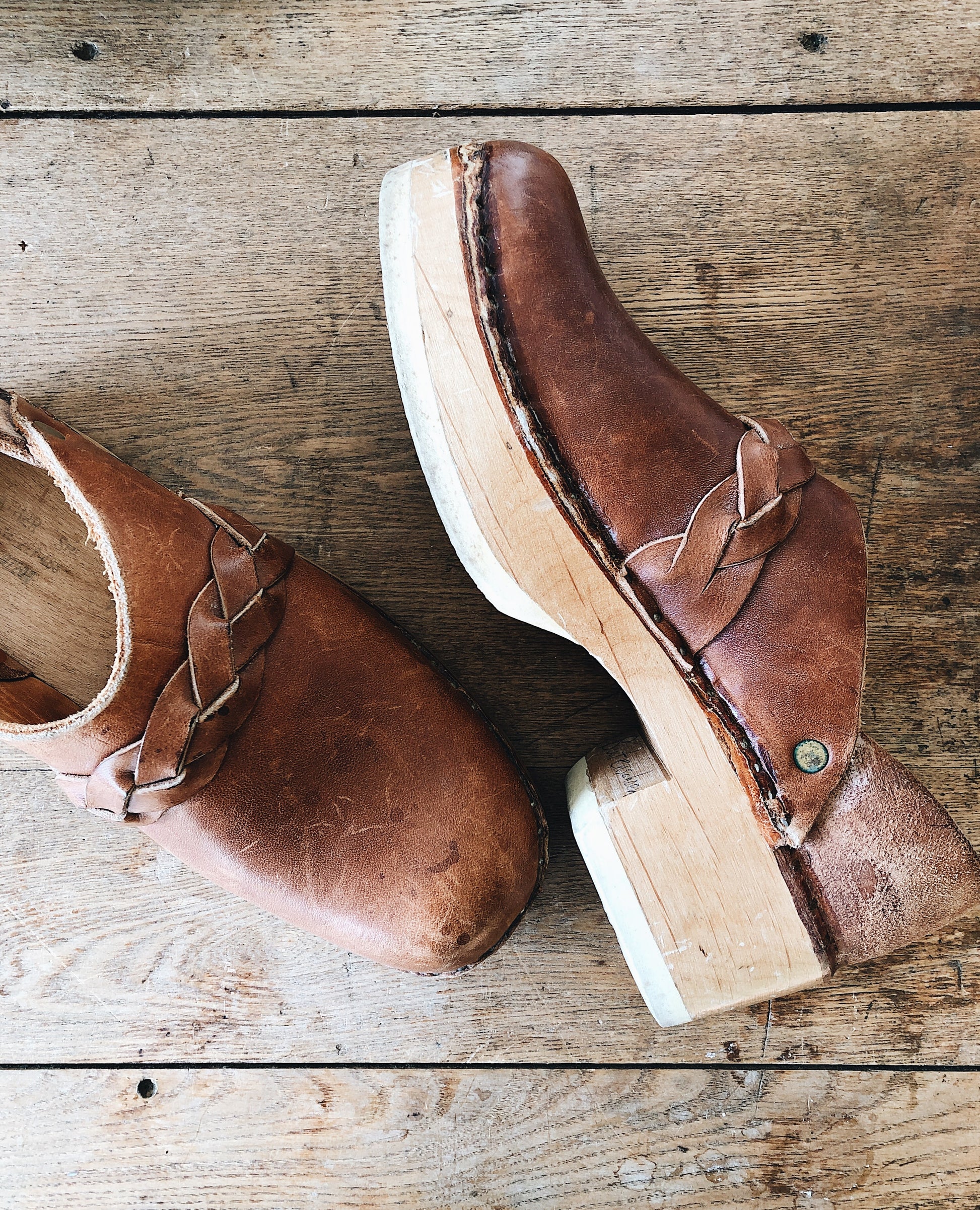 Made here in Oregon since the 1930s, Multnomah clogs are known for their custom, made to fit your foot craftsmanship. These have a caramel leather and suede heel, braided front and brass rivets. Soles are in excellent condition and entirely like new with minor scuffs to the wood