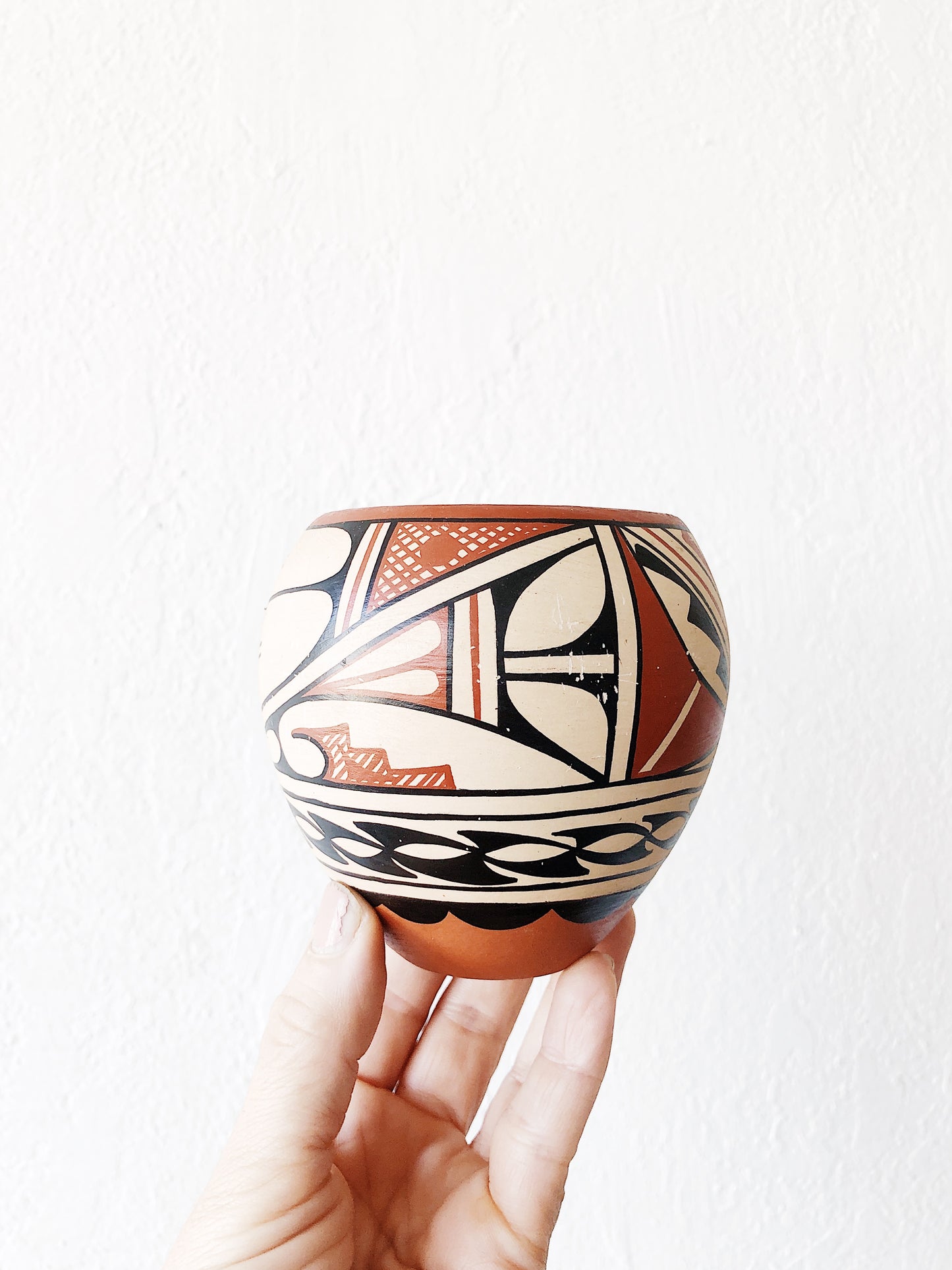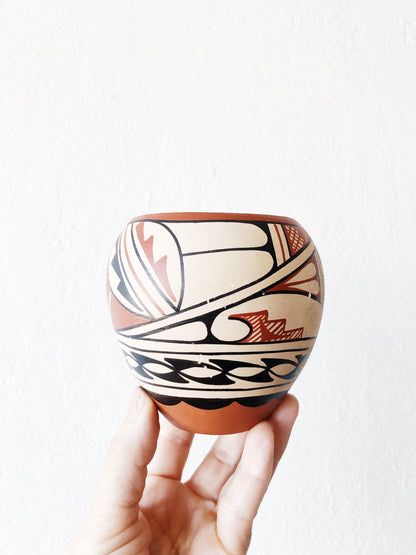 Native American pot made by Tuya Jemez, Pueblo. Coiled construction.