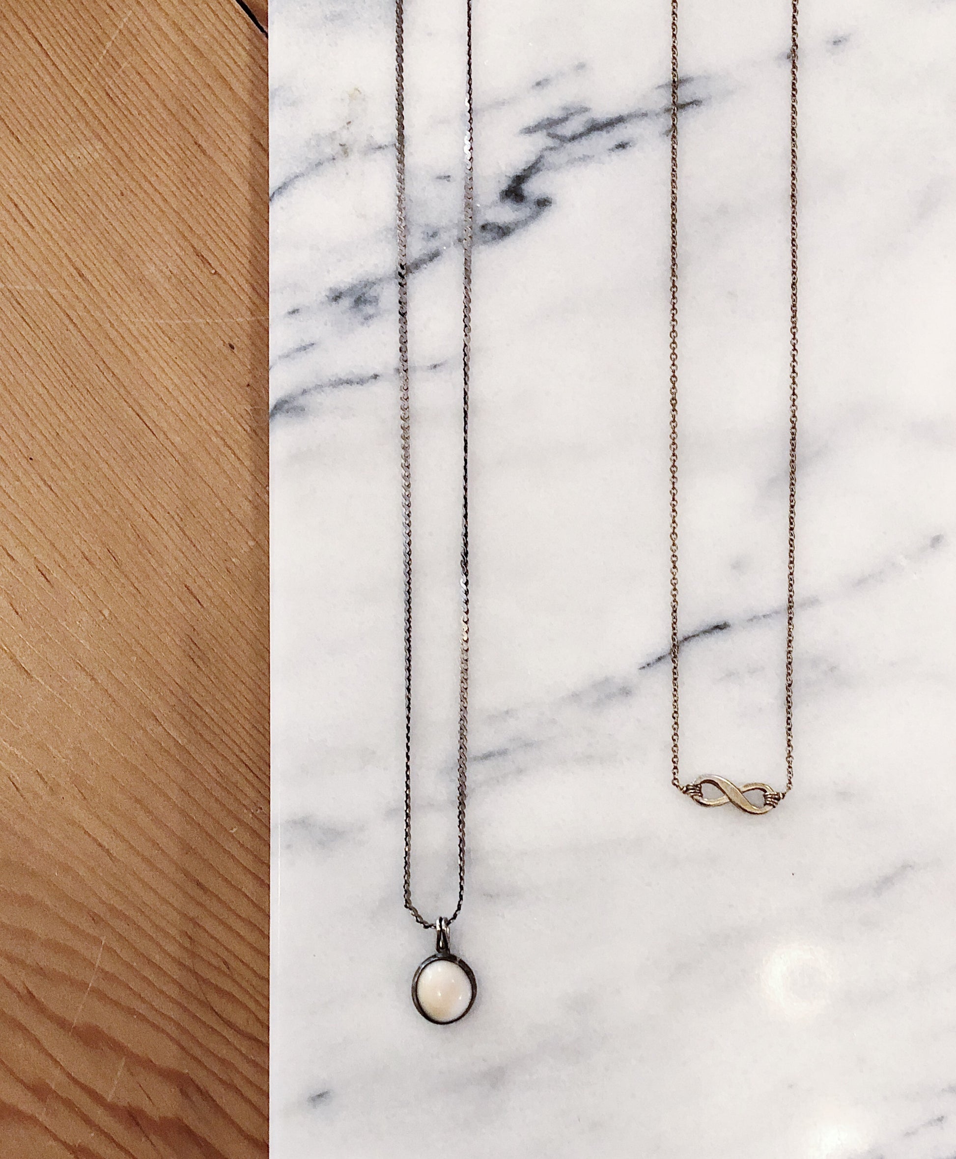 Two sweet vintage necklaces for wearing solo or layering up. One is sterling silver with an ivory charm, the other is gold infinity