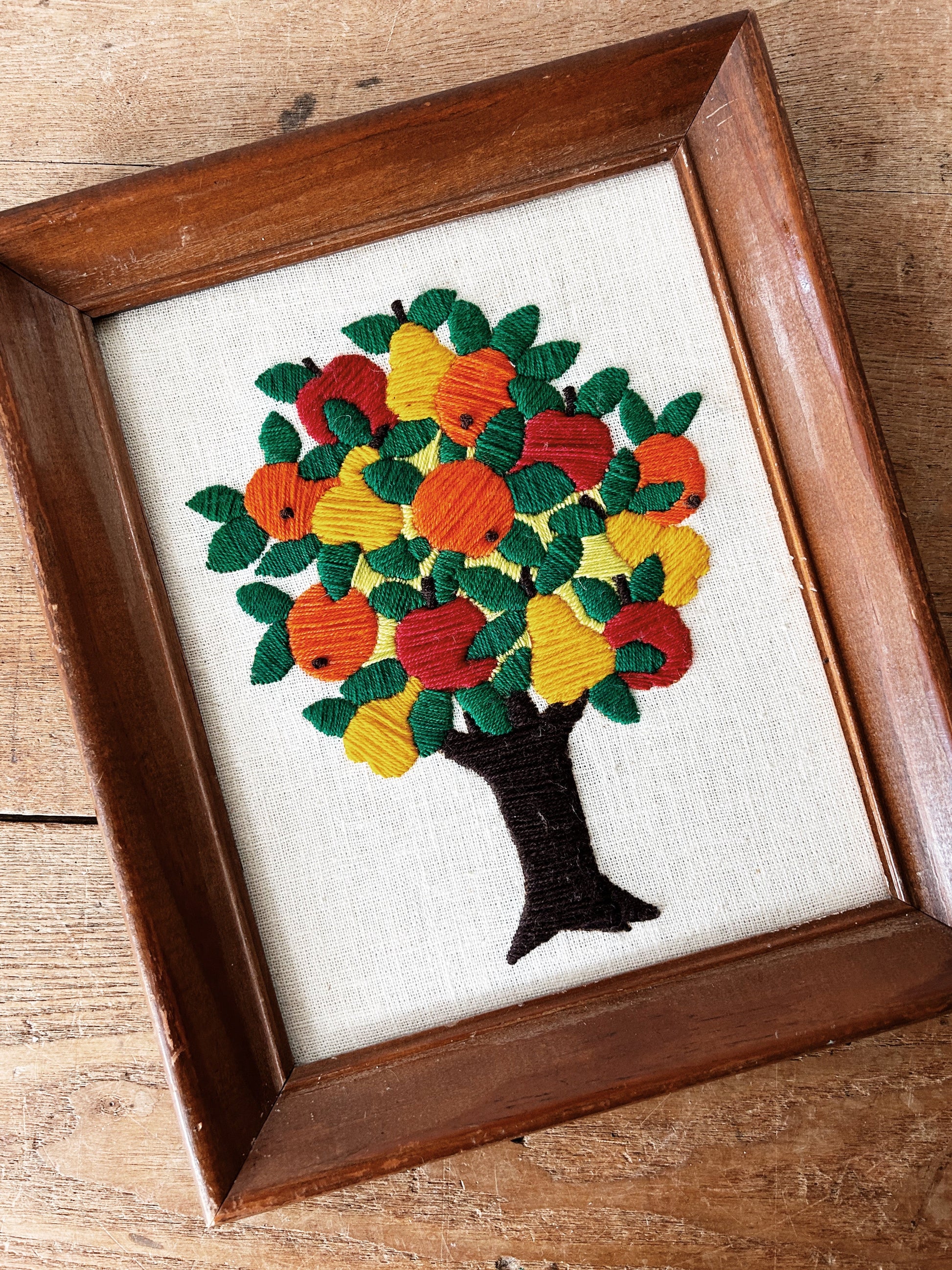 Wonderful crewel fiber art piece in vintage wood frame. A fun one with pears, apples and oranges 🥹