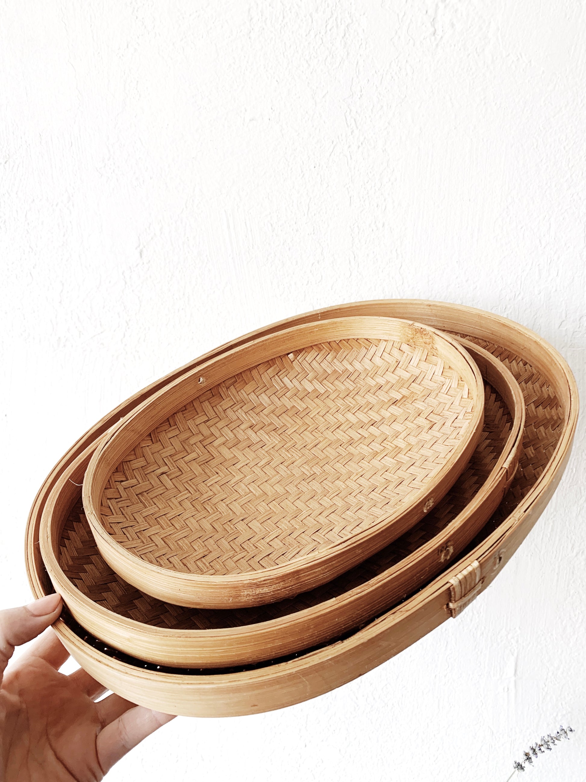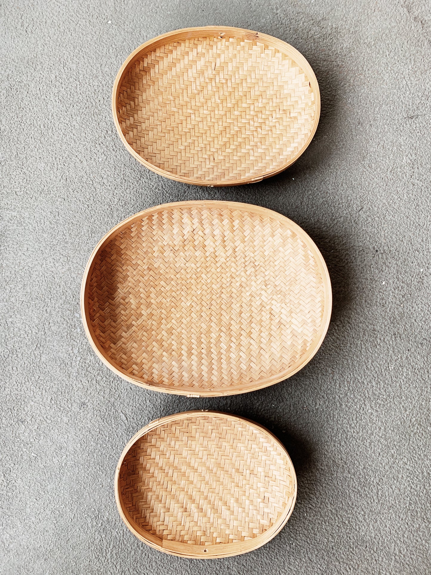 A set of three bamboo woven nesting baskets in excellent condition. 10-14”/ 3” deep