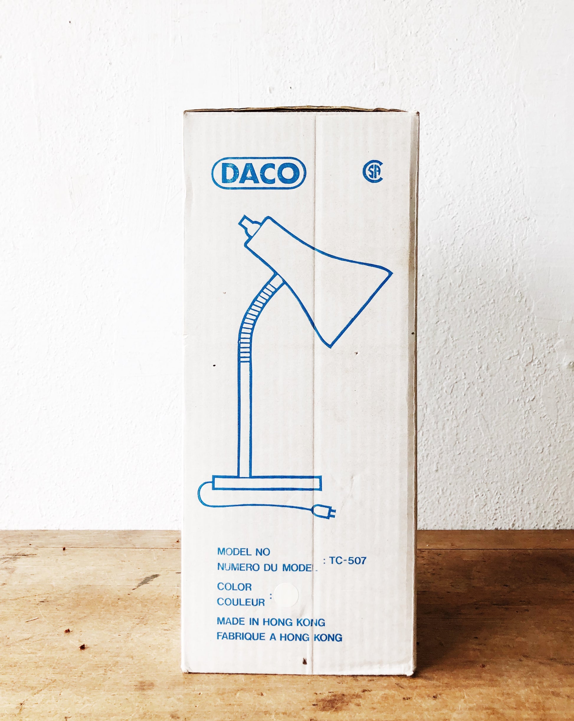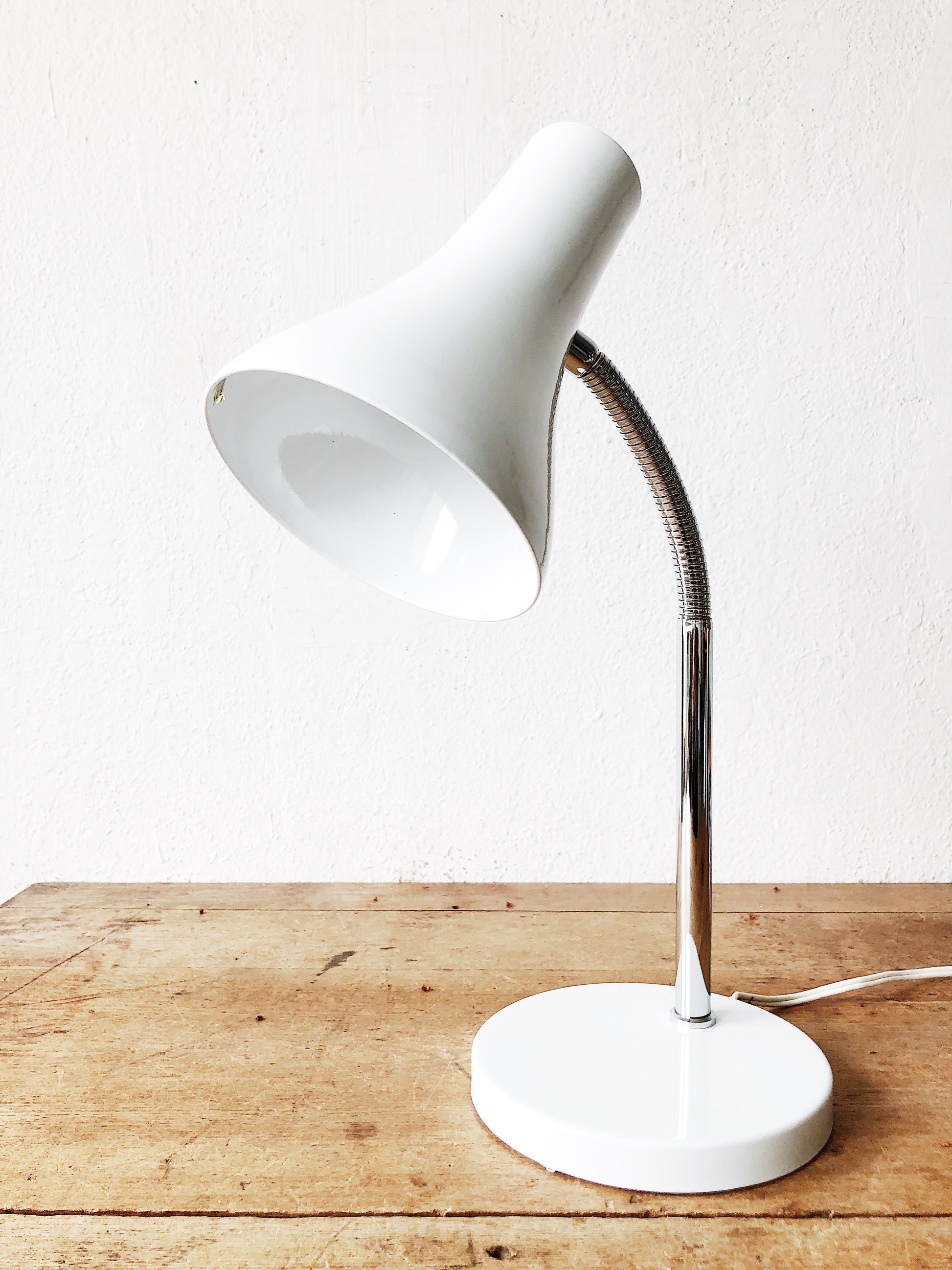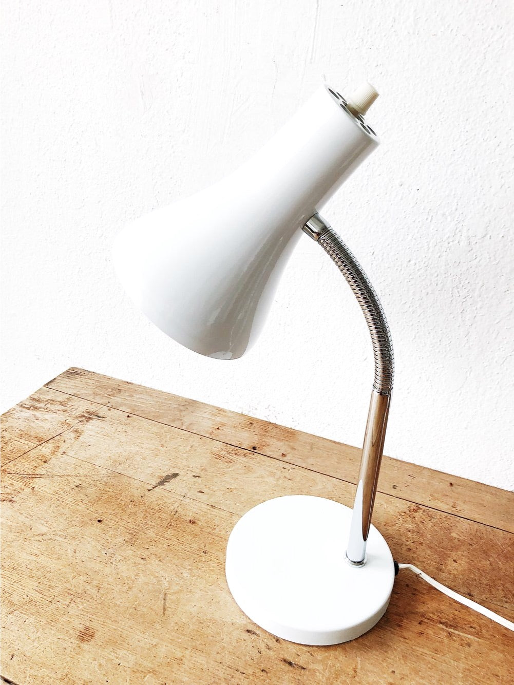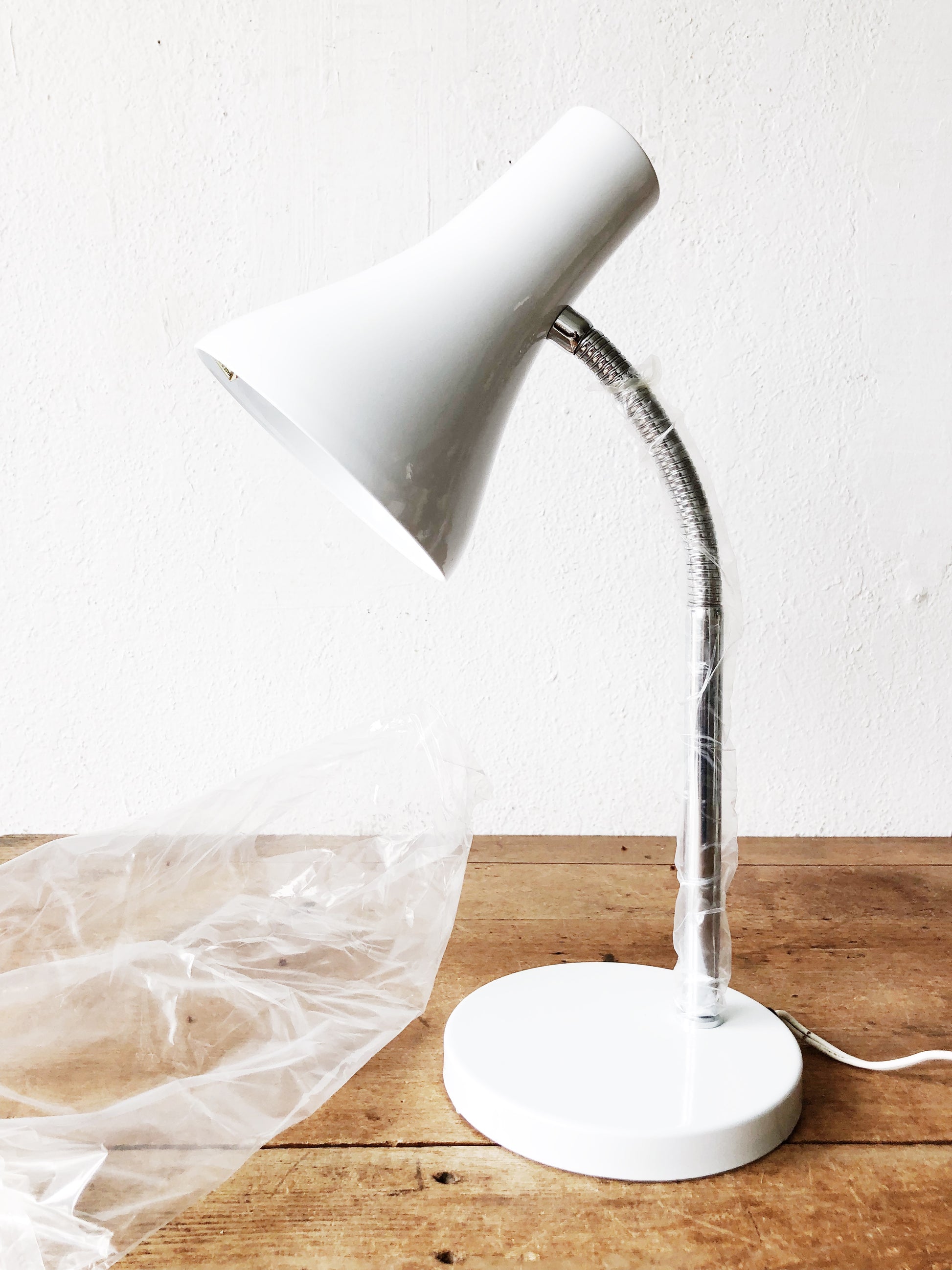 Even had to unwrap this baby! Rare Deadstock NIB daco desk lamp in white enamel with chrome. Adjustable goose neck