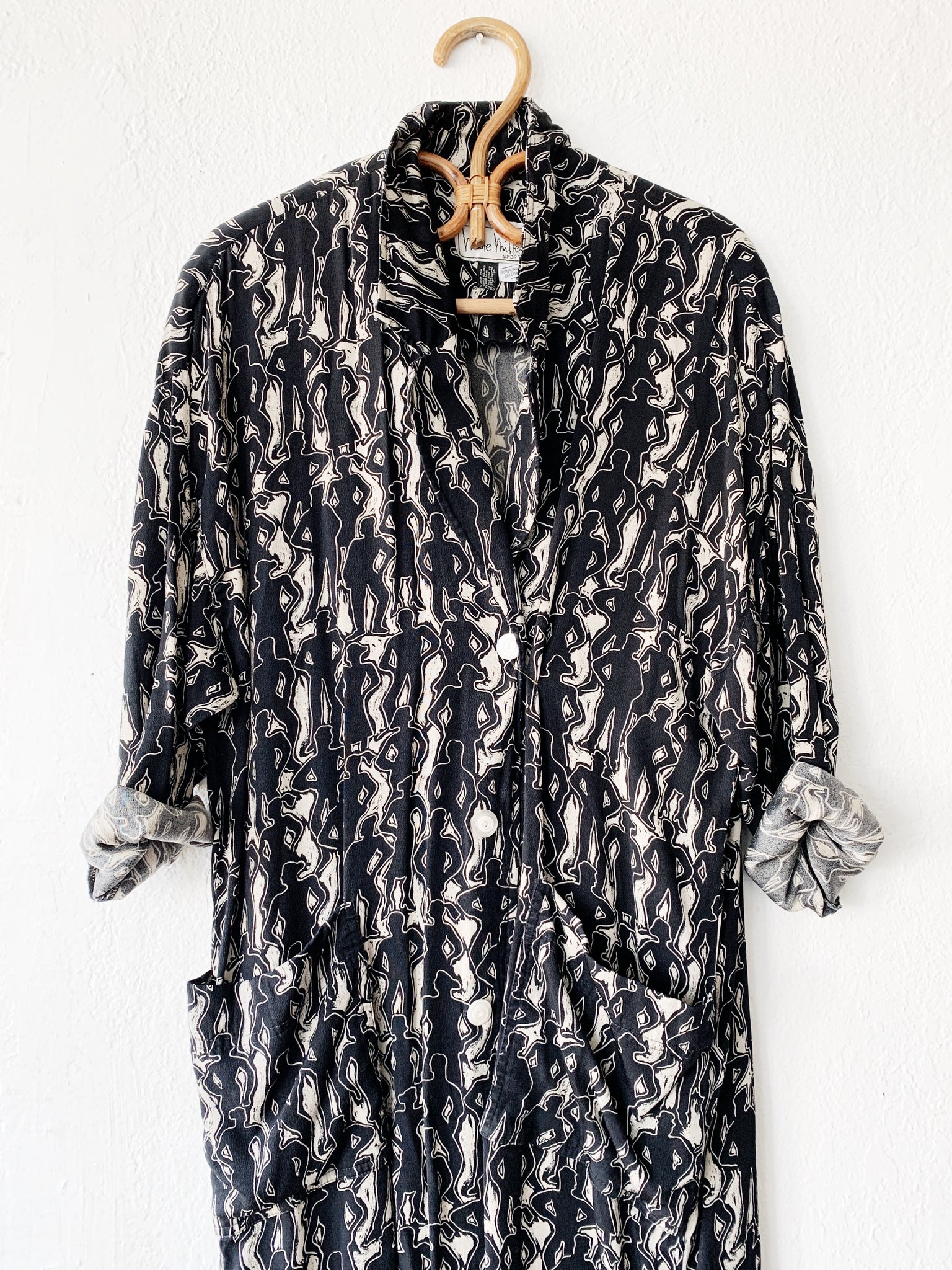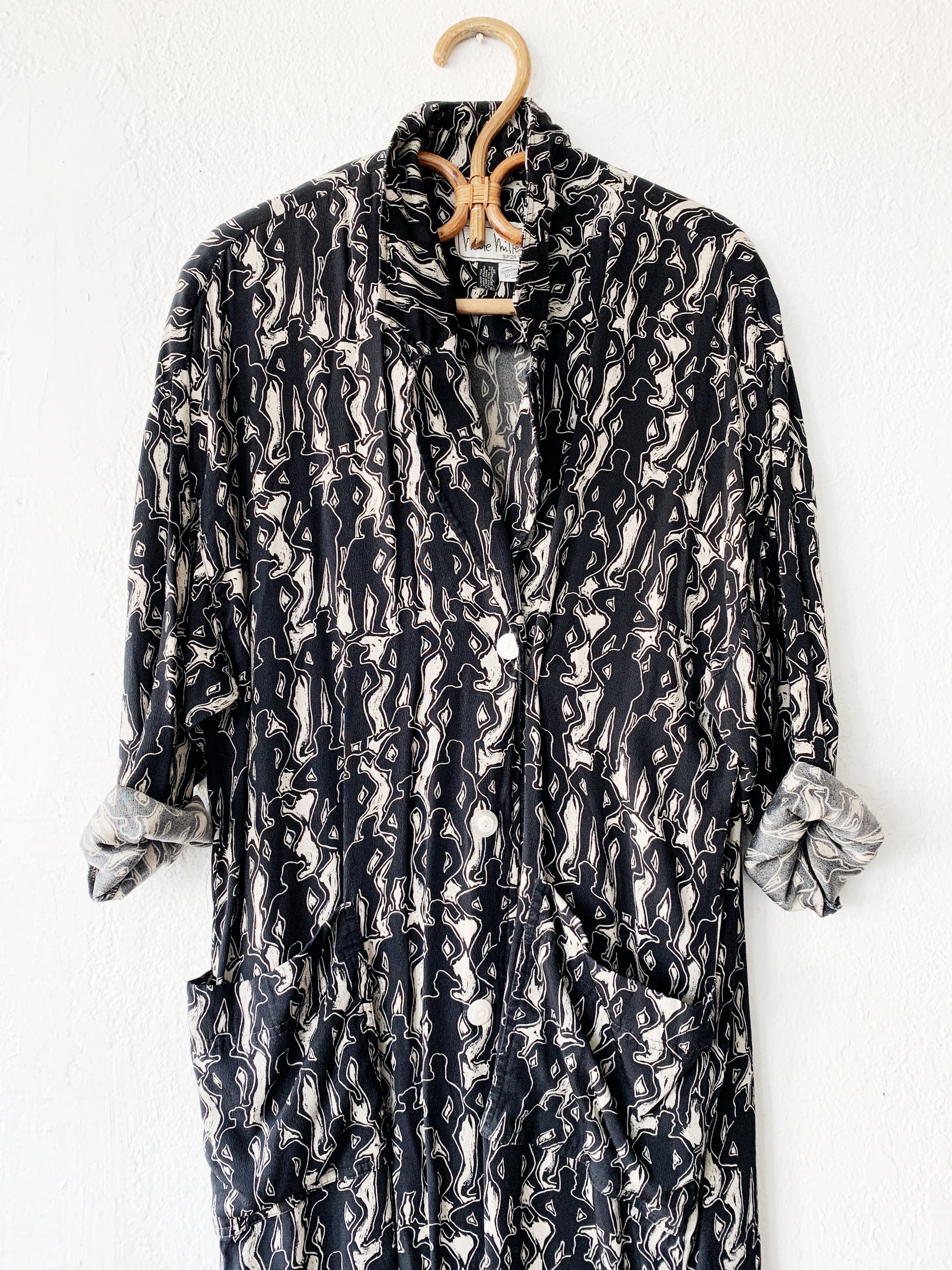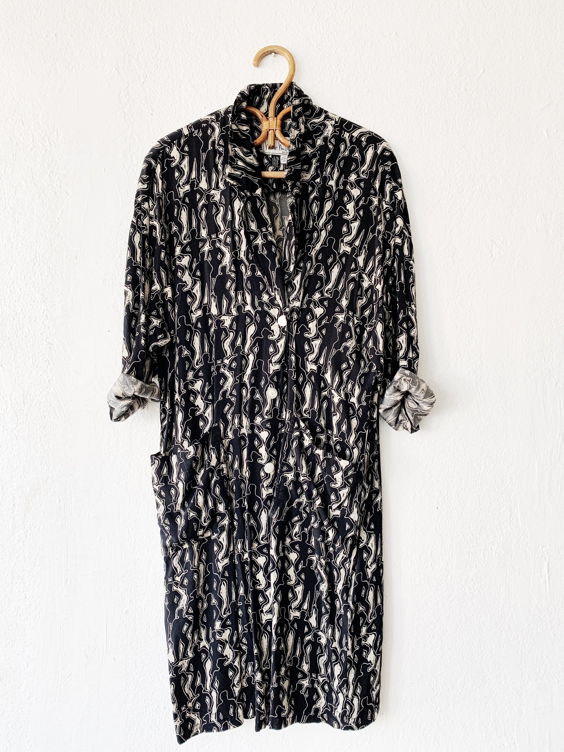 Vintage Nicole Miller dress with the most fabulous people print and front patch pockets. Rayon, Draper and soft and so fun to wear. Looks great cinched with a skinny belt. Size M/L