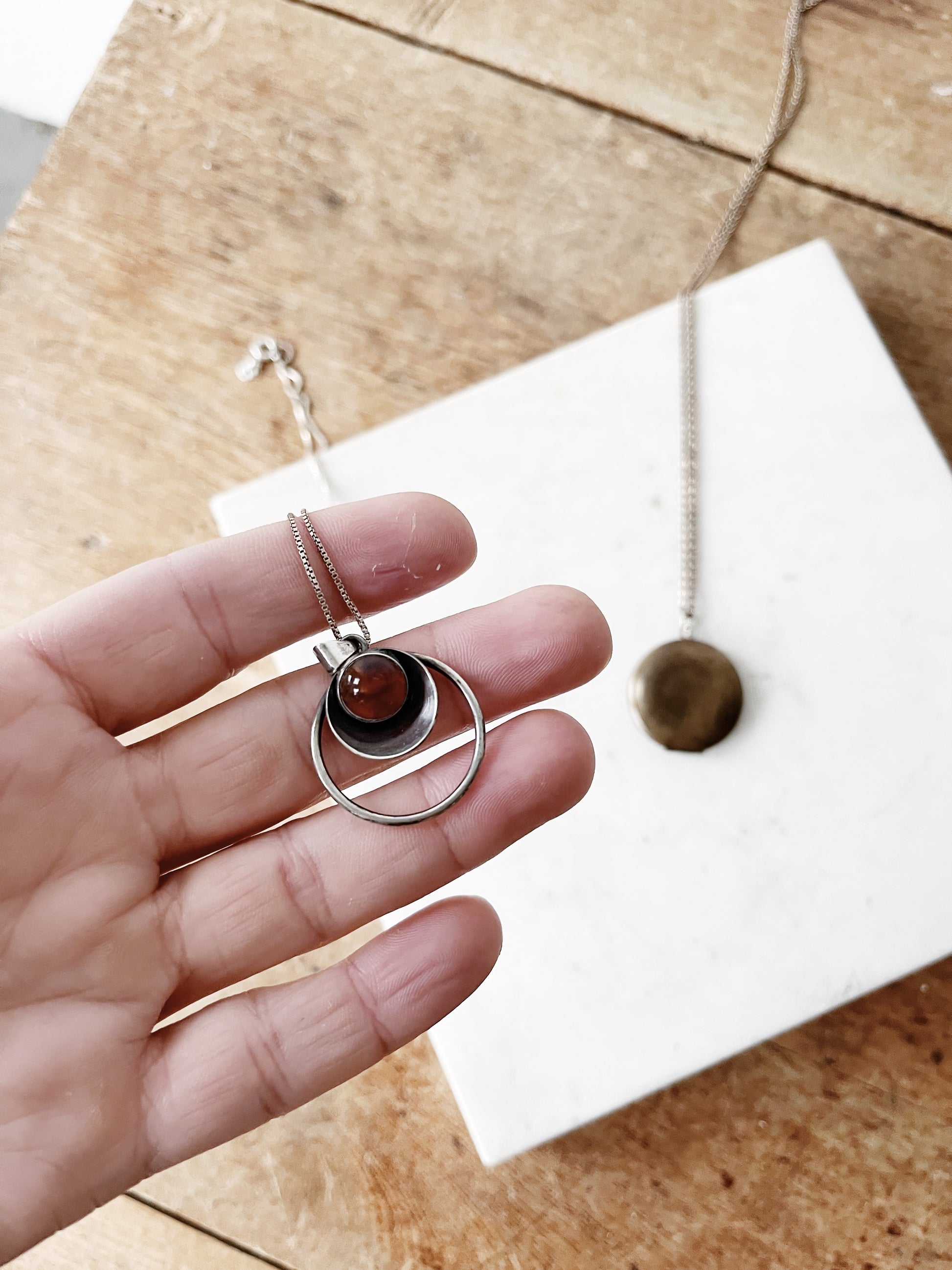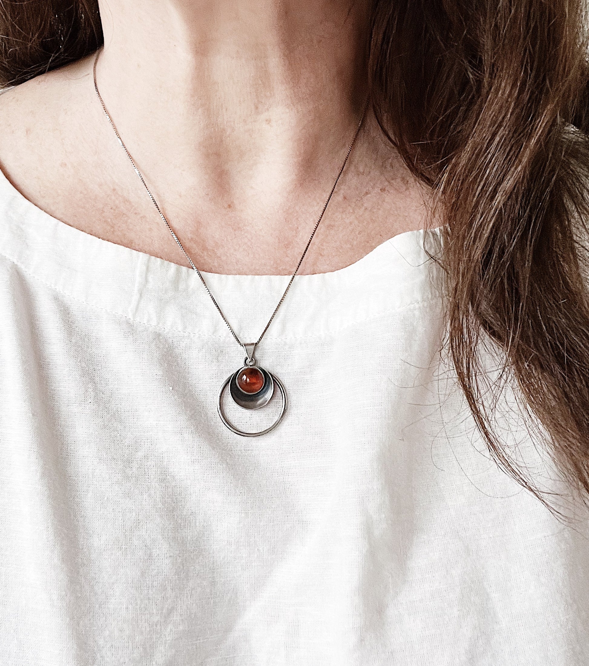 Scandinavian Modernist pendant from Niels Erik From, Denmark. Amber stone. Sterling silver, marked. Box Chain is made in Italy, also Sterling.