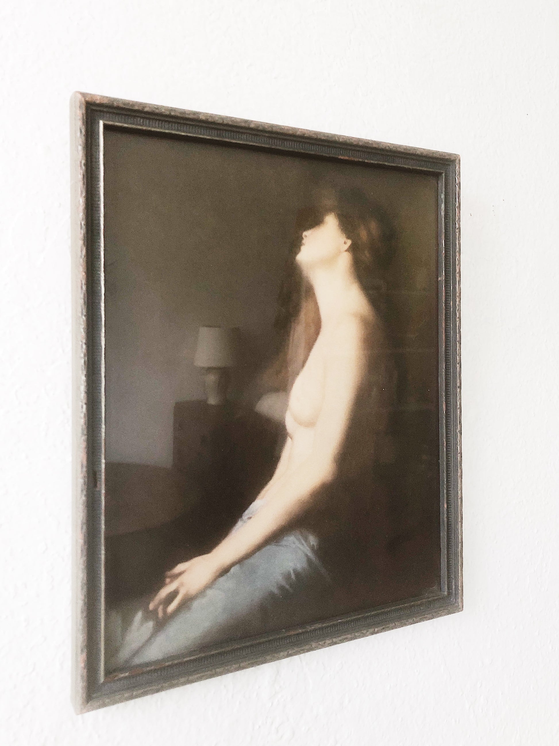 A beautifully serene nude litho, framed in vintage wood under glass. Dark and moody