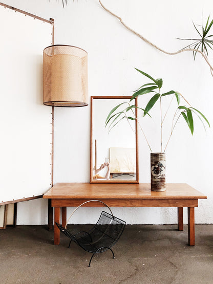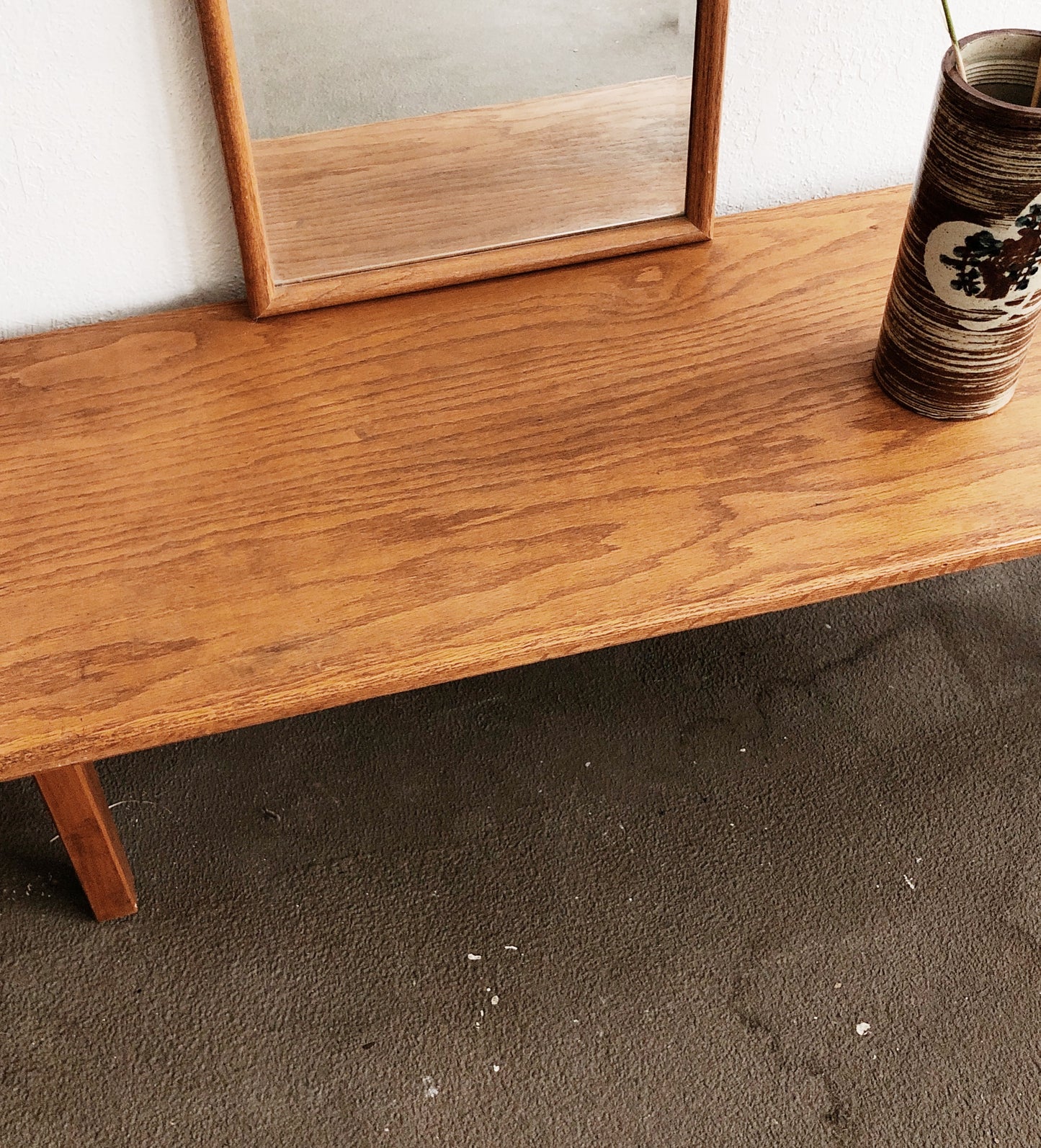 Simple and solid oak bench or coffee table. Nice leg and apron detail giving it a semi primitive look. Put a few flat cushions for a low bench or full her up with plants under a big window