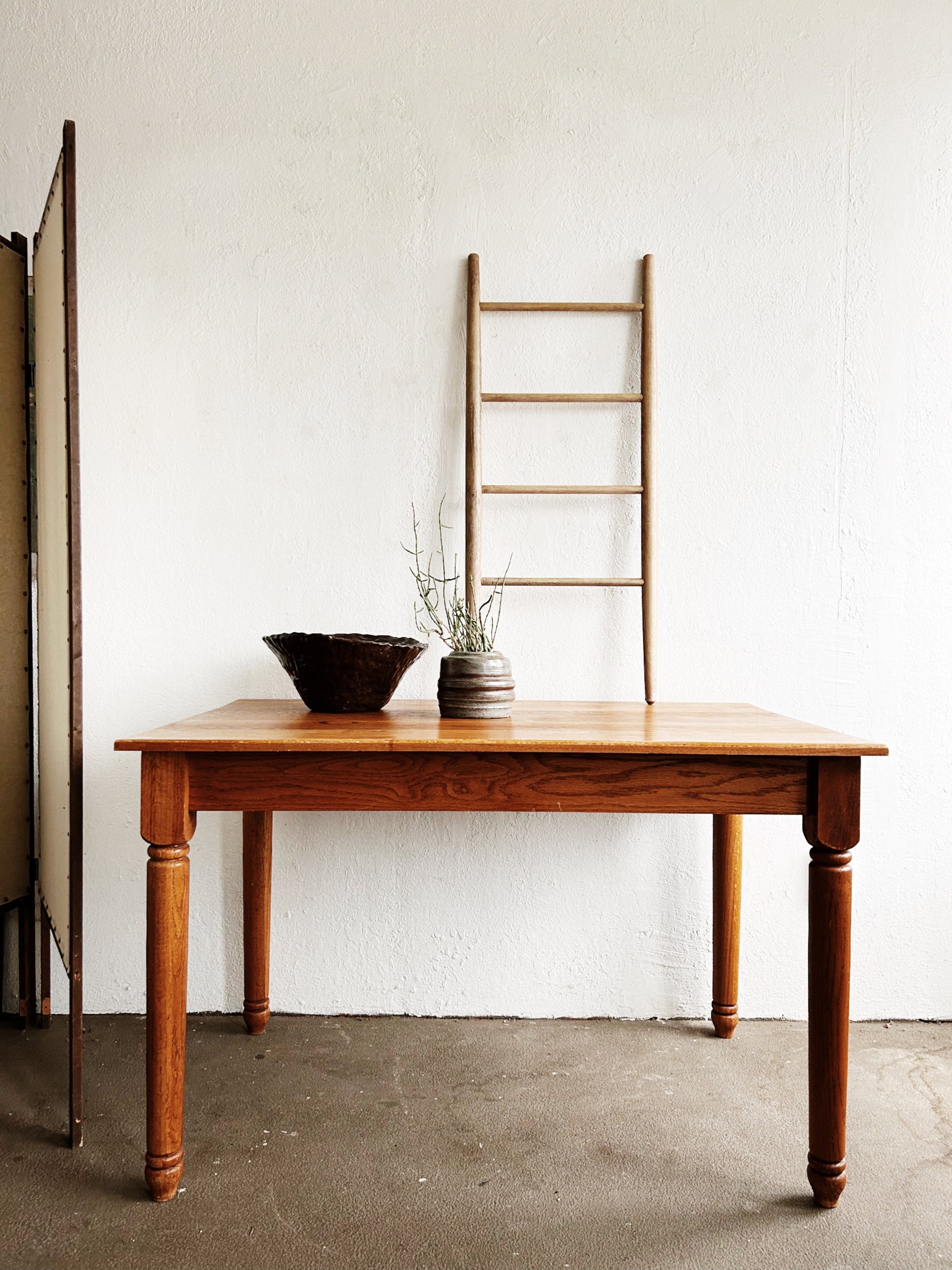 a nice and solid vintage oak dining table or desk in the farmhouse style. Super sturdy and in nice shape aside from some surface markings to the top.