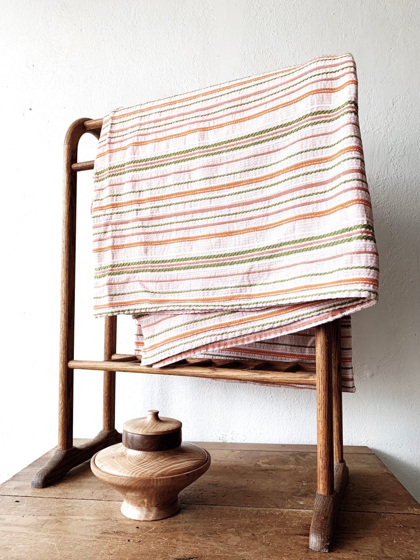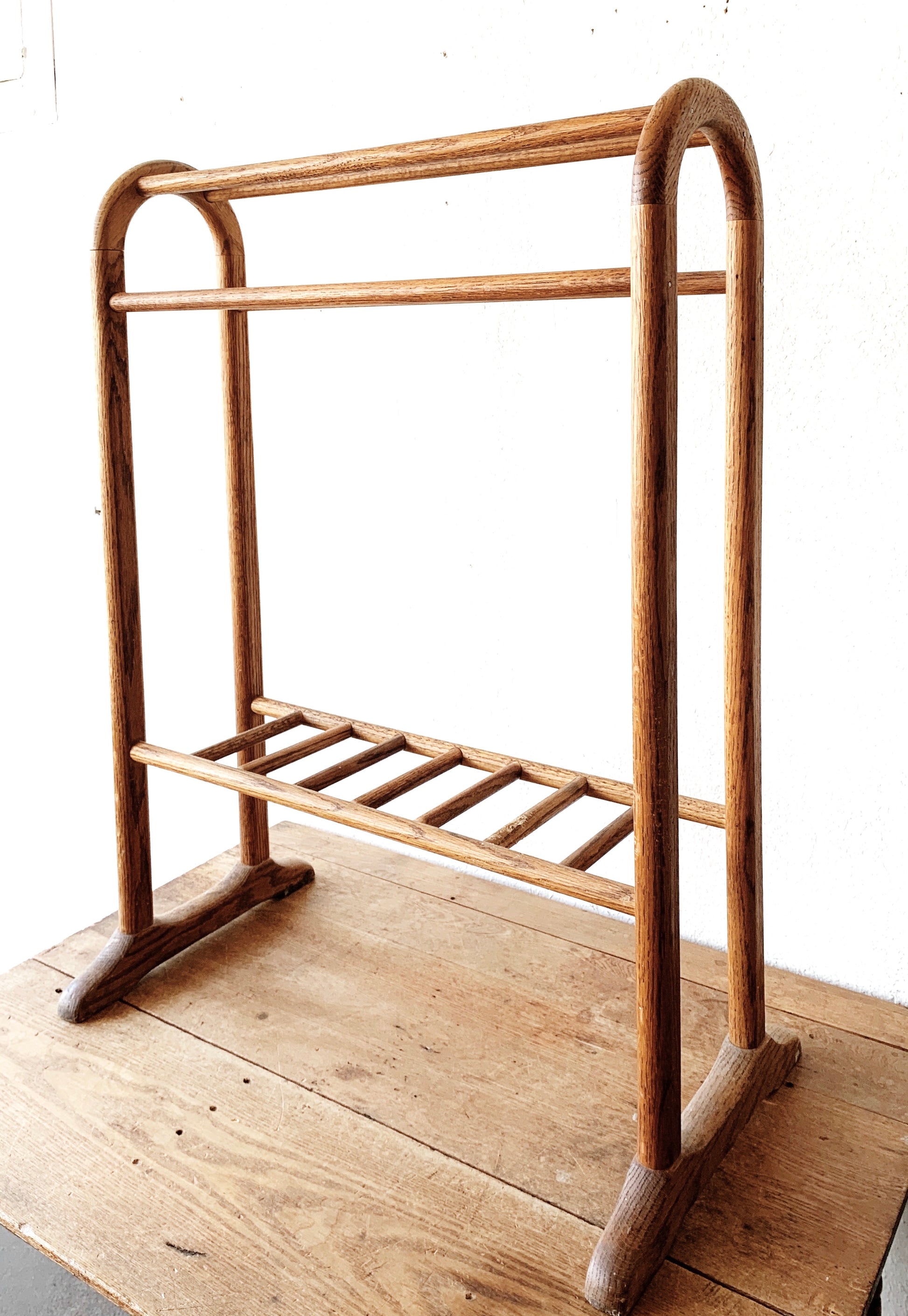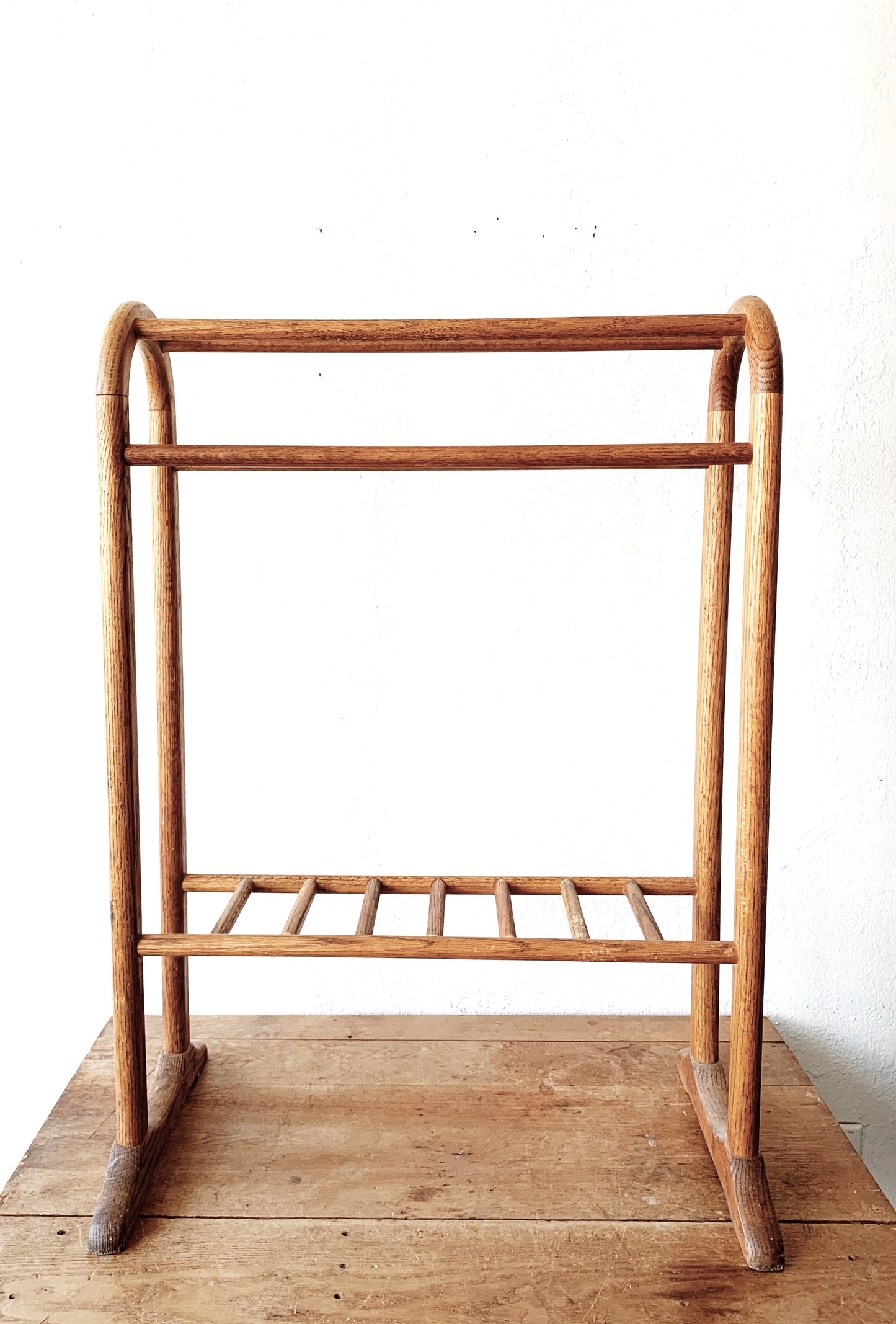 Nice old oak quilt stand with slatted shelf. This works well in the bathroom too. In good shape overall, some marks here n there, priced accordingly. Charming piece!