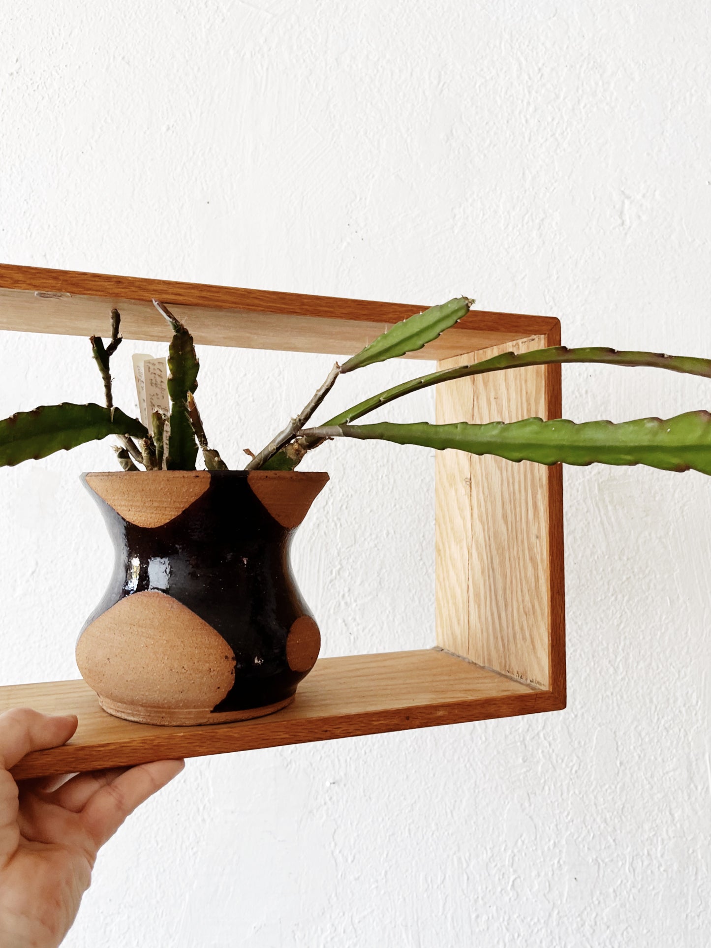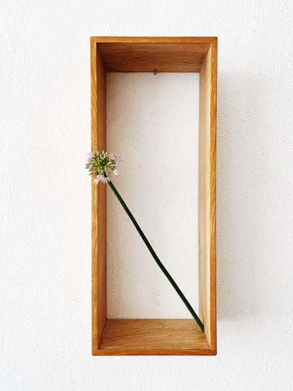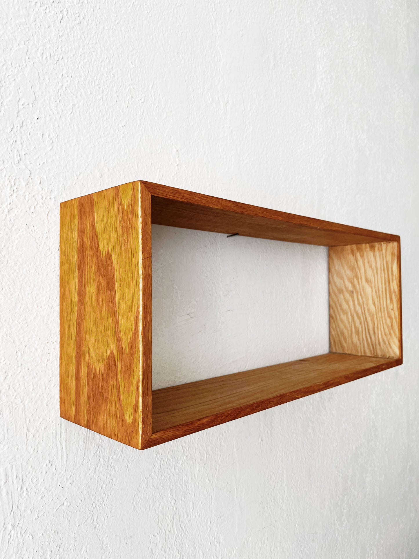 Nice simple oak shadowbox shelf. This will need a hanger or support bracket from below but we didn’t want to add anything since this can be used in multiple orientations. Nice condition