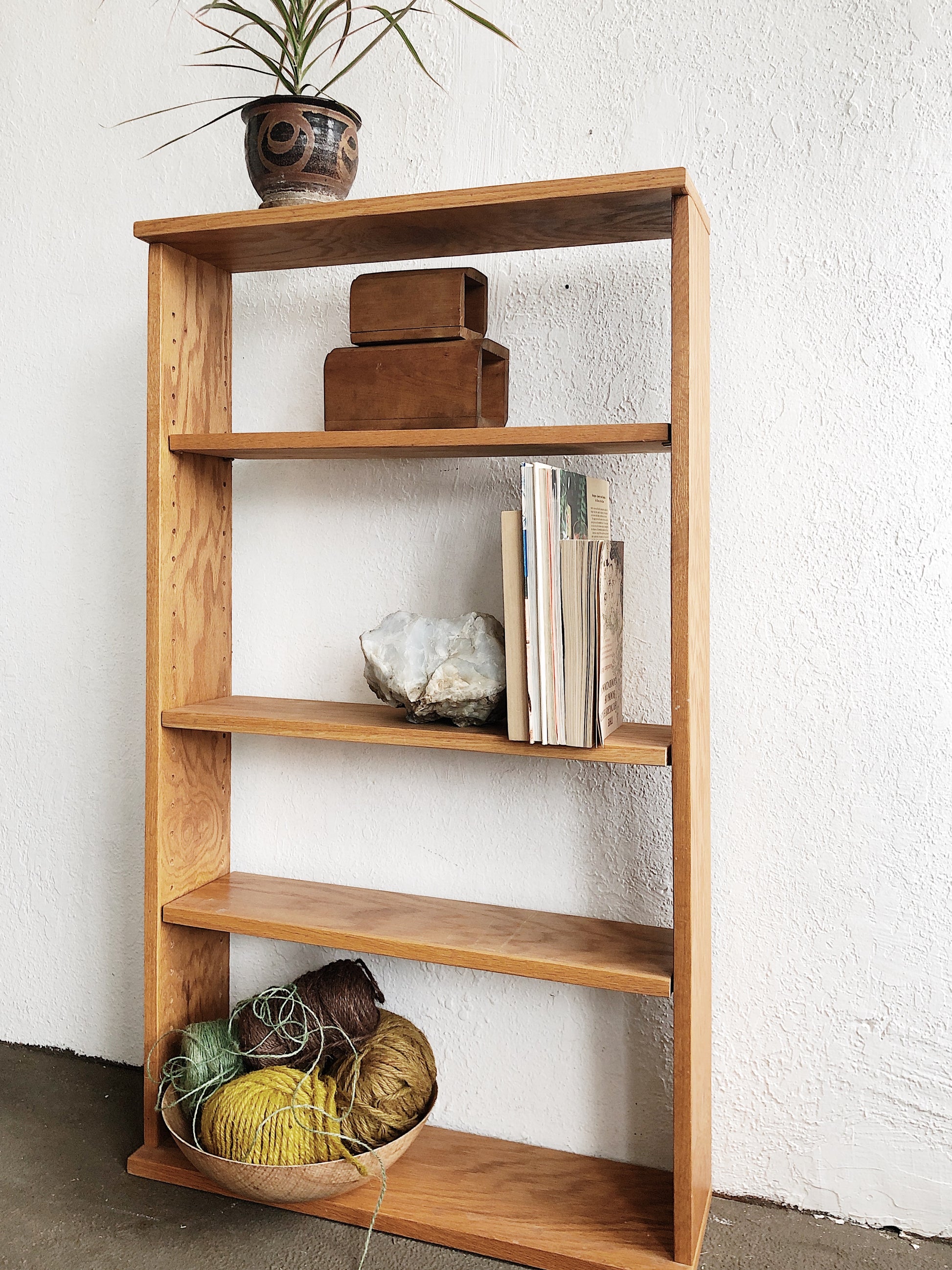 Nice vintage oak simple shelf with six adjustable shelves. Can be used on the floor or hang with brackets you provide. Top and bottom detail. In excellent condition.
