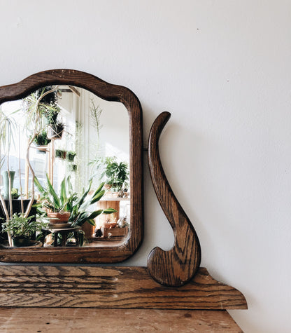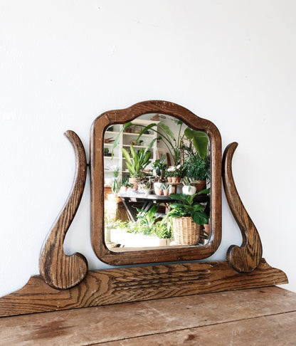 Vintage oak mirror Originally from a dresser or washbasin. The mirror hinges on dark worn brass and atop a carved wood base. Lovely!
