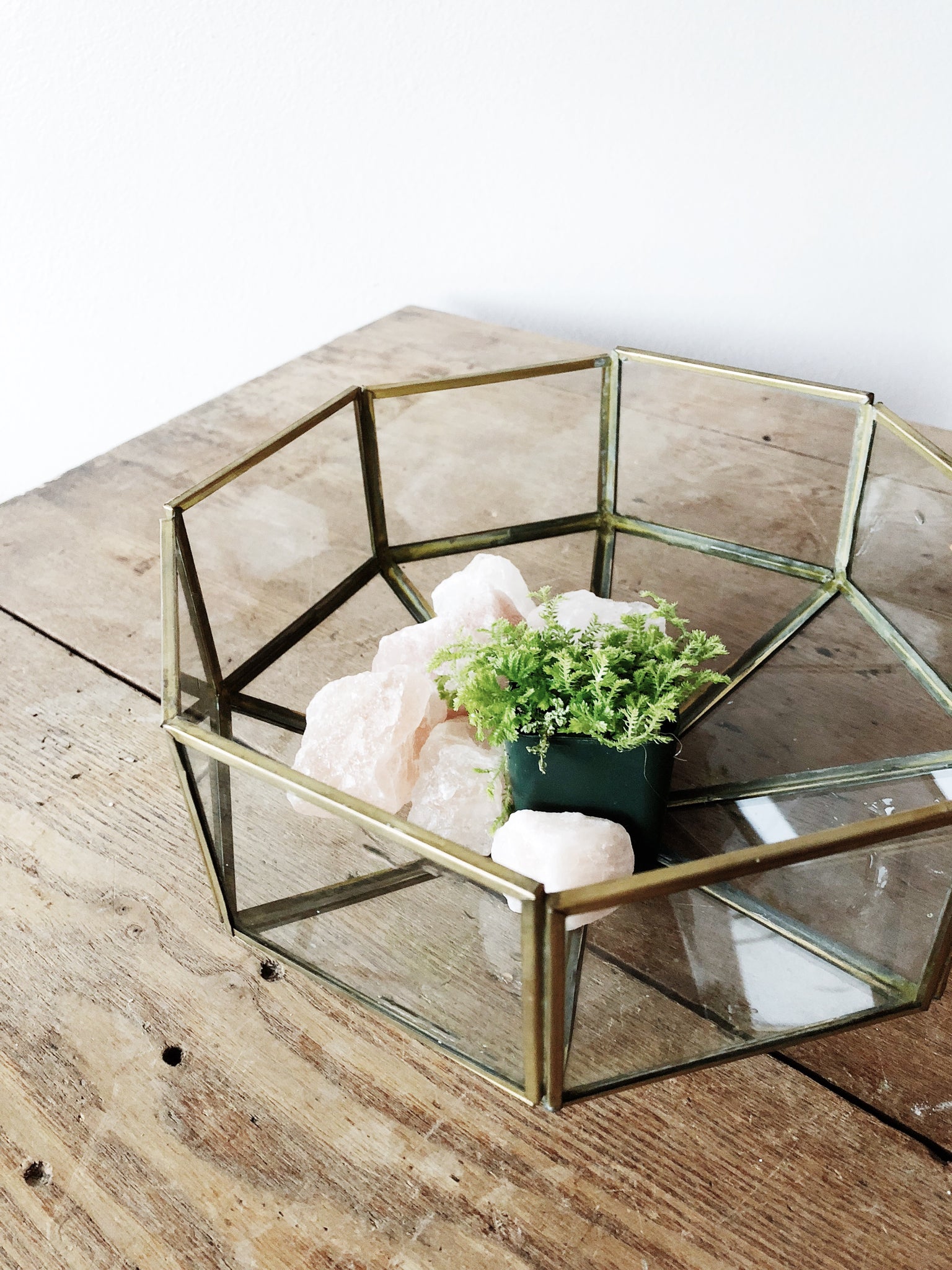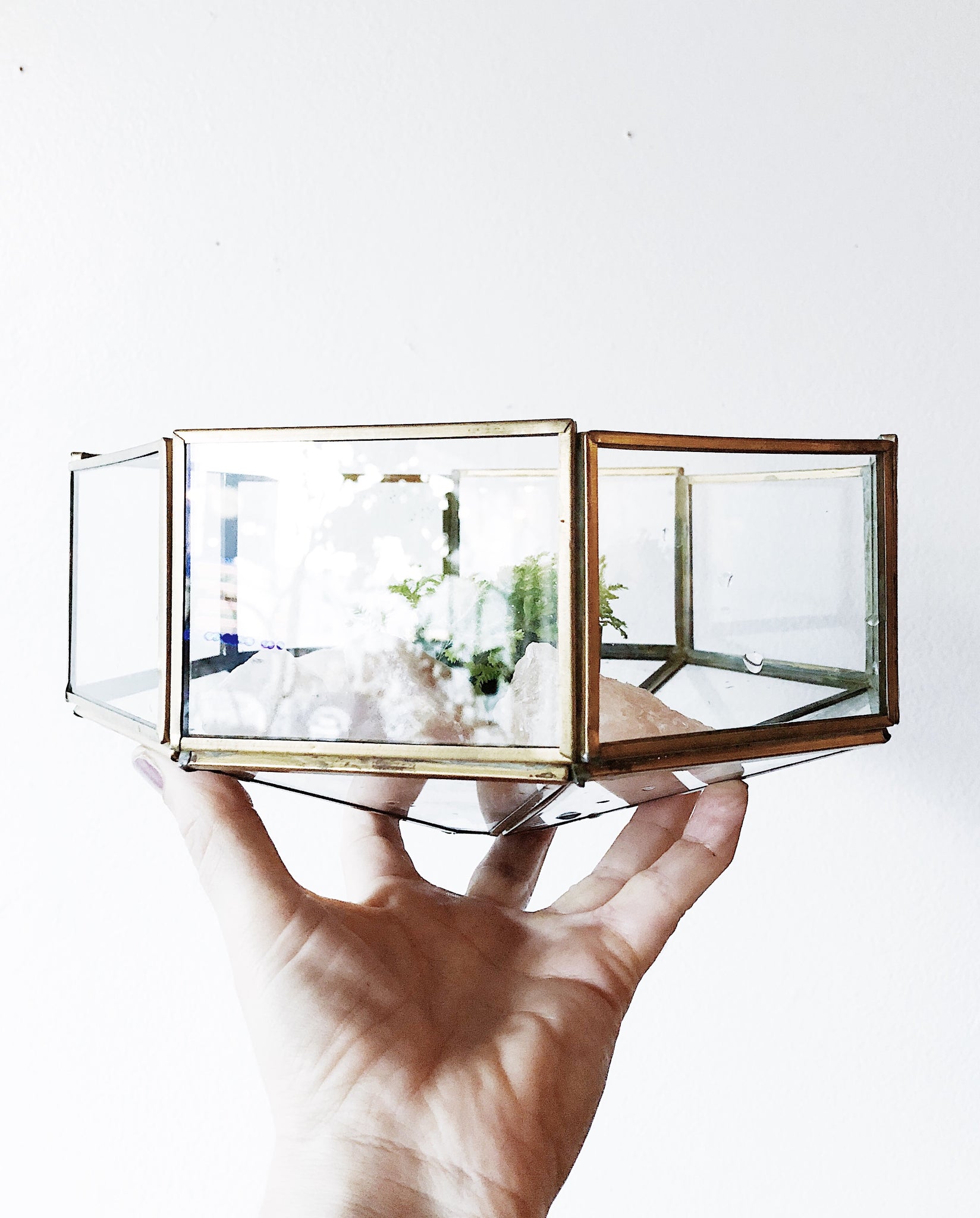 A beveled glass and brass terrarium in an octagon shape. Central drainage is adequate for both germs and cacti or succulents.