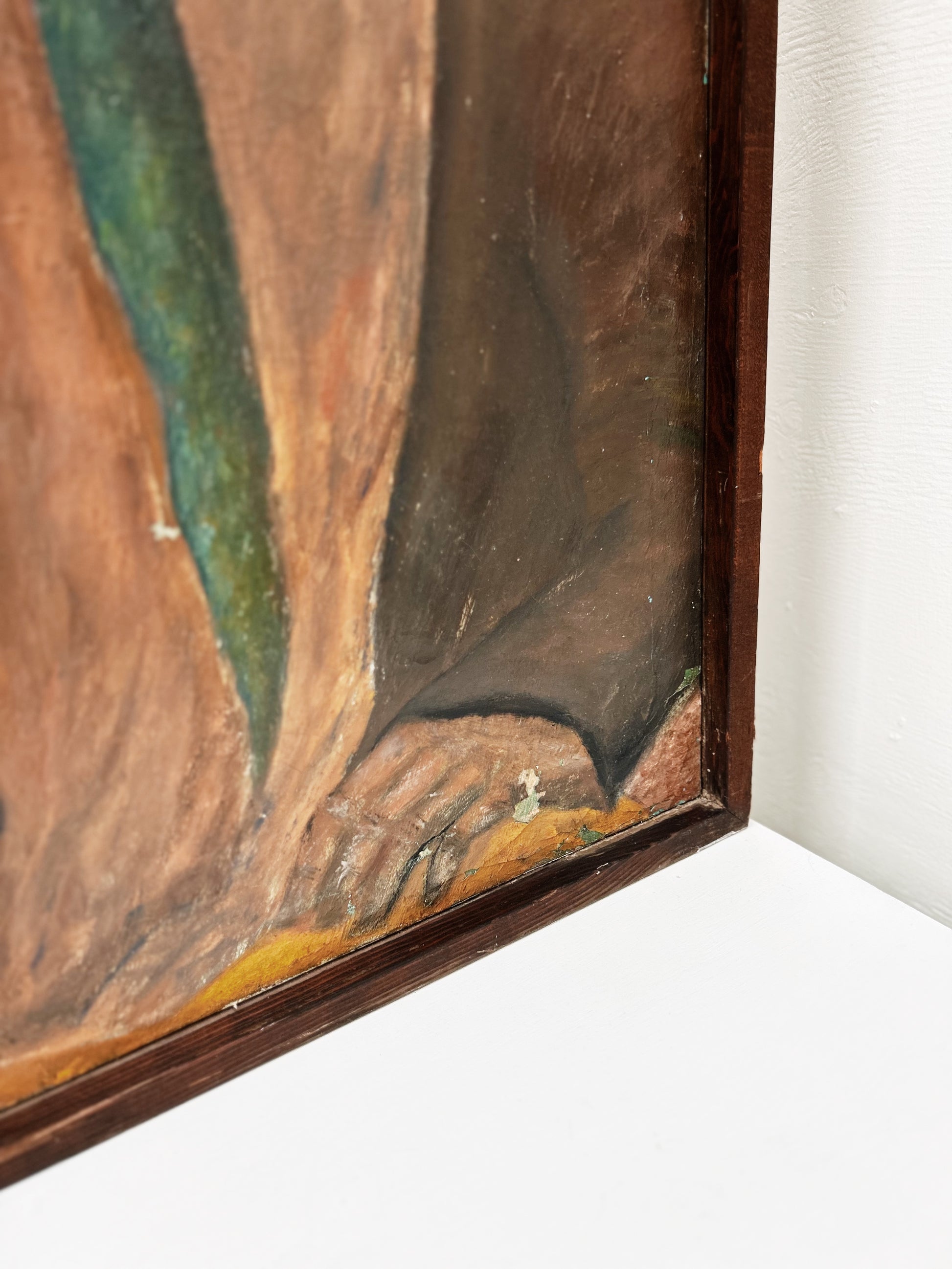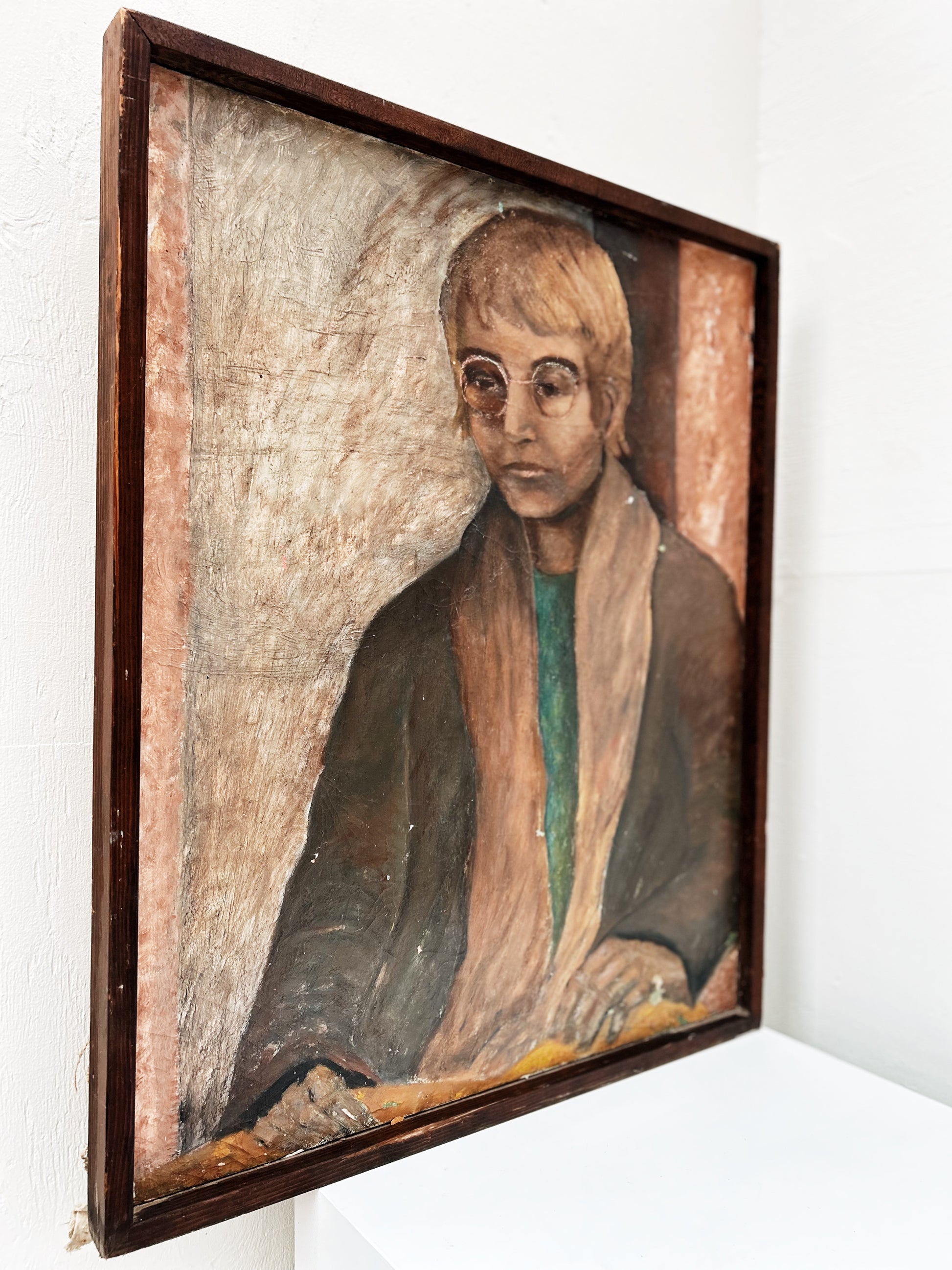 Wonderfully rendered portrait in oil on old linen. Reminds me of a college art professor I once had. Contemplative study. Some wear to the surface makes this aged and lovely. Framed in simple wood.