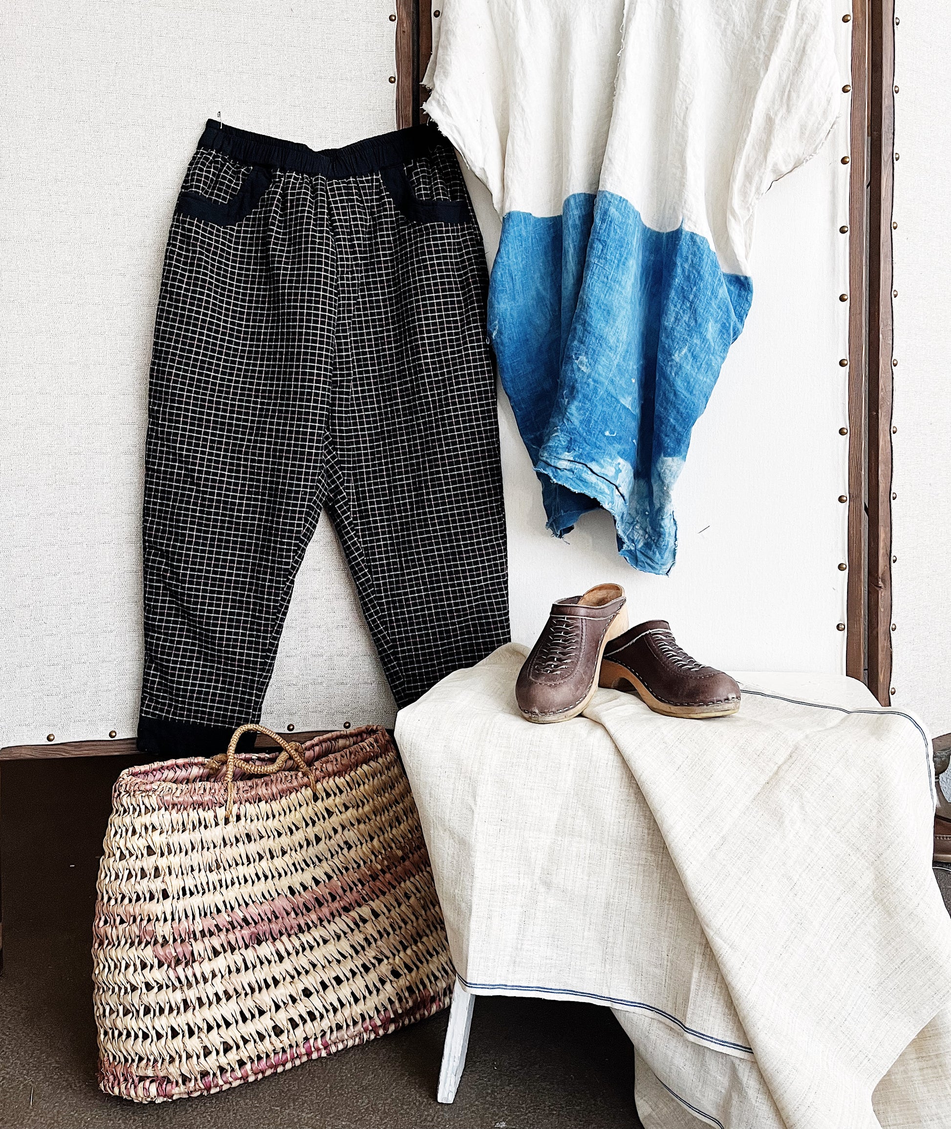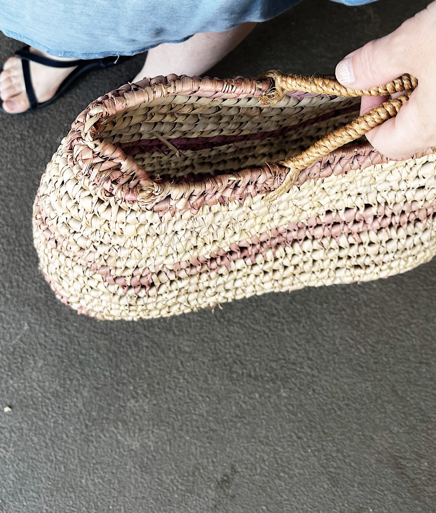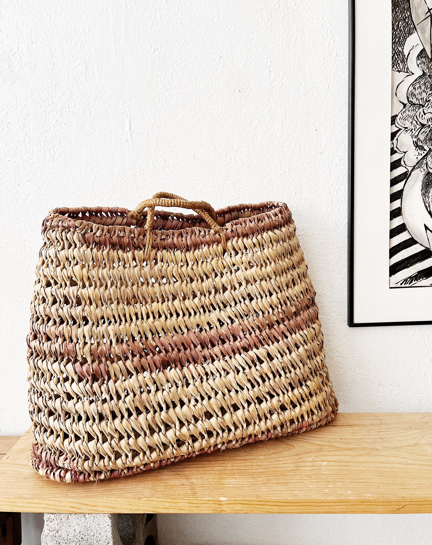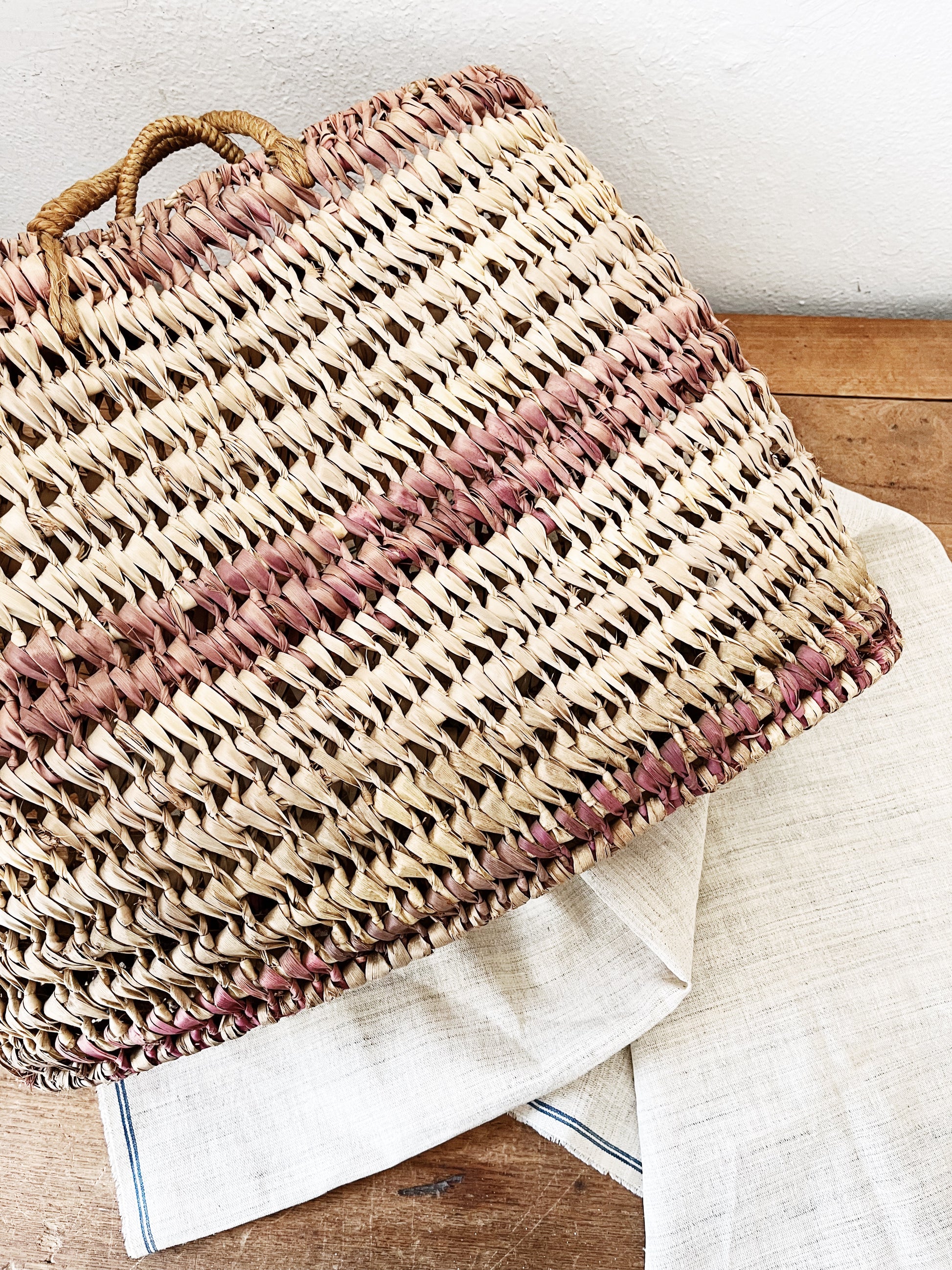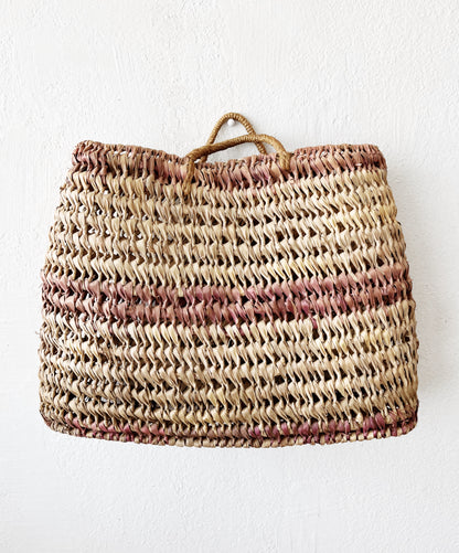 Nice straw tote with natural and plum colors. Small little handles and a sort of trapezoid shape. Great for beach and river trips or just storing things in view